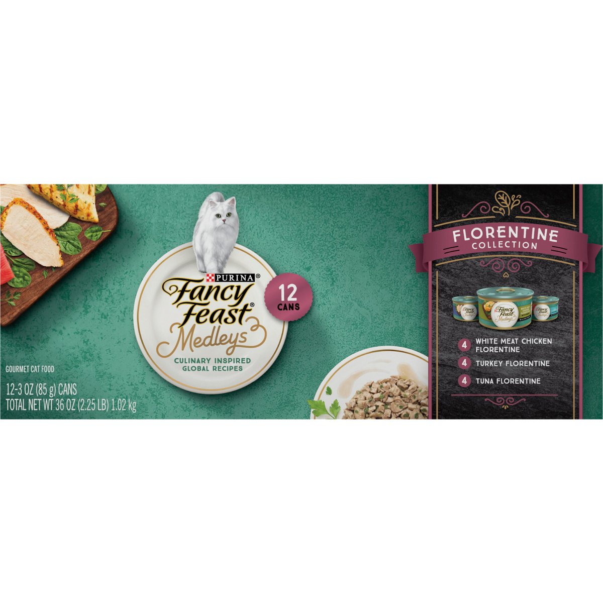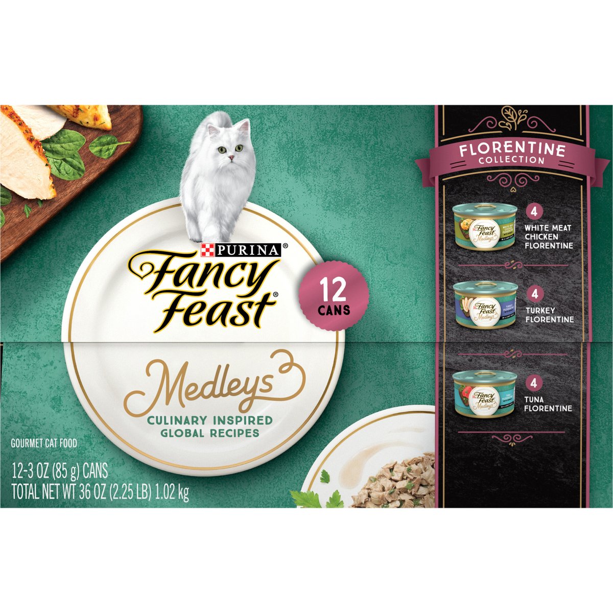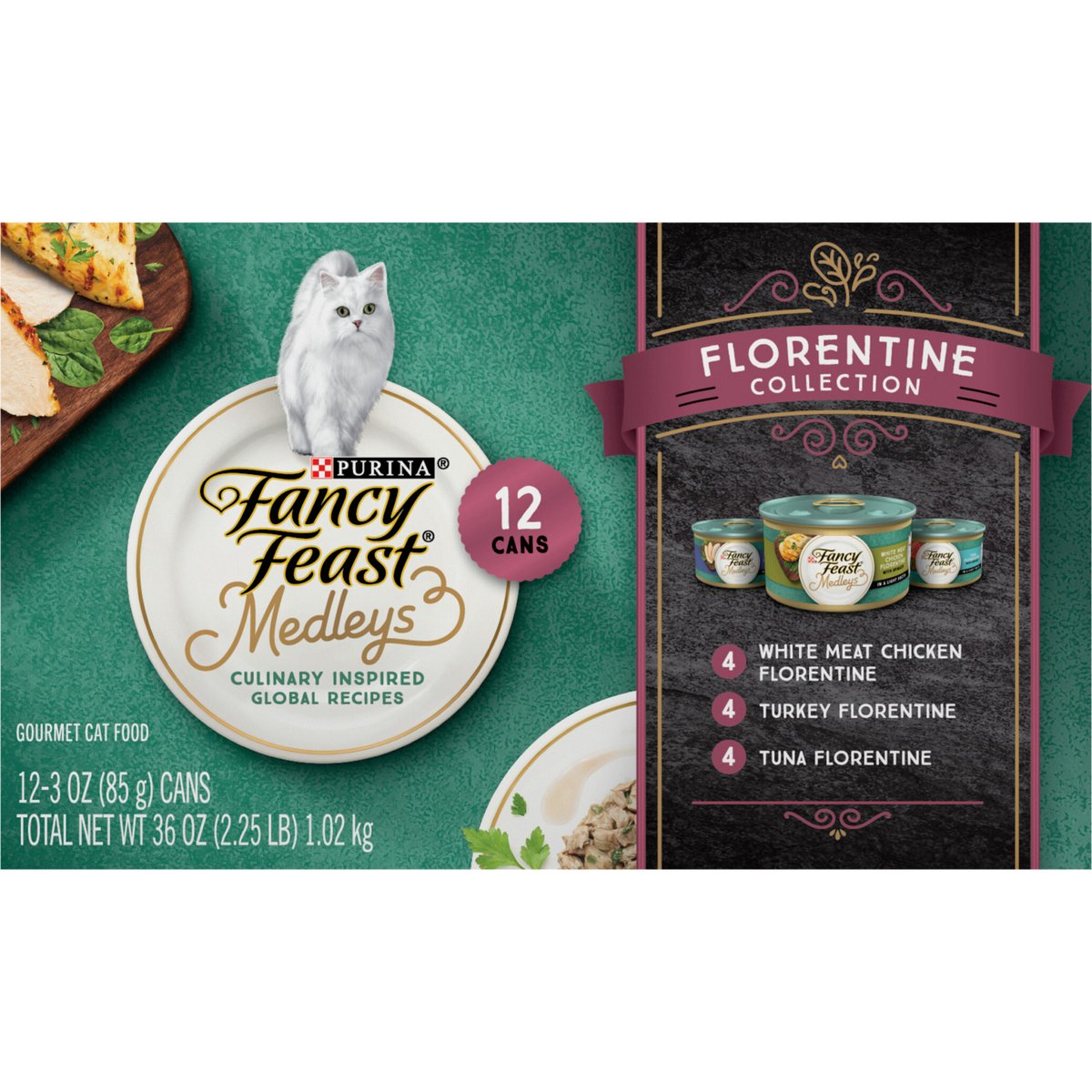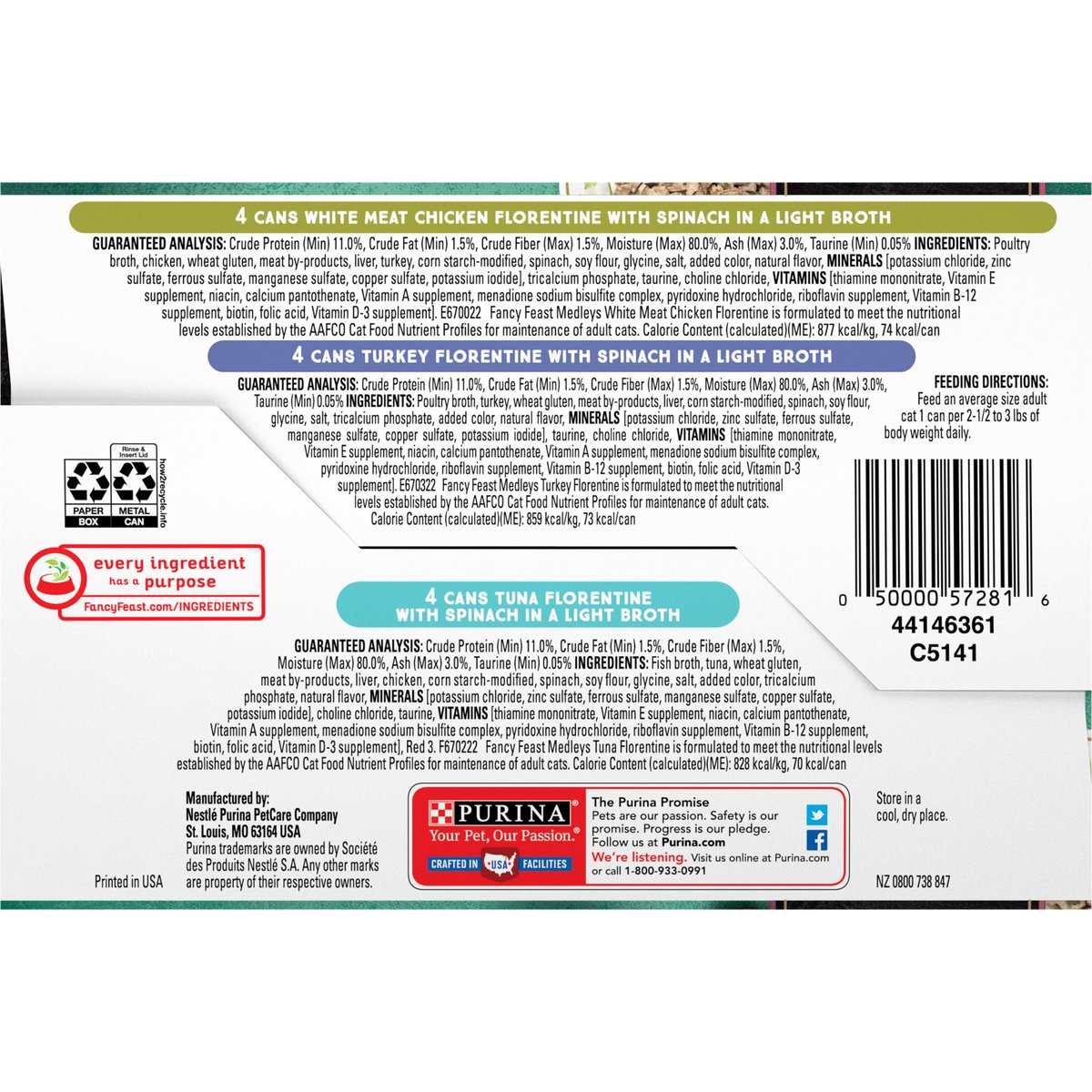 Florentine Collection: 4 White Meat Chicken Florentine with Spinach in a Light Broth. 4 Turkey Florentine with Spinach in a Light Broth. 4 Tuna Florentine with Spinach in a Light Broth. Culinary inspired global recipes. Give Your Cat The World: The best food transports us. It also connects us with those we love. Crafted with exceptional ingredients, each Medleys entree brings the finest flavors from around the globe to your cat's dish. Give your cat the world, and savor your journey together. No artificial preservatives. Crafted with the expertise of chefs and cat nutritionists. Purina your pet, our passion. No artificial colors. Pets are our passion. Safety is our promise. Progress is our pledge. The Purina Promise: Pets are our passion. Safety is our promise. Progress is our pledge. Follow us at Purina.com. Purina.com. how2recycle.info. FancyFeast.com/Ingredients. Twitter. Facebook. Every ingredient has a purpose. FancyFeast.com/Ingredients. We're listening. Visit us online at Purina.com or call 1-800-933-0991. Printed in USA. Crafted in USA facilities.