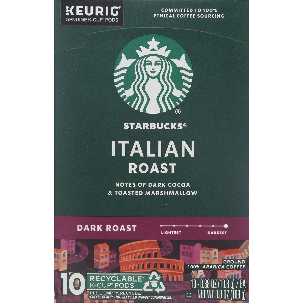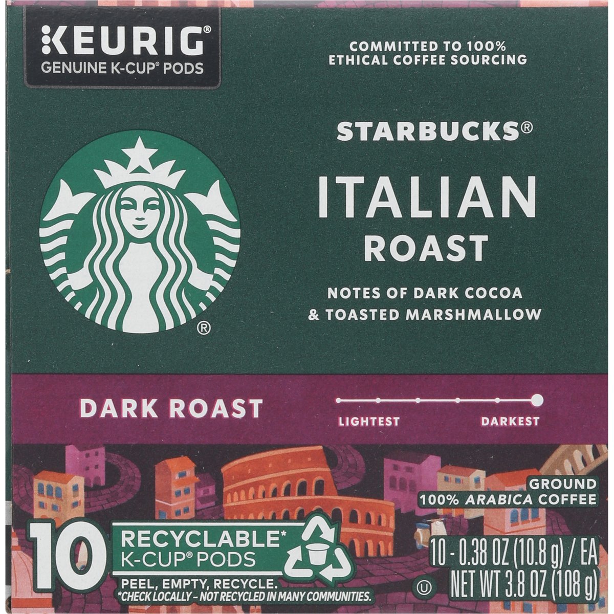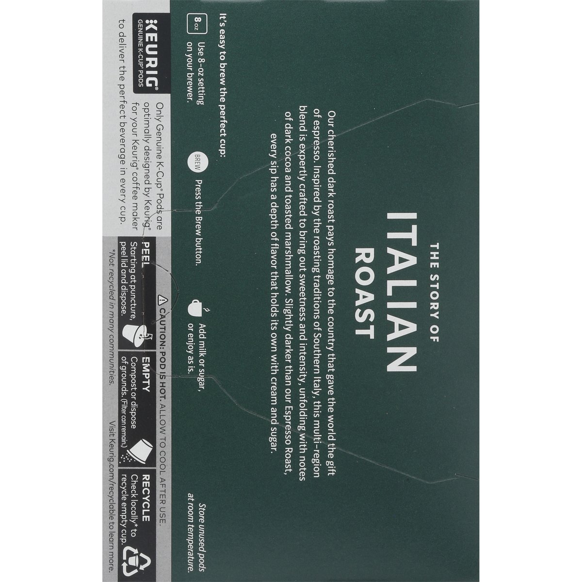 Notes of dark cocoa & toasted marshmallow. Keurig Genuine K-Cup Pods. The Story of Italian Roast: Our cherished dark roast pays homage to the country that gave the world the gift of espresso. Inspired by the roasting traditions of Southern Italy, this multi-region blend is expertly crafted to bring out sweetness and intensity, unfolding with notes of dark cocoa and toasted marshmallow. Slightly darker than our Espresso Roast, every sip has a depth of flavor that holds its own with cream and sugar. starbucks.com/morestars. Starbuks.com/athome. www.Keurig.com. how2recycle.info. Find us on Facebook.com/Keurig or Twitter.com/Keurig. Visit Starbucks.com/athome or call/text 1-877-877-6331. For brewer inquiries contact: 1-866-901-Brew/1-866-901-2739 www.keurig.com. Starbuck Rewards: Join today: starbucks.com/morestars. This carton is made with recycled material. Committed to 100% Ethical Coffee Sourcing in partnership with Conservation International. Learn more about Starbucks sustainable and ethical sourcing practices. athome.Starbucks.com/ethical-sourcing. Recyclable* K-Cups pods. Peel, empty, recycle. Only Genuine K-Cup Pods are optimally designed by Keurig for your Keurig coffee maker to deliver the perfect beverage in every cup. Caution: Pod is hot. Allow to cool after use. Peel: Starting at puncture, peel lid and dispose. Empty: Compost or dispose of grounds. (Filter can remain). Recycle: Check locally* to recycle empty cup. Visit keurig.com/recyclable to learn more. * Not recycled in many communities.