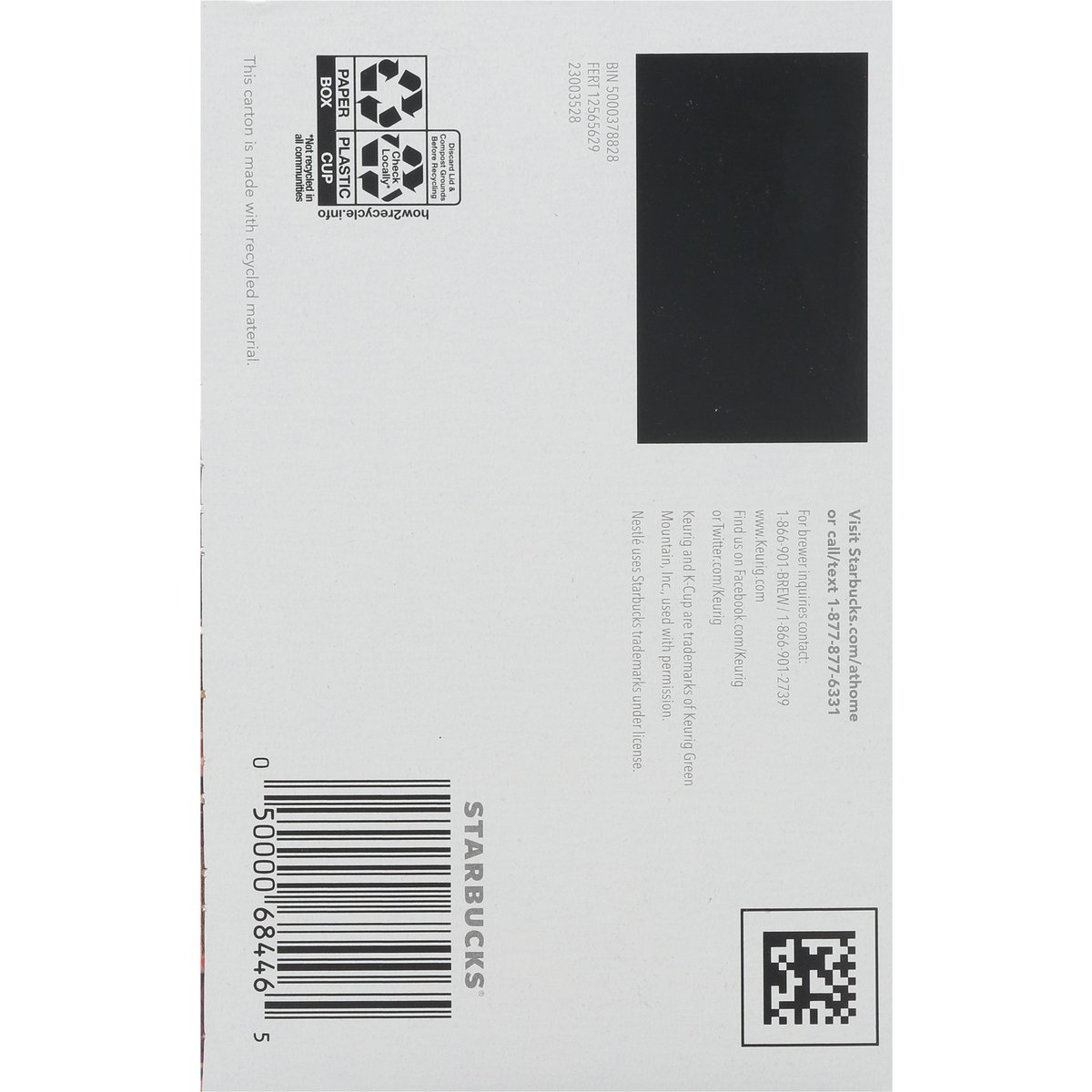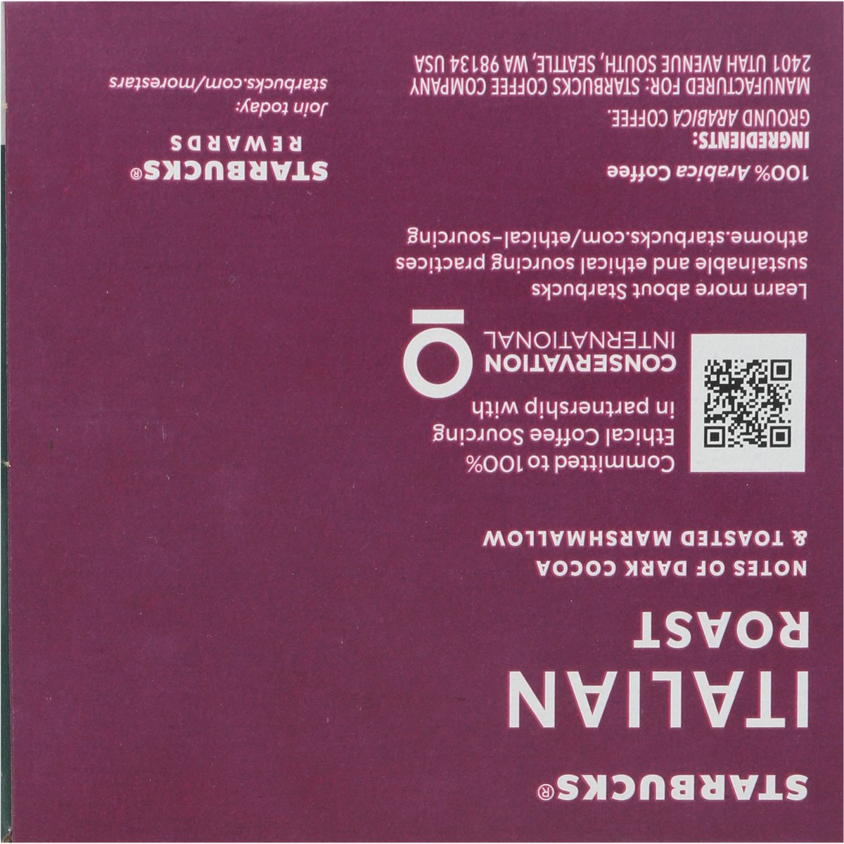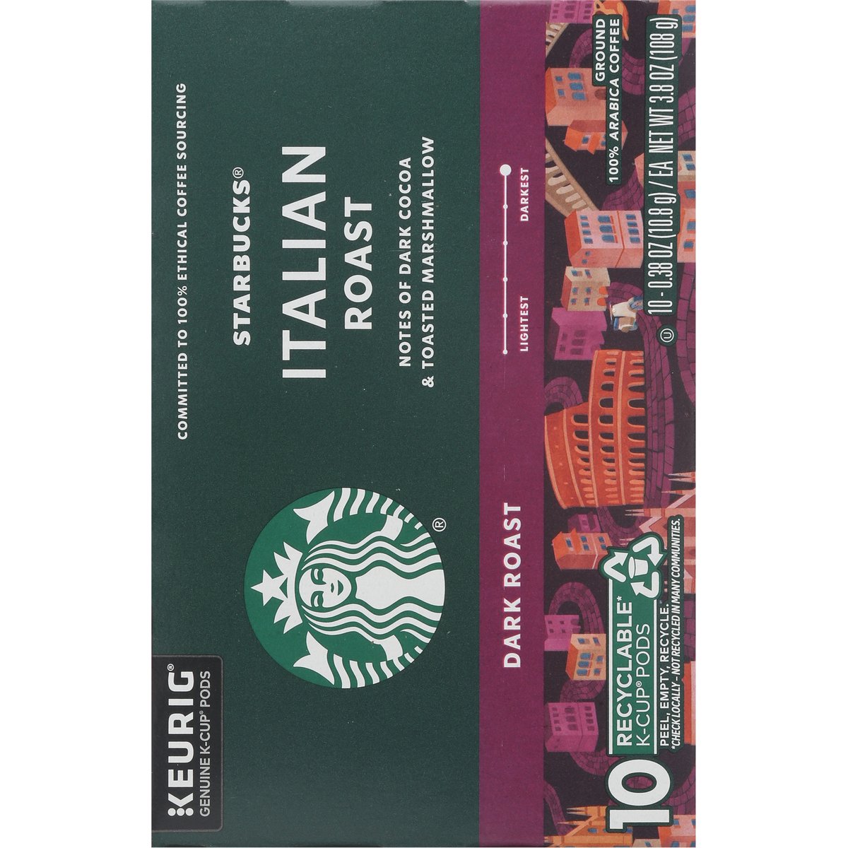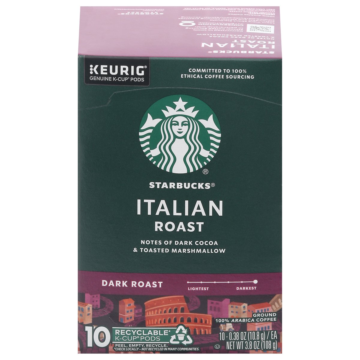 Notes of dark cocoa & toasted marshmallow. Keurig Genuine K-Cup Pods. The Story of Italian Roast: Our cherished dark roast pays homage to the country that gave the world the gift of espresso. Inspired by the roasting traditions of Southern Italy, this multi-region blend is expertly crafted to bring out sweetness and intensity, unfolding with notes of dark cocoa and toasted marshmallow. Slightly darker than our Espresso Roast, every sip has a depth of flavor that holds its own with cream and sugar. starbucks.com/morestars. Starbuks.com/athome. www.Keurig.com. how2recycle.info. Find us on Facebook.com/Keurig or Twitter.com/Keurig. Visit Starbucks.com/athome or call/text 1-877-877-6331. For brewer inquiries contact: 1-866-901-Brew/1-866-901-2739 www.keurig.com. Starbuck Rewards: Join today: starbucks.com/morestars. This carton is made with recycled material. Committed to 100% Ethical Coffee Sourcing in partnership with Conservation International. Learn more about Starbucks sustainable and ethical sourcing practices. athome.Starbucks.com/ethical-sourcing. Recyclable* K-Cups pods. Peel, empty, recycle. Only Genuine K-Cup Pods are optimally designed by Keurig for your Keurig coffee maker to deliver the perfect beverage in every cup. Caution: Pod is hot. Allow to cool after use. Peel: Starting at puncture, peel lid and dispose. Empty: Compost or dispose of grounds. (Filter can remain). Recycle: Check locally* to recycle empty cup. Visit keurig.com/recyclable to learn more. * Not recycled in many communities.