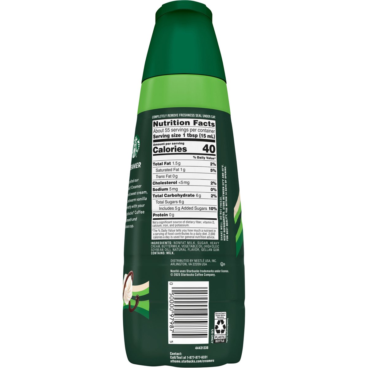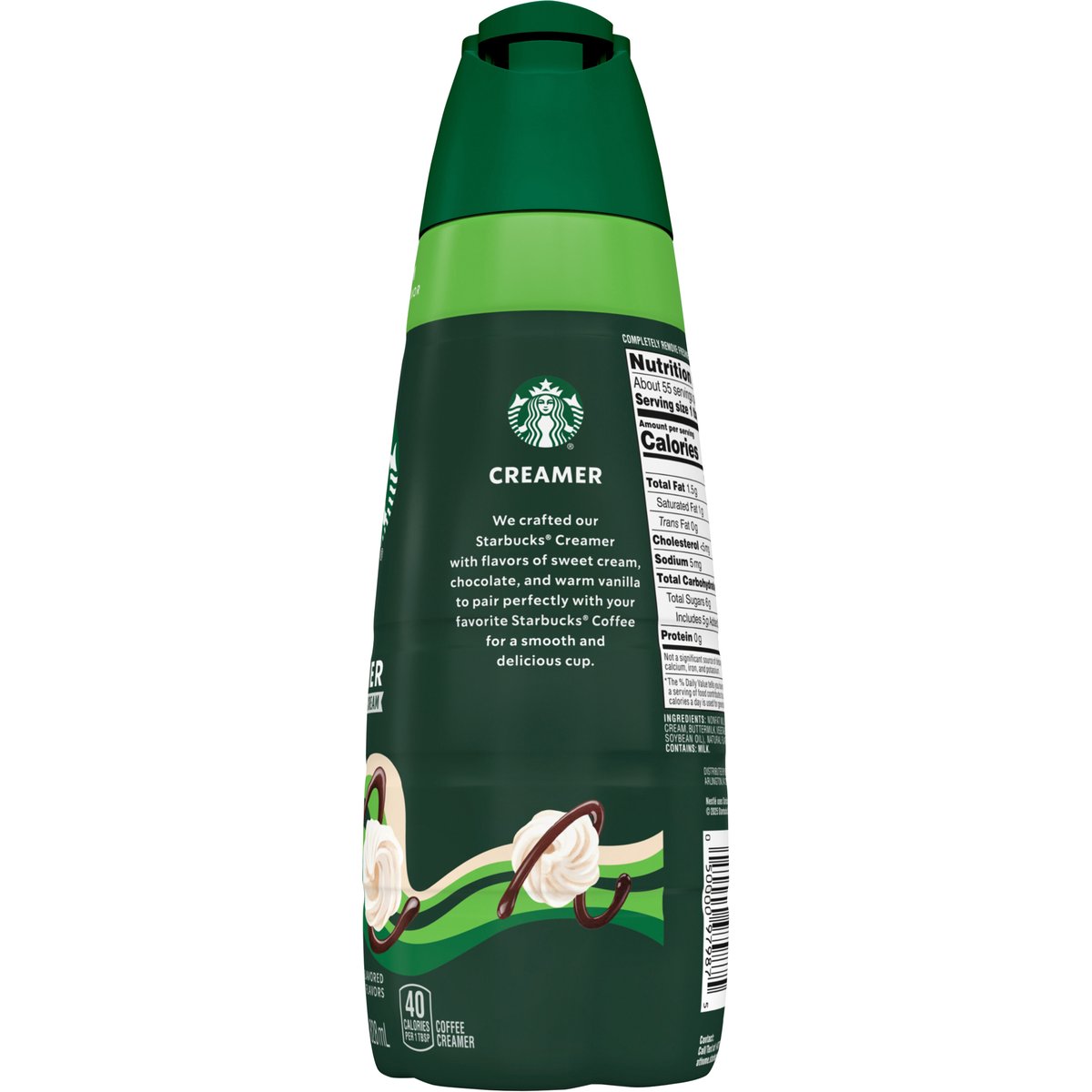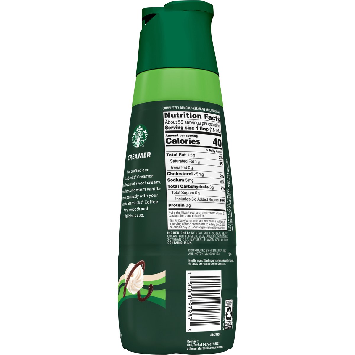 Creamer with real milk & cream. Chocolate vanilla flavored with other natural flavors. 40 calories per 1 tbsp. Inspired flavor. We crafted our Starbucks Creamer with flavors of sweet cream, chocolate, and warm vanilla to pair perfectly with your favorite Starbucks Coffee for a smooth and delicious cup. athome.starbucks.com/creamers. how2recycle.info. Contact: Call/Text at 1-877-877-6331 athome.starbucks.com/creamers.