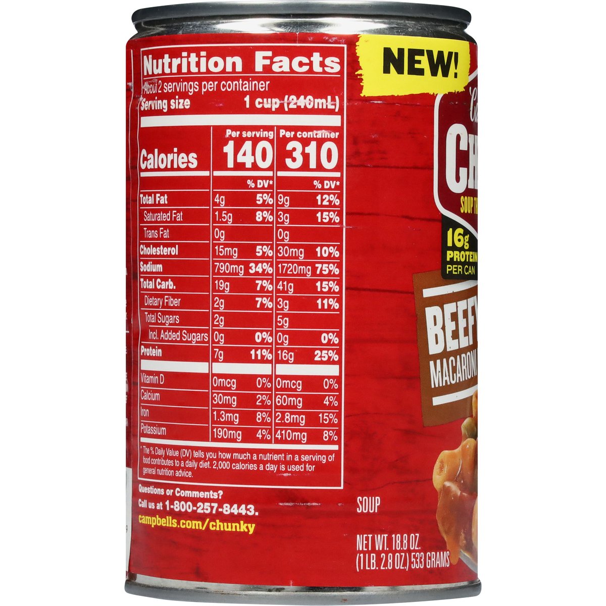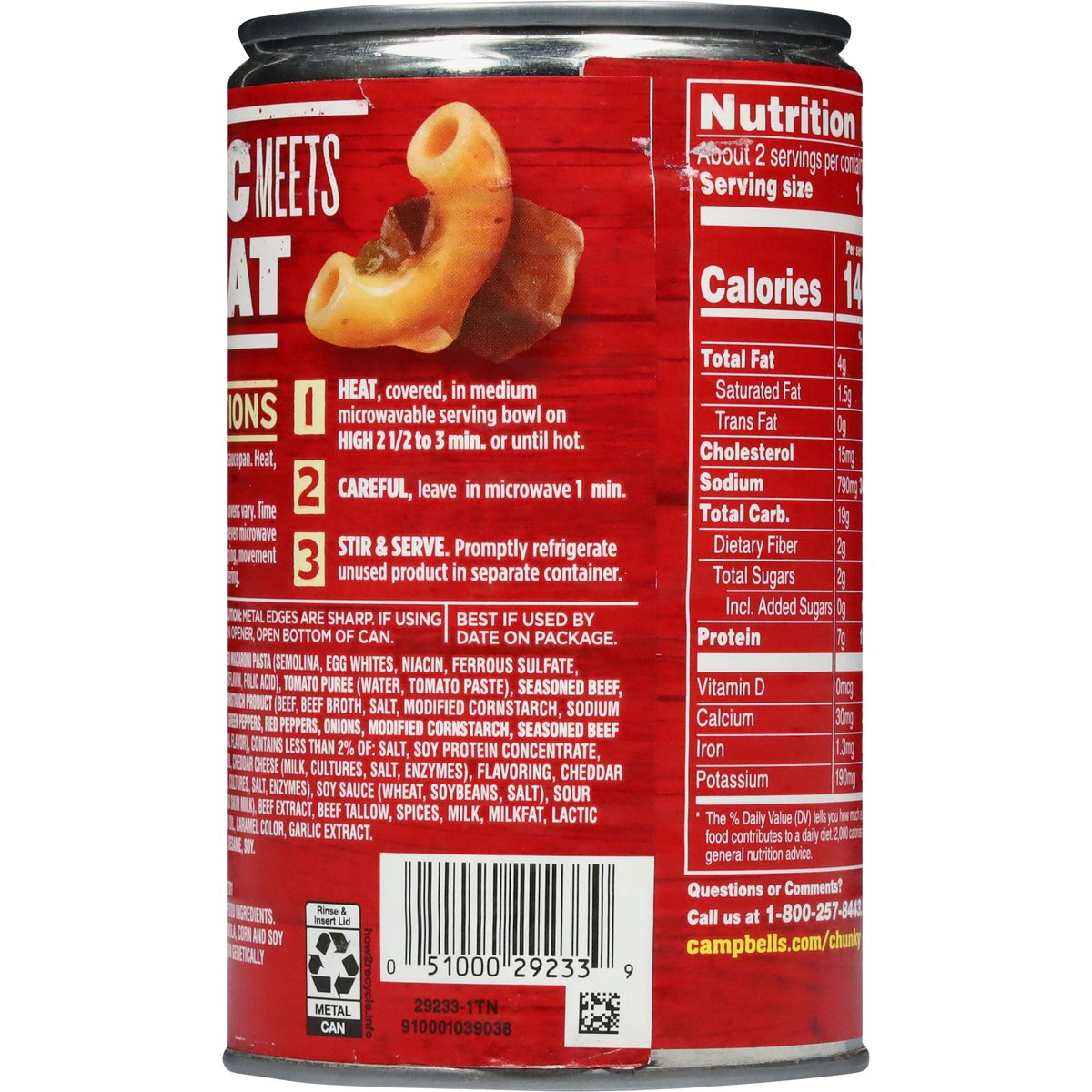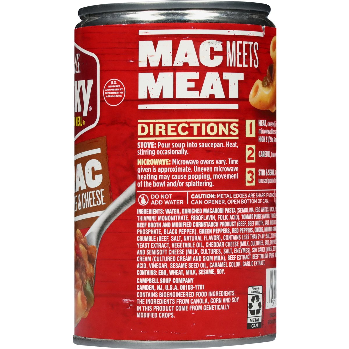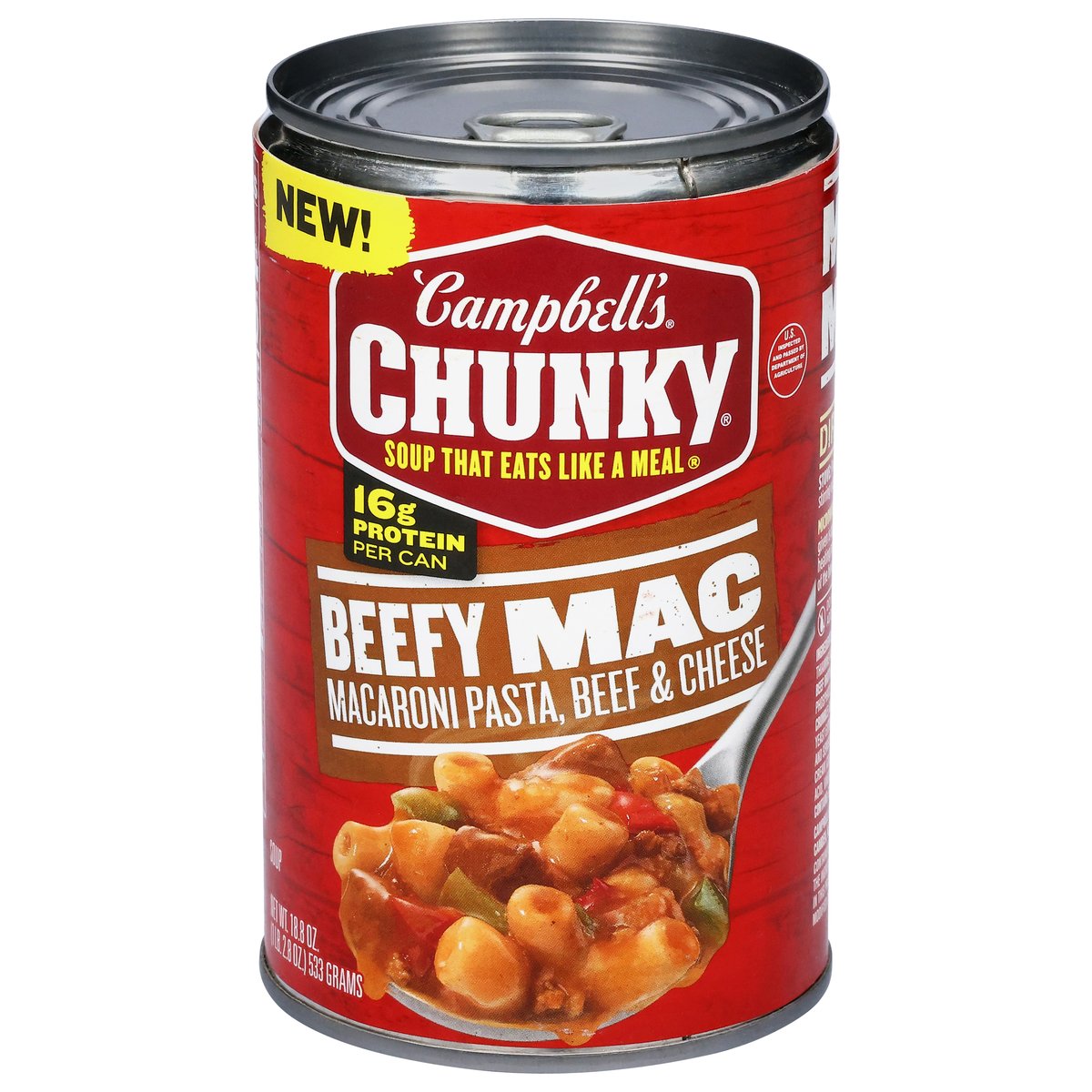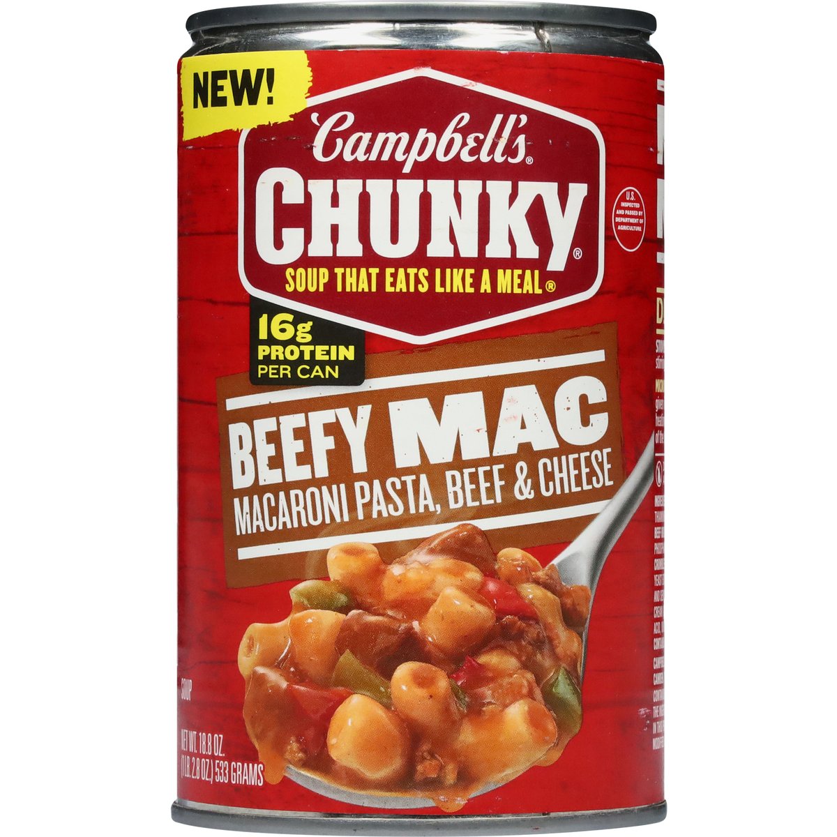 Macaroni pasta, beef & cheese. 16 g protein per can. Contains bioengineered food ingredients. The ingredients from canola, corn and soy in this product come from genetically modified crops. New! Soup that eats like a meal. U.S. inspected and passed by Department of Agriculture. campbells.com/chunky. how2recycle.info. Questions or comments? Call us at 1-800-257-8443.