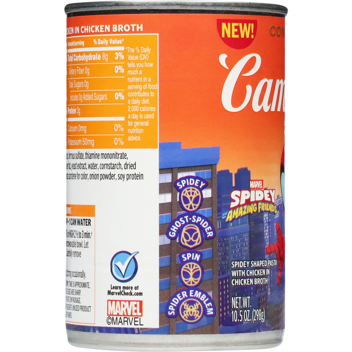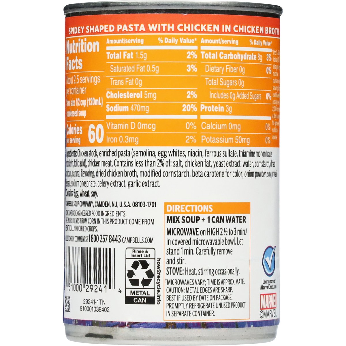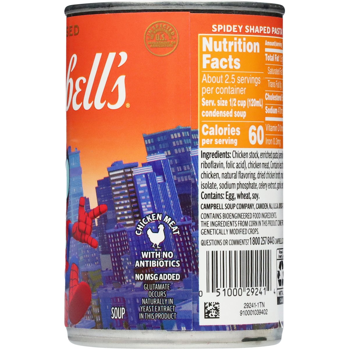 Spidey shaped pasta with chicken in chicken broth. Contains bioengineered food ingredients. The ingredients from corn in this product come from genetically modified crops. Chicken meat with no antibiotics. No MSG added. Glutamate occurs naturally in yeast extract in this product. Inspected for wholesomeness by U.S. Department of Agriculture. campbells.com. how2recycle.info. Questions or Comments? 1 800 257 8443. Learn more at MarvelCheck.com.