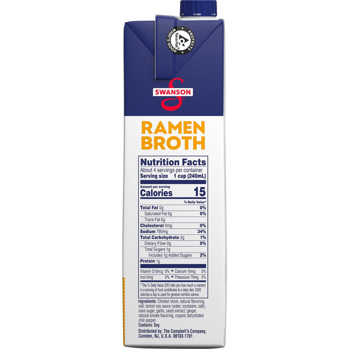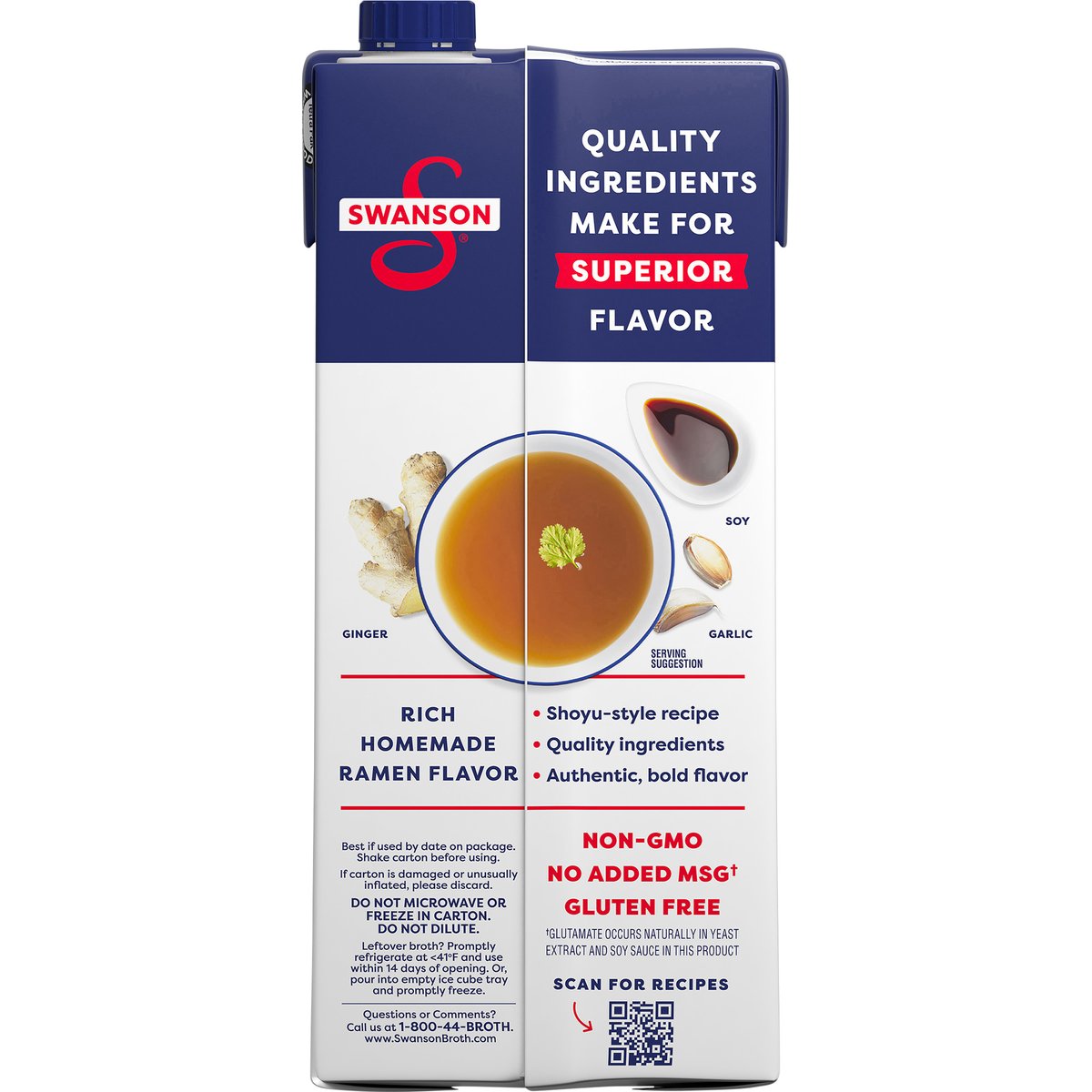 Infused with garlic, ginger, & soy. Gluten free. No added MSG (a). (a) Glutamate occurs naturally in yeast extract and soy sauce in this product. Non-GMO. New. Full body. Rich flavor. 4 cups. Quality ingredients make for superior flavor. Soy; Ginger; Garlic. Rich Homemade Ramen Flavor: Shoyu-style recipe. Quality ingredients. Authentic, bold flavor. how2recycle.info. www.SwansonBroth.com. Scan for recipes. Questions or comments? Call us at 1-800-44-BROTH. Tetra Pak. Protects what's good.