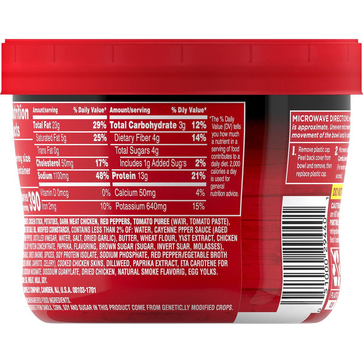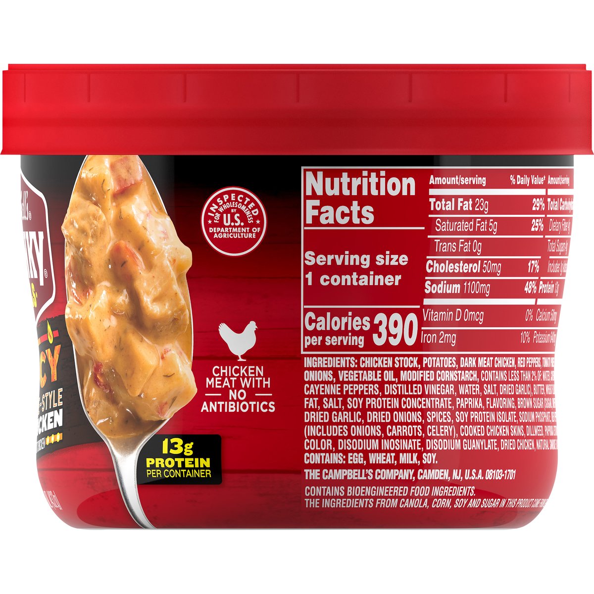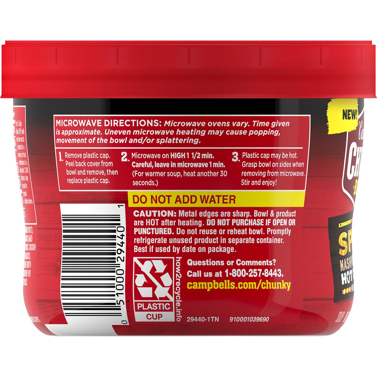 Spicy nashville-style hot chicken with dark meat chicken. 13 g protein per container. Contains bioengineered food ingredients. The ingredients from canola, corn, soy, and sugar in this product come from genetically modified crops. New! Chicken meat with no antibiotics. Inspected for wholesomeness by U.S. Department of Agriculture. campbells.com/chunky. how2recycle.info Questions or Comments? Call us at 1-800-257-8443. campbells.com/chunky.