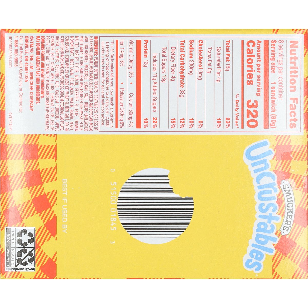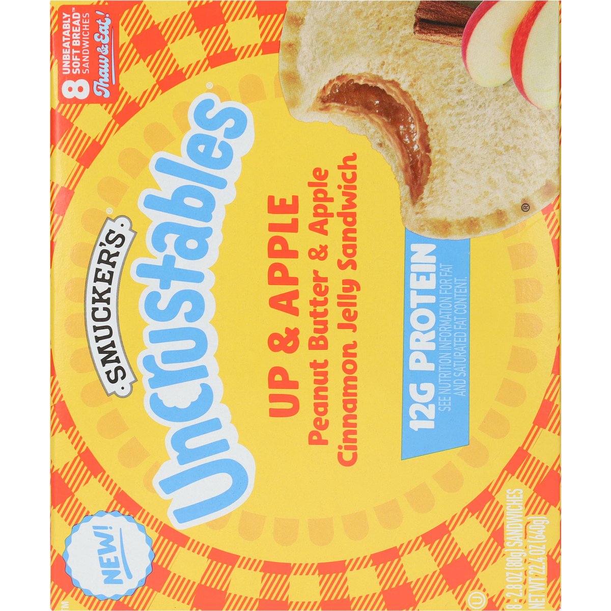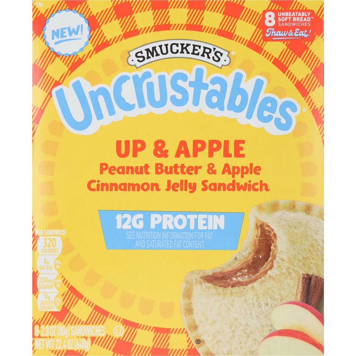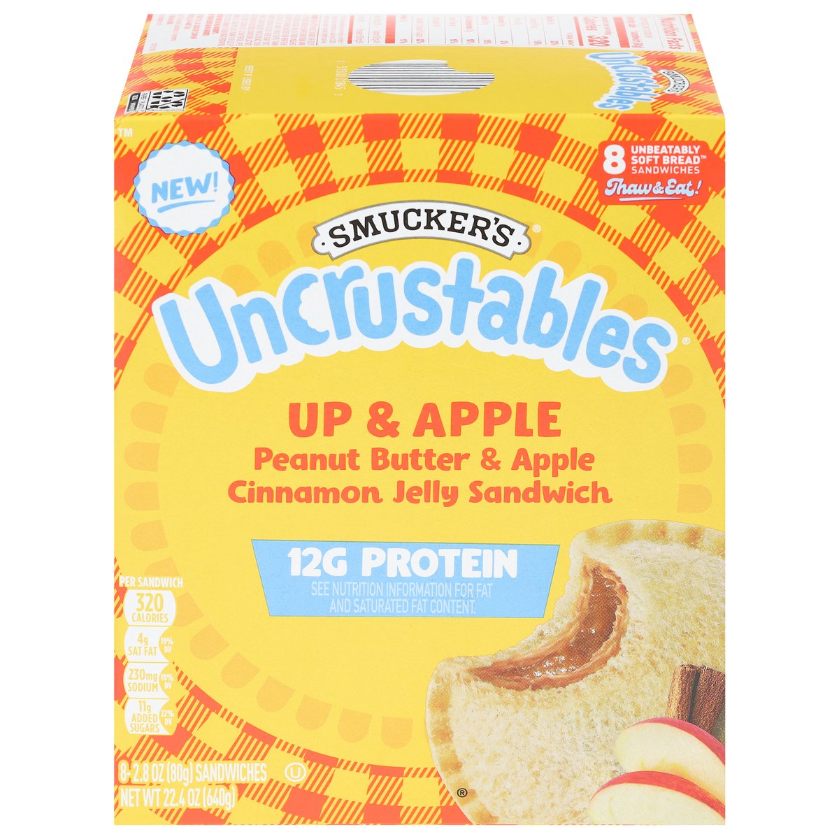 Peanut butter & apple cinnamon jelly sandwich. 12 g protein. Per Sandwich: 320 calories; 4 g sat fat (19% DV); 230 mg sodium (10% DV); 11 g added sugars (22% DV). See nutrition information for fat and saturated fat content. New! 8 Unbeatably soft bread sandwiches. Thaw & eat! uncrustables.com. how2recycle.info. Call toll free with questions or comments 1-888-550-9555; uncrustables.com. Unbeatably soft bread. Baked fresh in the USA.