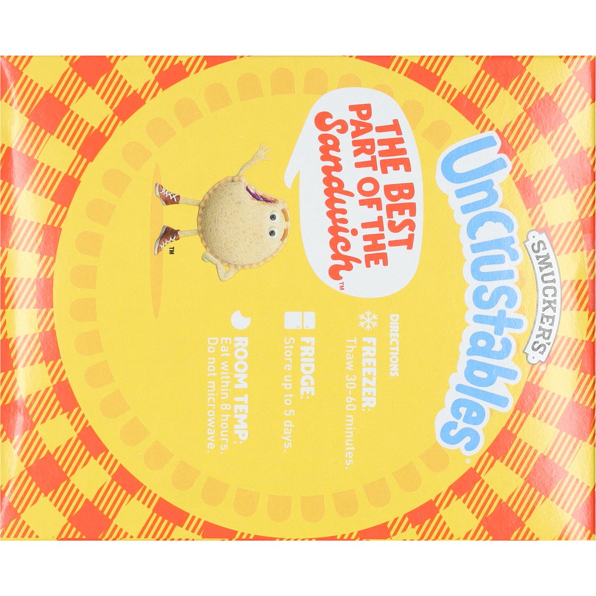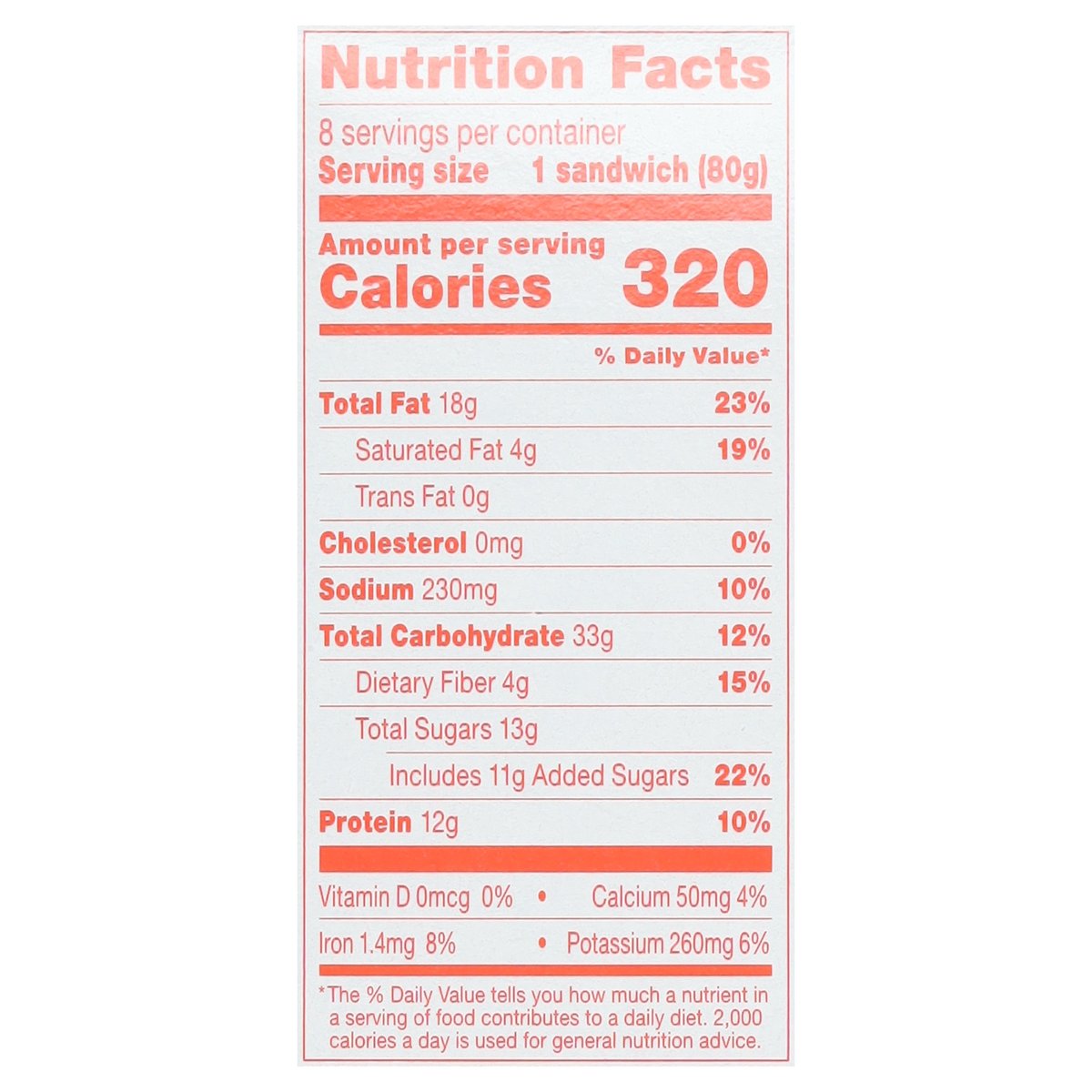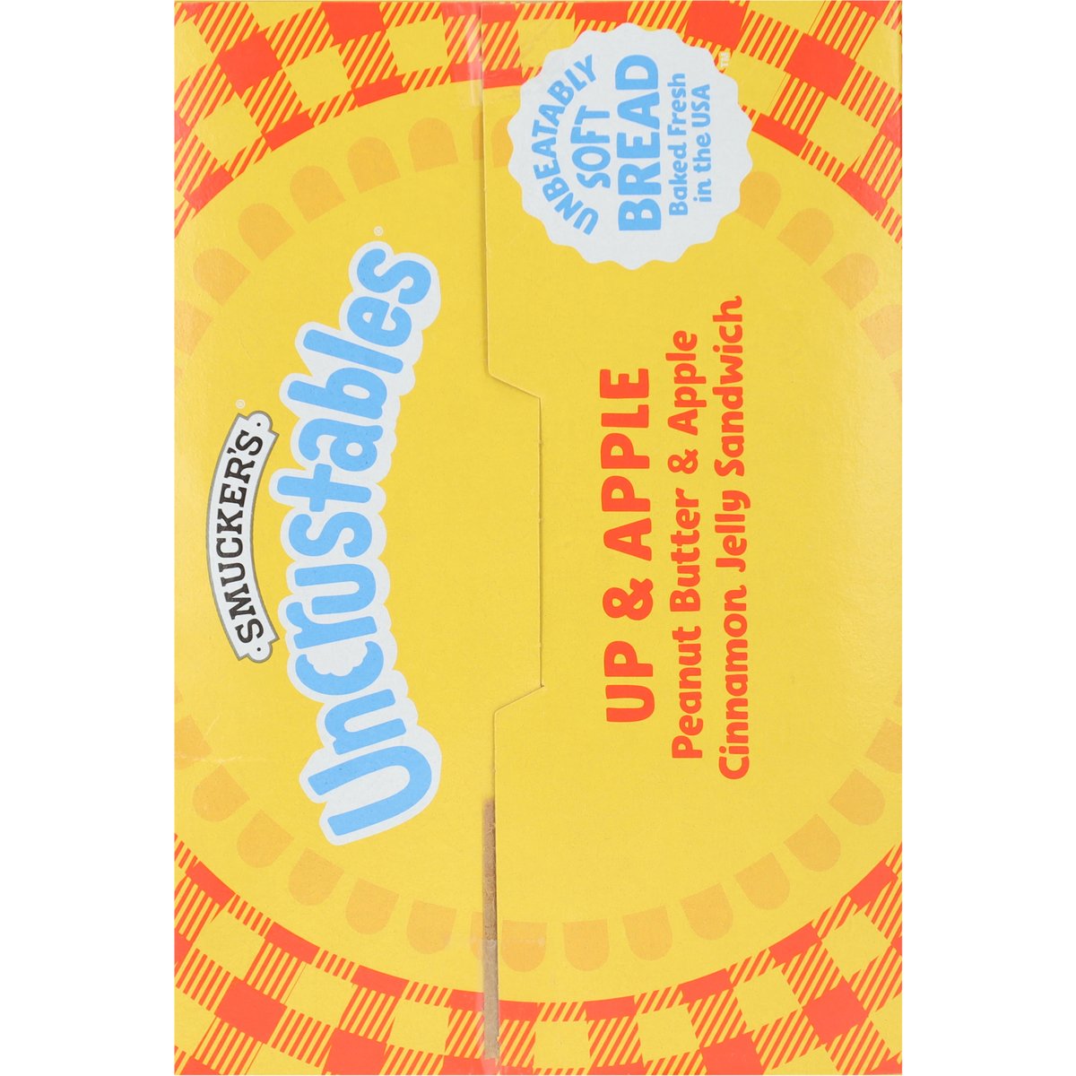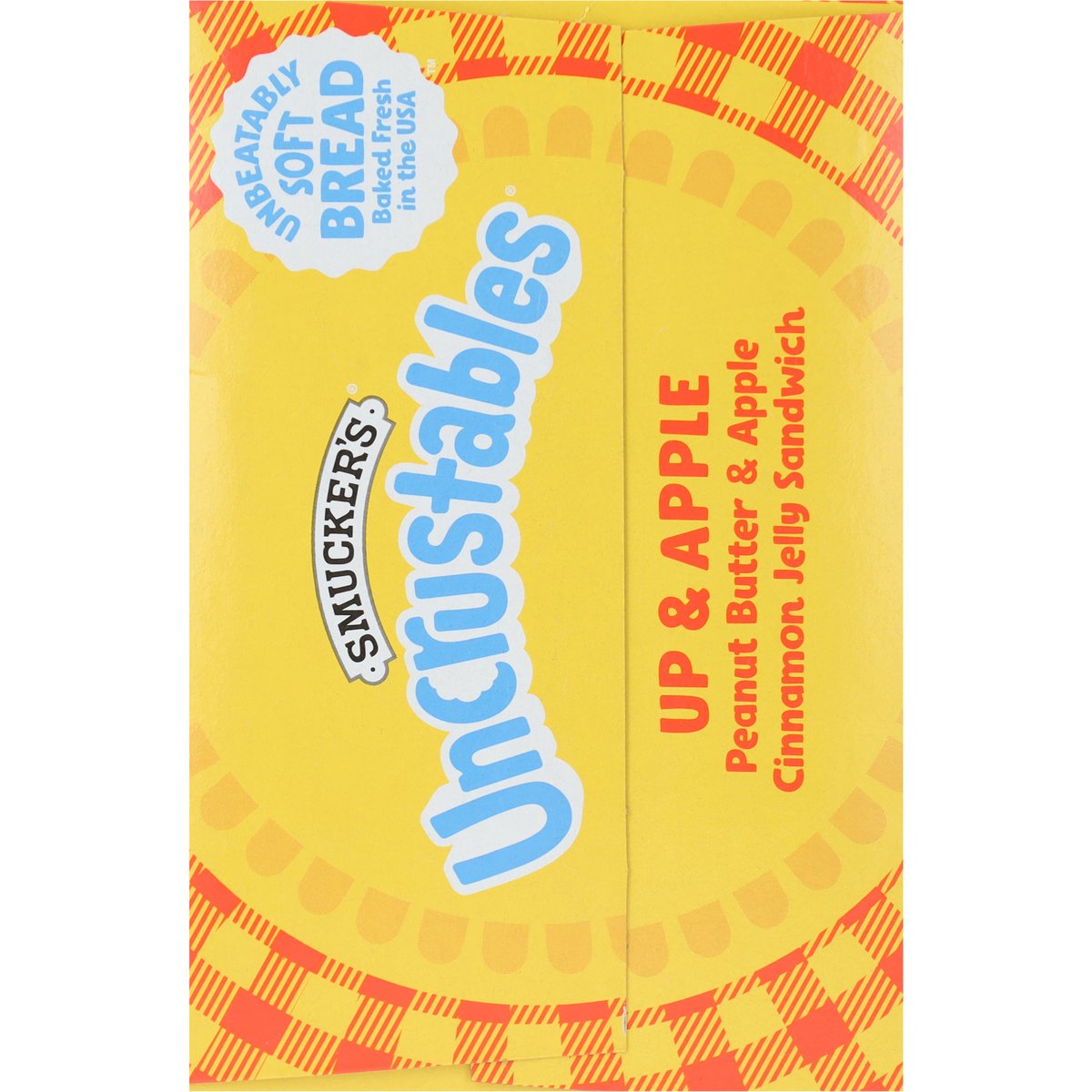Peanut butter & apple cinnamon jelly sandwich. 12 g protein. Per Sandwich: 320 calories; 4 g sat fat (19% DV); 230 mg sodium (10% DV); 11 g added sugars (22% DV). See nutrition information for fat and saturated fat content. New! 8 Unbeatably soft bread sandwiches. Thaw & eat! uncrustables.com. how2recycle.info. Call toll free with questions or comments 1-888-550-9555; uncrustables.com. Unbeatably soft bread. Baked fresh in the USA.