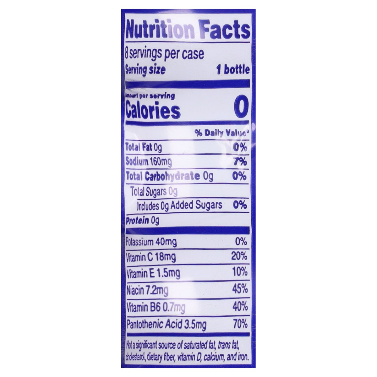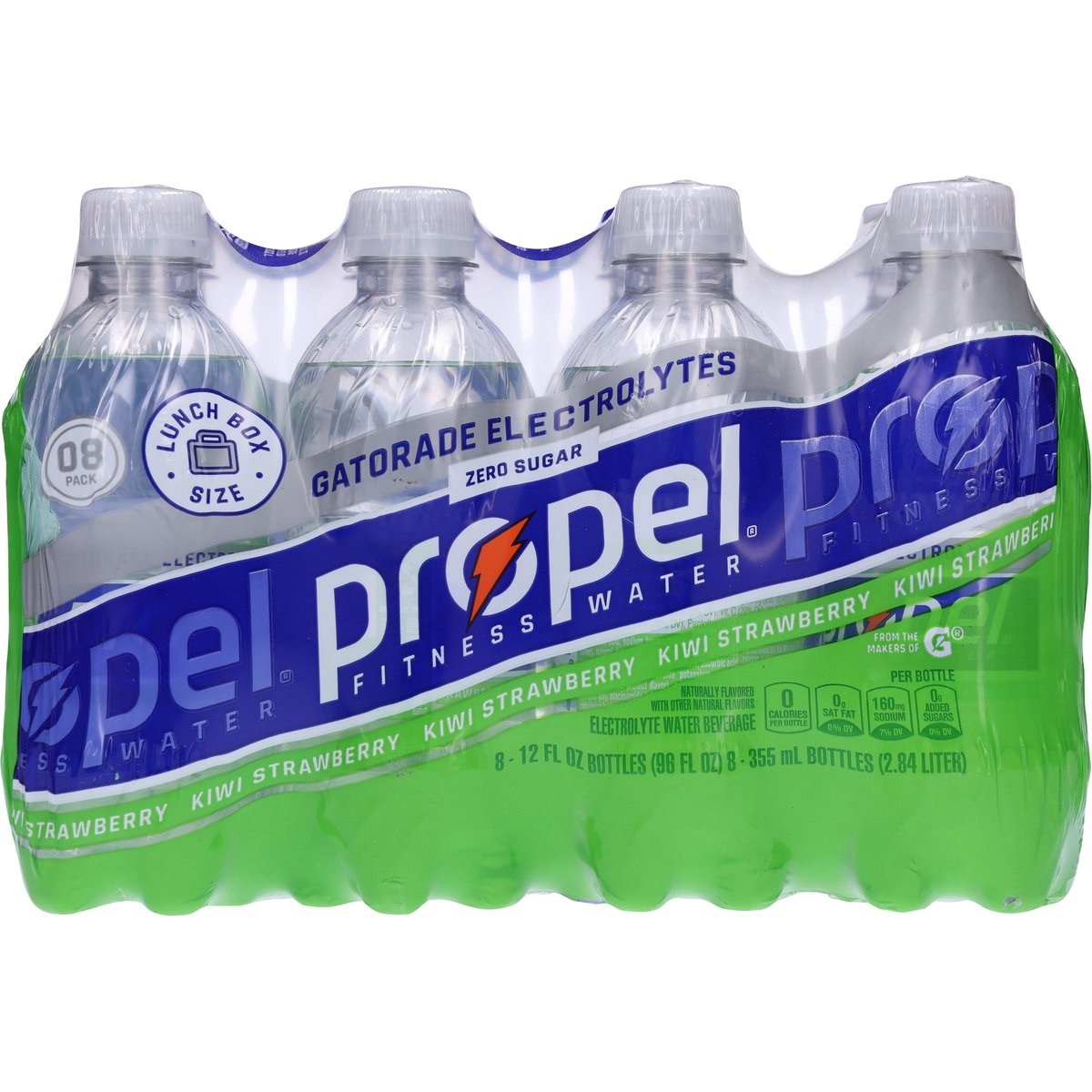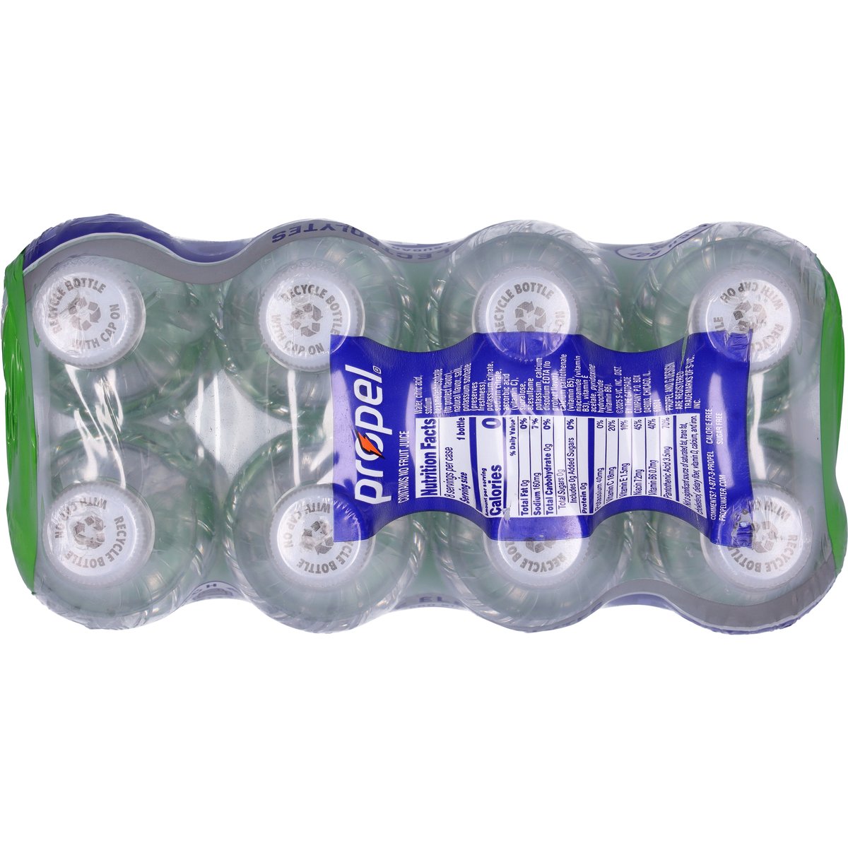 Naturally flavored with other natural flavors. Per Bottle: 0 calories per bottle; 0 g sat fat (0% DV); 160 mg sodium (7% DV); 0 g added sugars (0% DV). Zero sugar. Sugar free. Calorie free. Lunch box size. Gatorade electrolytes. Fitness water. From the makers of G. propelwater.com. how2recycle.info. SmartLabel: Scan for more food information or call 1-877-377-6735. Comments? 1-877-3-PROPEL. propelwater.com. Recycle bottle with cap on.