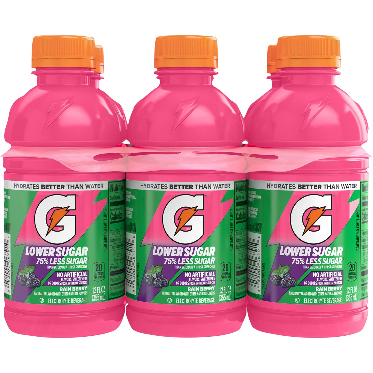 No artificial flavors, sweeteners, or added colors. Naturally flavored with other natural flavors. No artificial sweeteners or flavors. 20 calories per bottle. Lower sugar. 75% less sugar(a) than Gatorade thirst quencher. (a) Per 12 Fl Oz Serving: This product 5 g sugar, Gatorade thirst quencher 21 g sugar. Hydrates better than water. No colors from artificial sources. Not for individual sale. SmartLabel: Scan for info or call 1-800-884-2867. Comments? 1-800-884-2867 or visit gatorade.com.