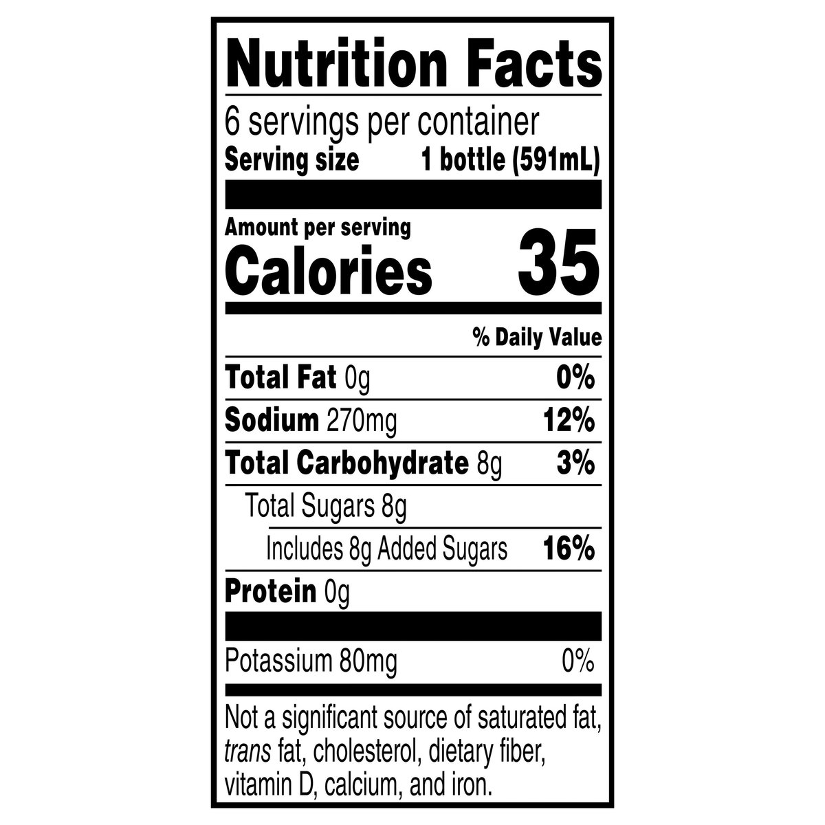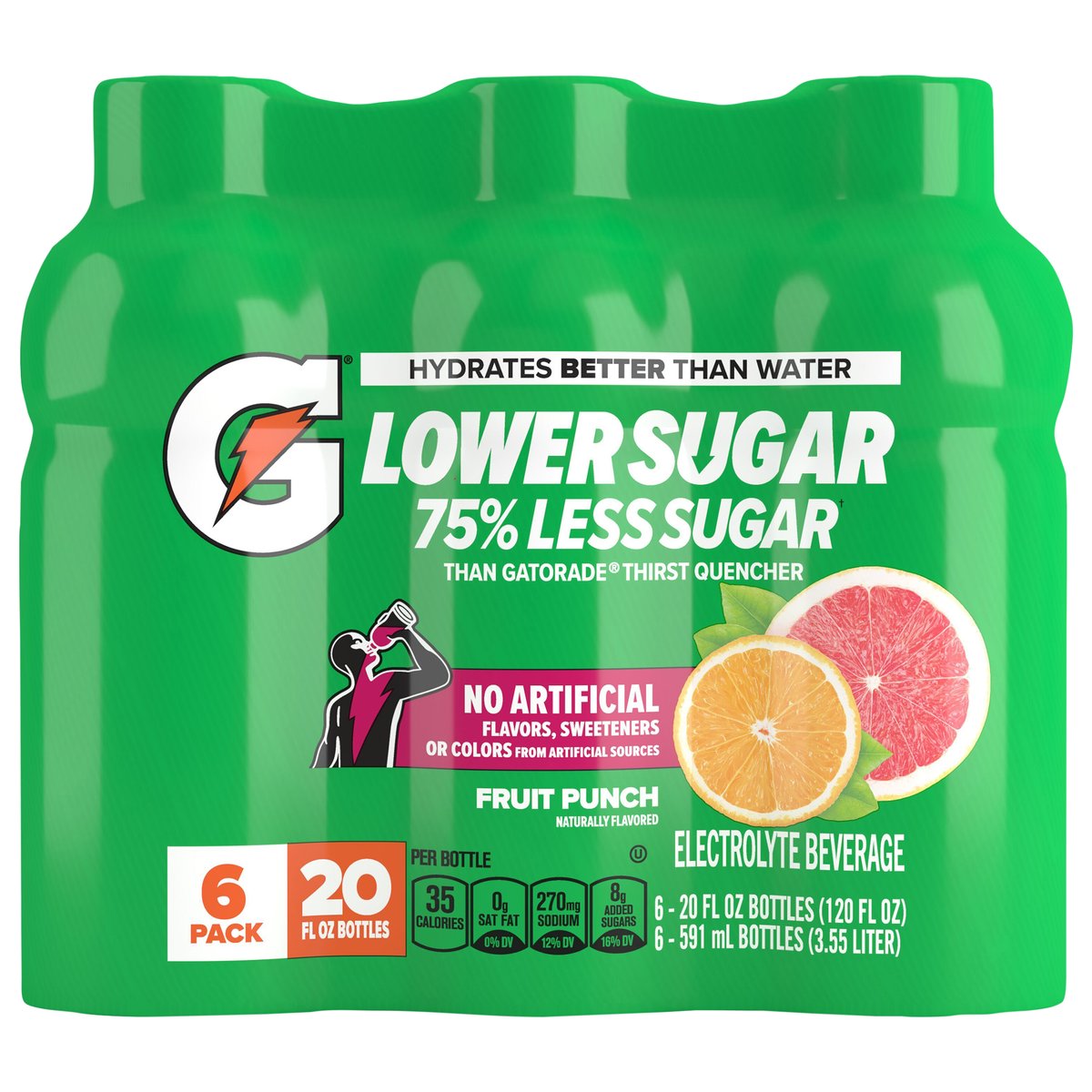 Naturally flavored. Per Bottle: 35 calories; 0 g sat fat (0% DV); 270 mg sodium (12% DV); 8 g added sugars (16% DV). 8 g of sugar per serving. Lower sugar. 75% less sugar(a) than Gatorade Thirst Quencher. (a) Per 12 fl oz serving: This product 8 g sugar, Gatorade Thirst Quencher 34 g sugar. Hydrates better than water. No artificial flavors, sweeteners or colors from artificial sources. Est 1965. No colors from artificial sources. No artificial sweeteners or flavors. gatorade.com. SmartLabel: Scan for more food information or call 1-800-884-2867. Comments? 1-800-884-2867 or visit gatorade.com.