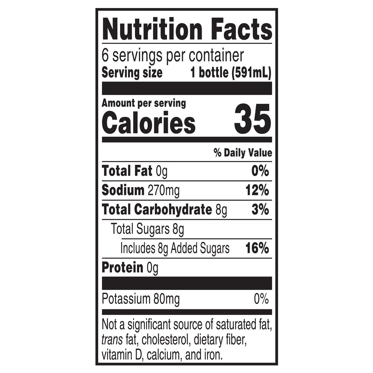 Naturally flavored with other natural flavors. Per Bottle: 35 calories; 0 g sat fat (0% DV); 270 mg sodium (12% DV); 8 g added sugars (16% DV). 8 g of sugar per serving. Lower sugar. 75% less sugar (a) than Gatorade Thirst Quencher. (a) Per 20 Fl Oz Serving: This product 8 g sugar, Gatorade Thirst Quencher 34 g sugar. Hydrates better than water. No artificial flavors, sweeteners or colors from artificial sources. Est 1965. No colors from artificial sources. No artificial sweeteners or flavors. gatorade.com. SmartLabel: Scan for info or call 1-800-884-2867. Comments? 1-800-884-2867 or visit gatorade.com.