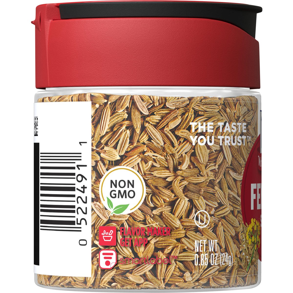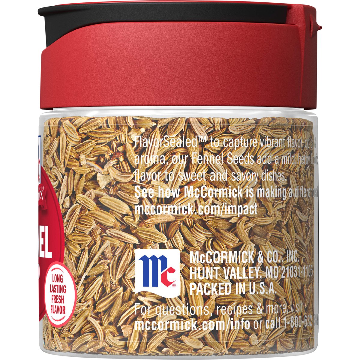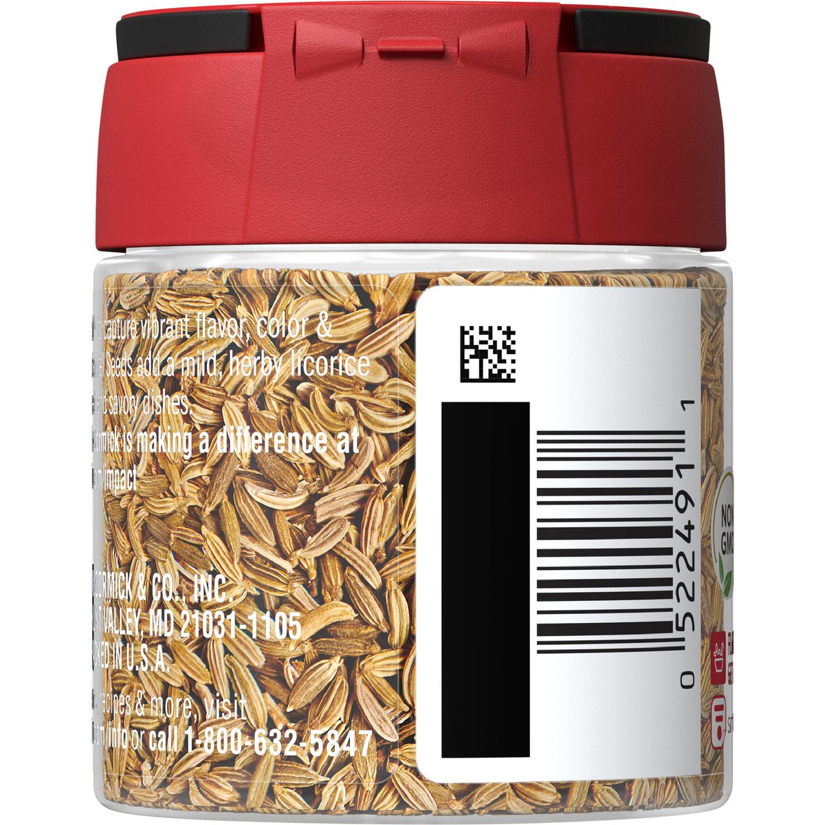 Non GMO. The taste you trust. Long lasting fresh flavor. Flavor sealed to capture vibrant flavor, color & aroma, our fennel seeds add a mild, herby licorice flavor to sweet and savory dishes. mccormick.com/impact. mccormick.com/info SmartLabel: Flavor maker. Get app. See how McCormick is making at difference at mccormick.com/impact.For questions, recipes & more, visit mccormick.com/info or call 1-800-632-5847. Snap tight lid. Packed in USA.