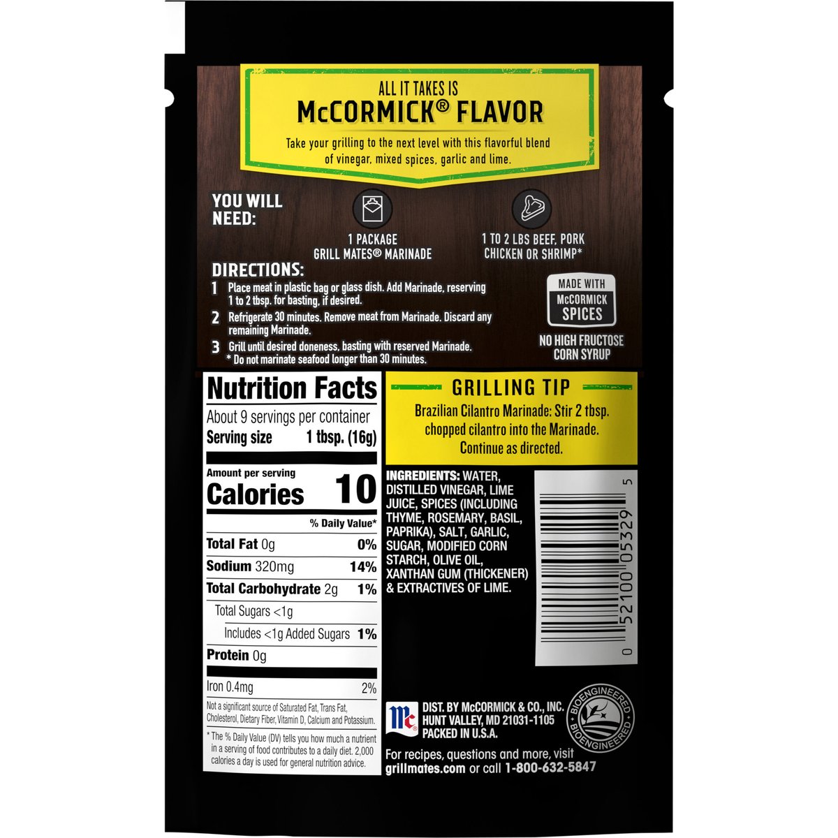 Take your grilling to the next level with this flavorful blend of vinegar, mixed spices, garlic and lime. Bioengineered. Single use. No waste. Ready to pour. All it Takes is McCormick Flavor: Take your grilling to the next level with this flavorful blend of vinegar, mixed spices, garlic and lime. No high fructose corn syrup. grillmates.com For recipes, Questions and more, visit grillmates.com or call 1-800-632-5847. Packed in U.S.A.