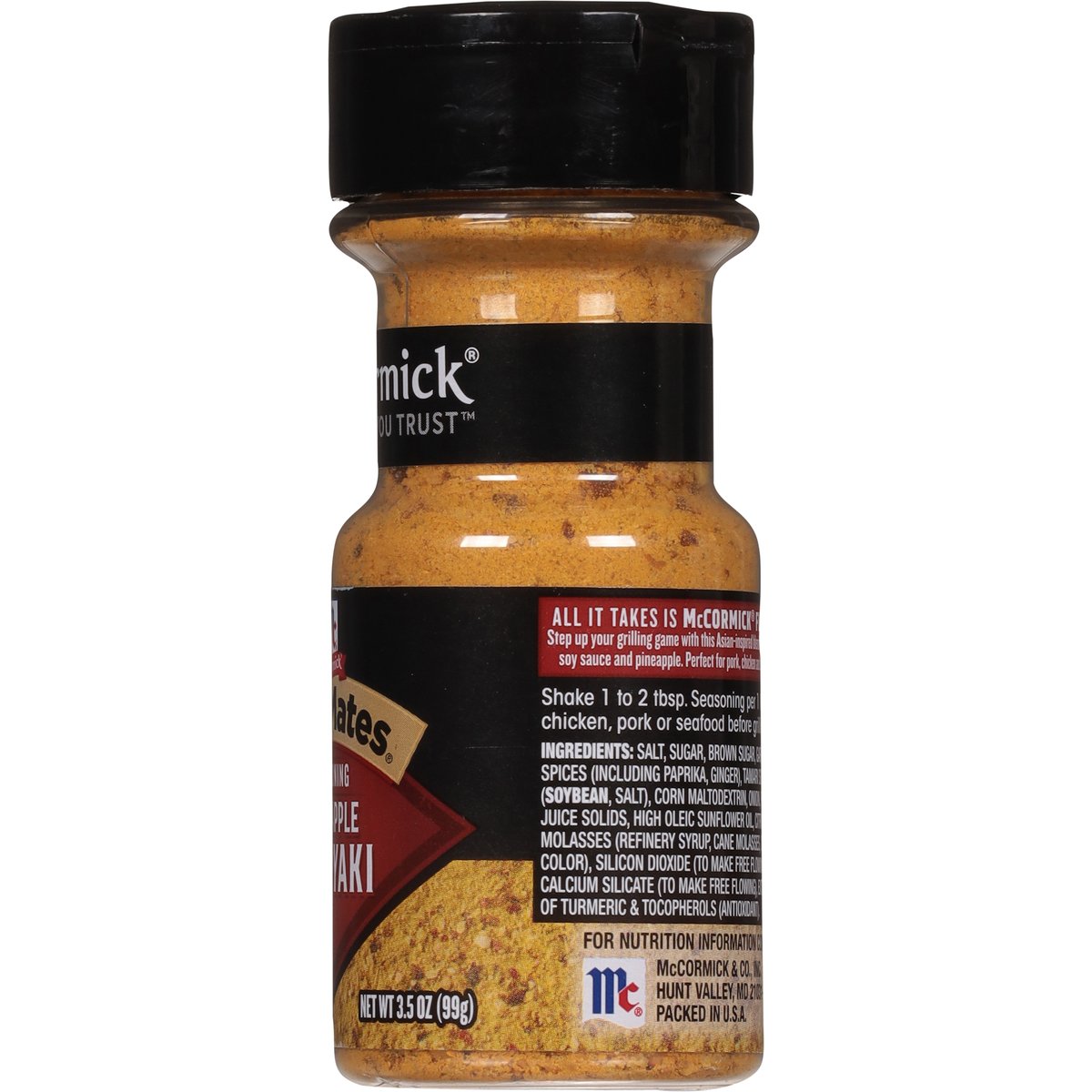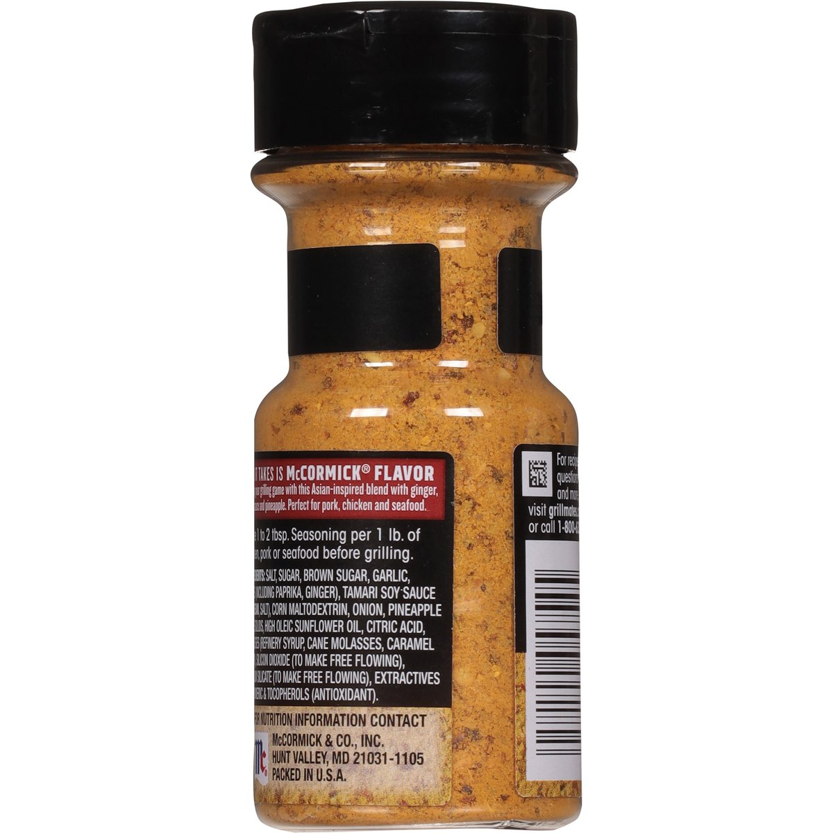 Gluten free. The taste you trust. All it takes is McCormick flavor. Step up your grilling game with this Asian-inspired blend with ginger, soy sauce and pineapple. grillmates.com. For recipes, questions and more, visit grillmates.com or call 1-800-632-5847. Packed in U.S.A.