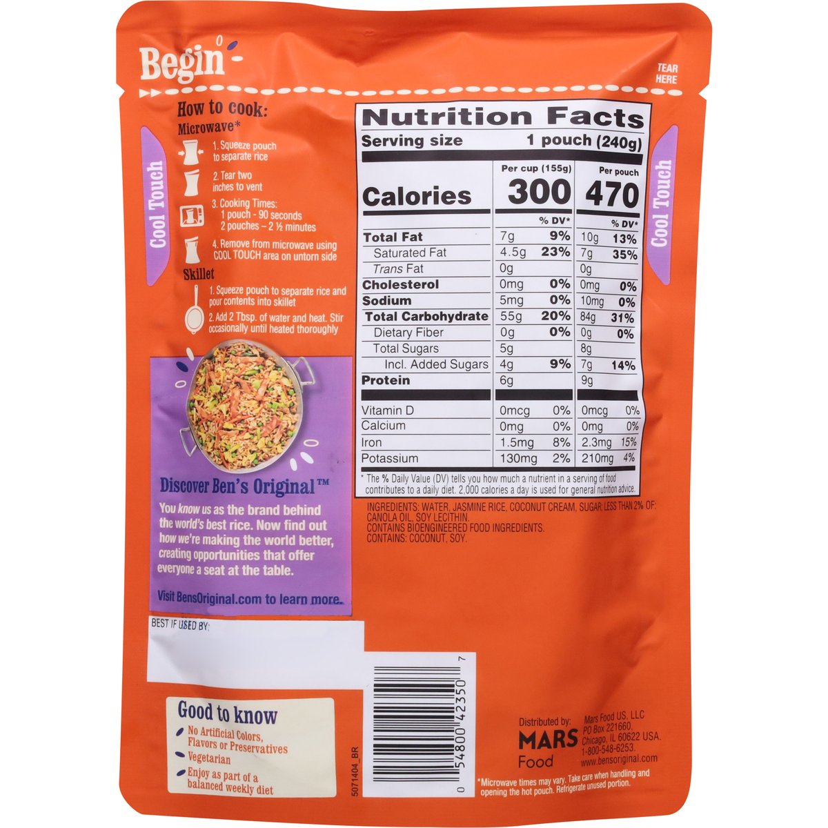 No artificial colors, flavors or preservatives. Per 1 Cup: 300 calories; 4.5 g sat fat (23% DV); 5 mg sodium (0% DV); 5 g total sugars. Vegetarian. Contains bioengineered food ingredients. 100% authentic Thai rice. Microwave in the pouch: 90 sec. Discover Ben's Original. You know us as the brand behind the world's best rice. Now find out how we're making the world better, creating opportunities that offer everyone a seat at the table. Good to Know: Enjoy as part of a balanced weekly diet. Cool touch. www.bensoriginal.com. Visit BensOriginal.com to learn more. BPA free pouch. Made in Canada.