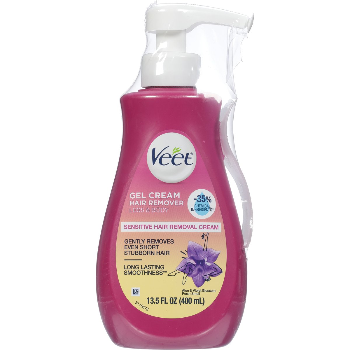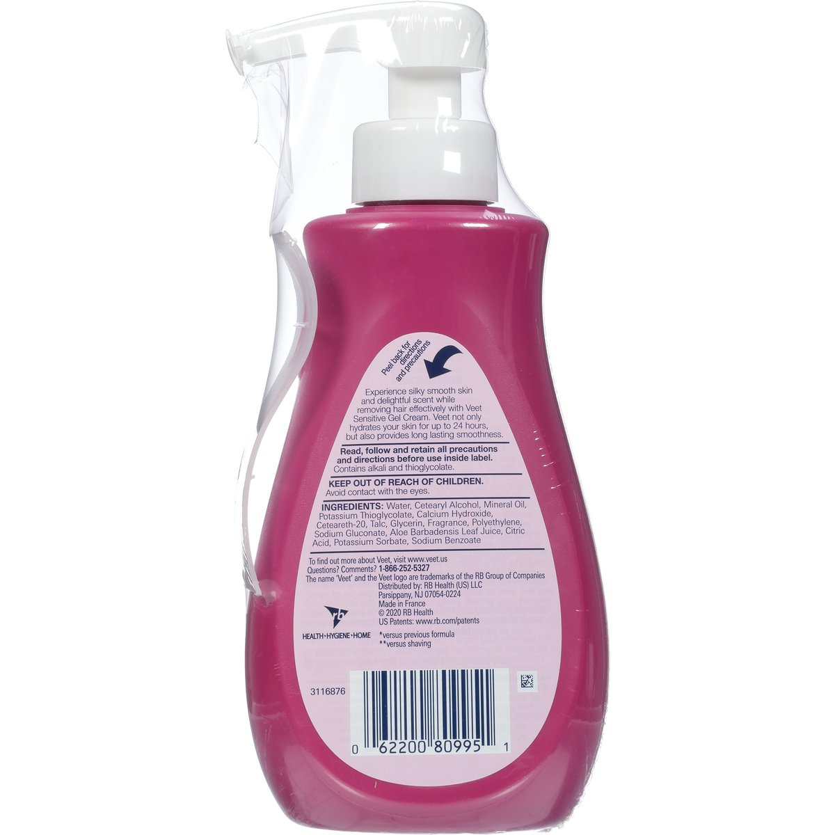 Less than 35% chemical ingredients (Versus previous formula). Gel cream hair remover. Gently removes even short stubborn hair. Long lasting smoothness (Versus shaving). Experience silky smooth skin and delightful scent while removing hair effectively with Veet Sensitive Gel Cream. Veet only hydrates your skin for up to 24 hours, but also provides long lasting smoothness. Health. Hygiene. Home. www.veet.us. To find out more about Veet, visit www.veet.us. Questions? Comments? 1-866-252-5327. Made in France.