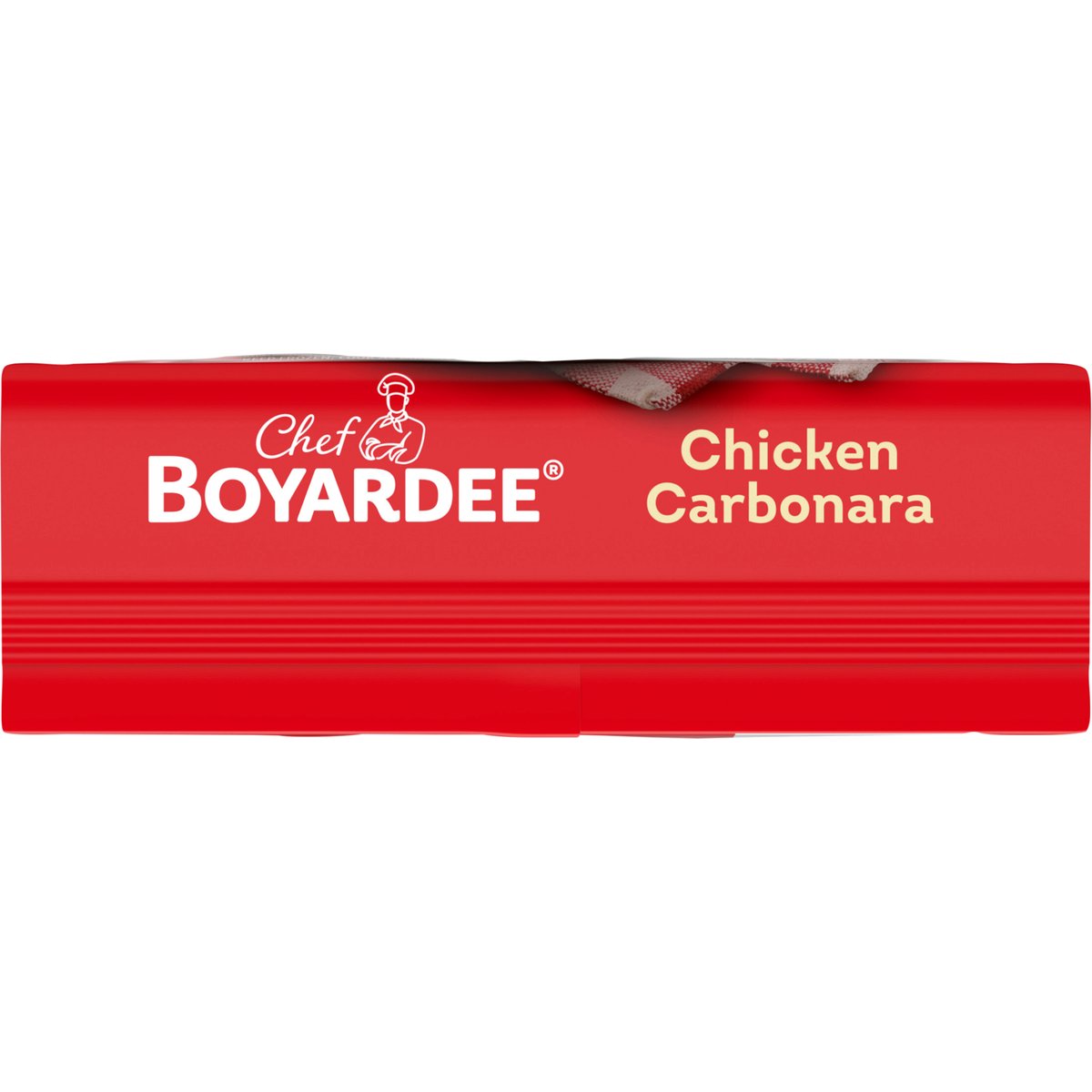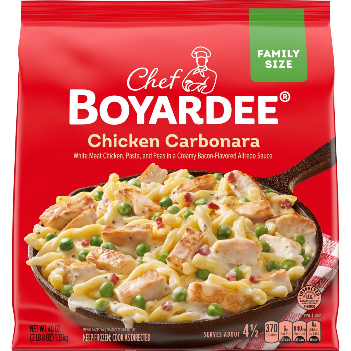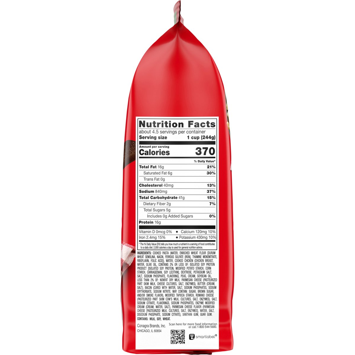 White meat chicken, pasta, and peas in a creamy bacon-flavored alfredo sauce. Per 1 Cup: 370 calories; 6 g sat. fat (30% DV); 840 mg sodium (37% DV); 0 g added sugars (0% DV) Family size. Cook as directed. Brings you delicious home-cooked Italian flavors that the whole family will love! Satisfy your family's cravings for terrific flavor and great food with our complete pasta meals. Made with delicious, hearty ingredients, they combine effortless convenience with crowd-pleasing satisfaction - in 15 minutes or less! Mangia! Inspected for wholesomeness by U.S. Department of Agriculture. www.chefboyardee.com. how2recycle.info. SmartLabel: Scan for more food information or call 1-800-544-5680. Questions or comments, visit us at www.chefboyardee.com or call 1-800-544-5680.
