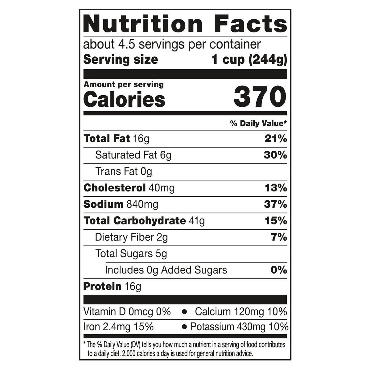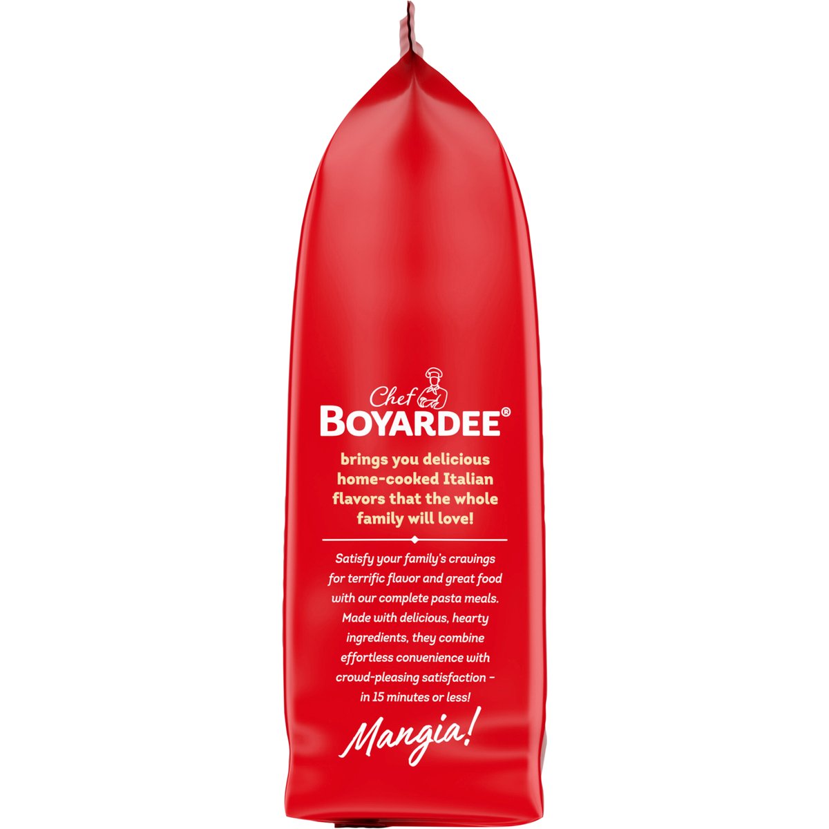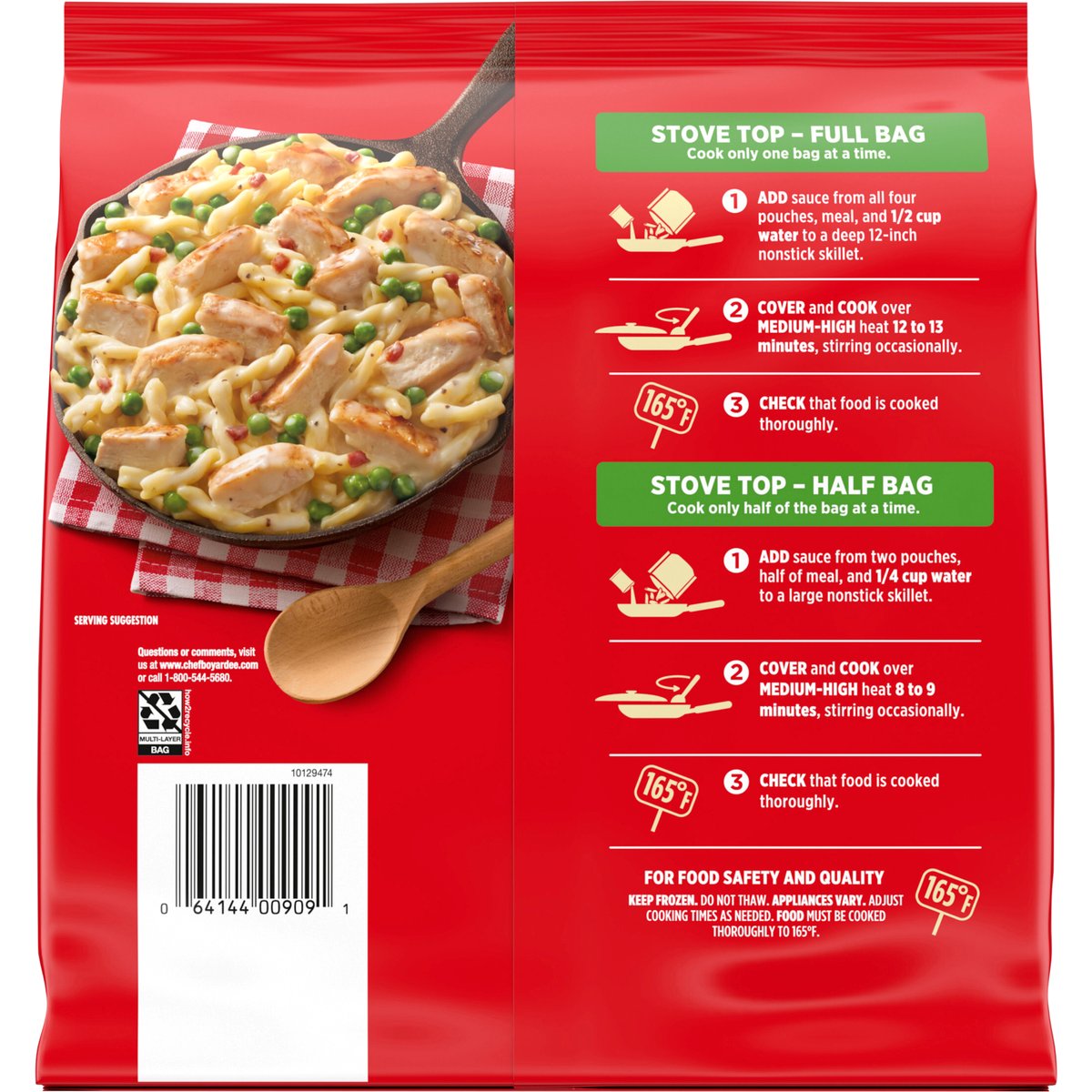 White meat chicken, pasta, and peas in a creamy bacon-flavored alfredo sauce. Per 1 Cup: 370 calories; 6 g sat. fat (30% DV); 840 mg sodium (37% DV); 0 g added sugars (0% DV) Family size. Cook as directed. Brings you delicious home-cooked Italian flavors that the whole family will love! Satisfy your family's cravings for terrific flavor and great food with our complete pasta meals. Made with delicious, hearty ingredients, they combine effortless convenience with crowd-pleasing satisfaction - in 15 minutes or less! Mangia! Inspected for wholesomeness by U.S. Department of Agriculture. www.chefboyardee.com. how2recycle.info. SmartLabel: Scan for more food information or call 1-800-544-5680. Questions or comments, visit us at www.chefboyardee.com or call 1-800-544-5680.