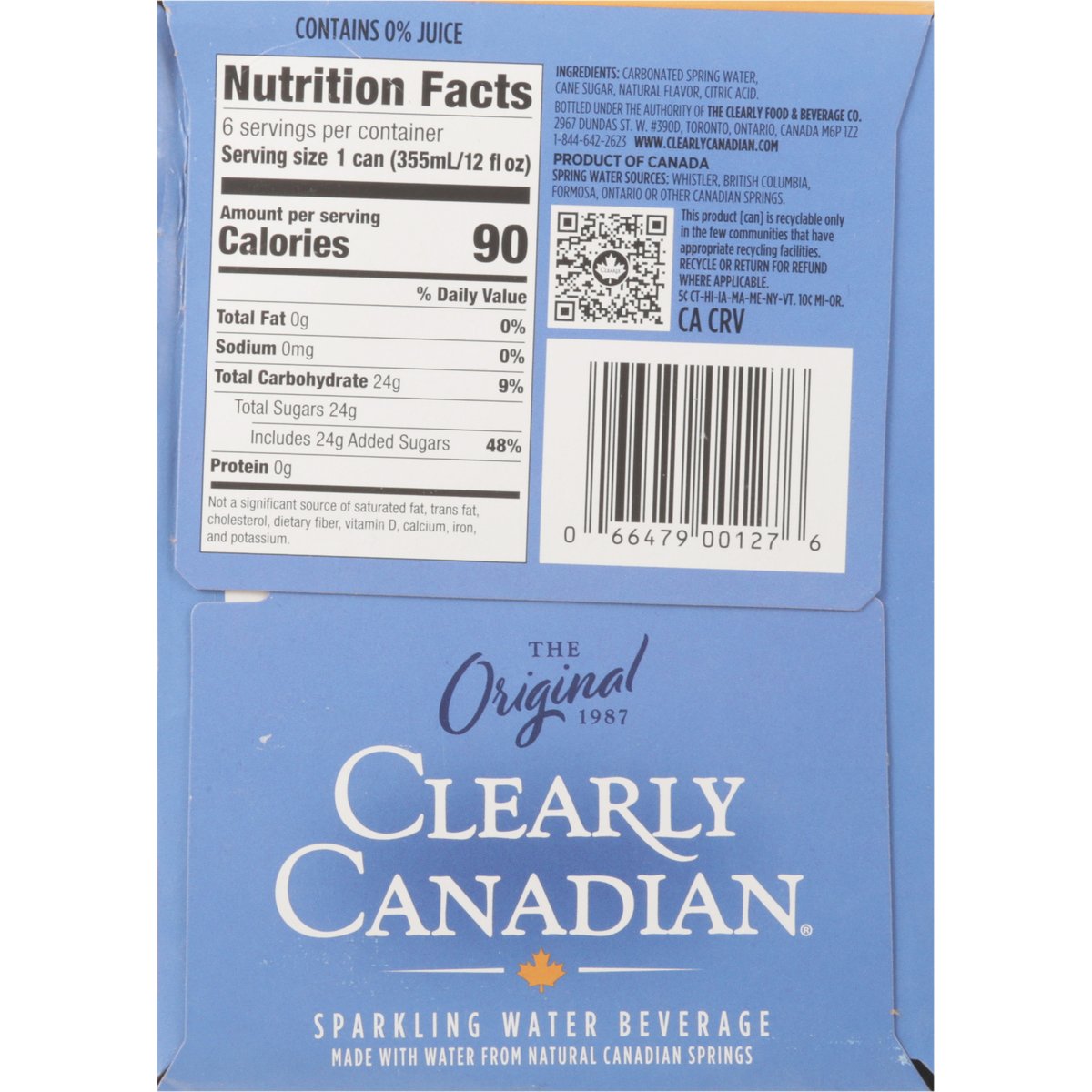 Flavored with other natural flavors. The original 1987. how2recycle.info. www.clearlycanadian.com. 1-844-642-2623. This product [can] is recyclable only in the few communities that have appropriate recycling facilities. Recycle or return for refund where applicable. Bottled in Canada. Product of Canada. Spring Water Sources: Whistler, British Columbia, Formosa, Ontario or other Canadian Springs.