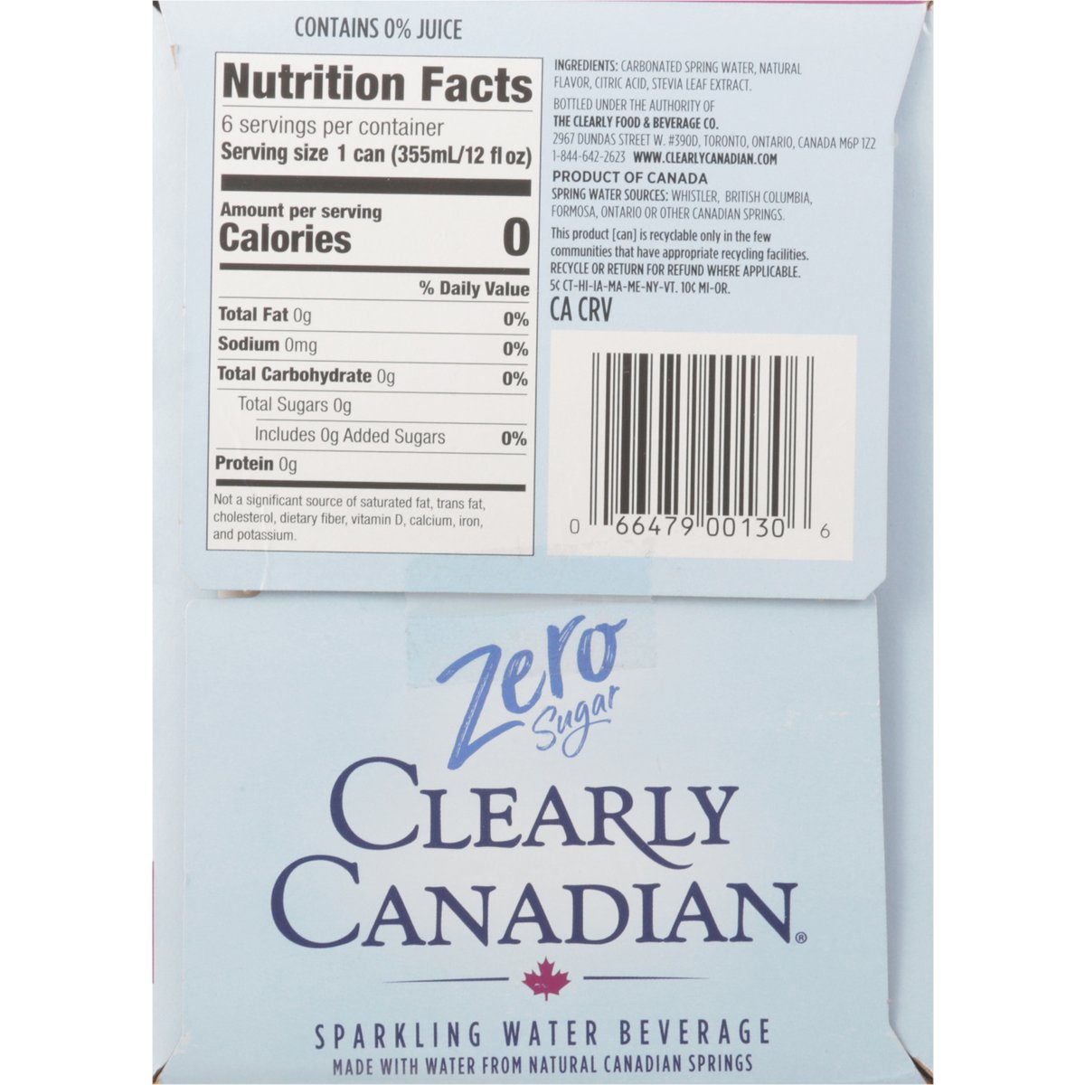 Flavored with other natural flavors. 0 calories. 0 sugar. Zero sugar. Bold flavor is in our nature. www.clearlycanadian.com. how2recycle.info. 1-844-642-2623. This product [can] is recyclable only in the few communities that have appropriate recycling facilities. Recycle or return for refund where applicable. Bottled in Canada. Product of Canada. Spring Water Sources: Whistler, British Columbia, Formosa, Ontario or other Canadian Springs.