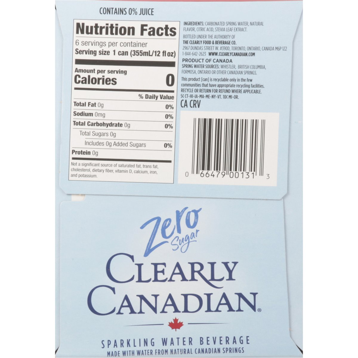 Made with water from natural Canadian springs. Flavored with other natural flavors. 0 calories sugar. Zero sugar. Bold flavor is in our nature. www.clearlycanadian.com. how2recycle.info. 1-844-642-2623; www.clearlycanadian.com. This product [can] is recyclable only in the few communities that have appropriate recycling facilities. Recycle or return for refund where applicable. Bottled in Canada. Product of Canada. Spring Water Sources: Whistler, British Columbia, Formosa, Ontario or other Canadian Springs.