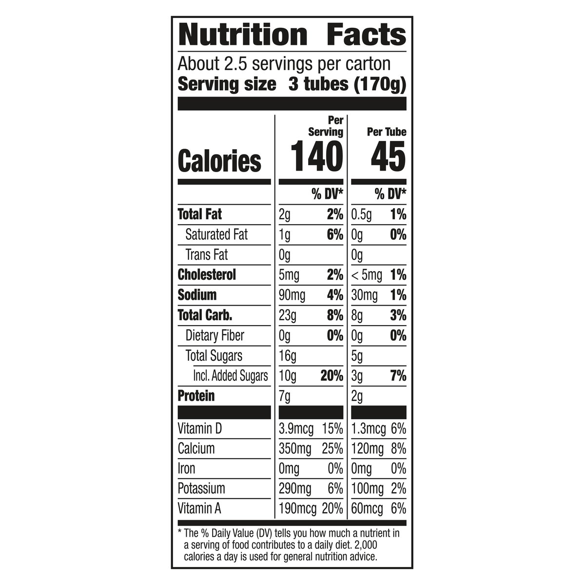 Flavored with other natural flavor. Per Tube: 45 calories; 0 g sat fat (0% DV); 30 mg sodium (1% DV); 3 g added sugars (7% DV). Lowfat. Gluten free. Vitamins A & D, with calcium. Ingredients derived from a bioengineered source. Learn more at Ask.GeneralMills.com. No added color. No artificial flavors. No high fructose corn syrup. Grade A. www.Yoplait.com. how2recycle.info. Comments? Save tube, box and call 1-800-754-3517; www.Yoplait.com. Box Tops for Education: Download the app. Scan your receipt. Earn cash for schools.