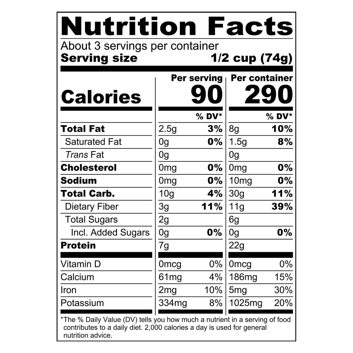 Per 1/2 Cup Serving: 90 calories; 0 g sat fat (0% DV); 0 mg sodium (0% DV); 2 g sugars; 3 g fiber (11% DV). Non GMO. Farm Favorites. www.pictsweetfarms.com.