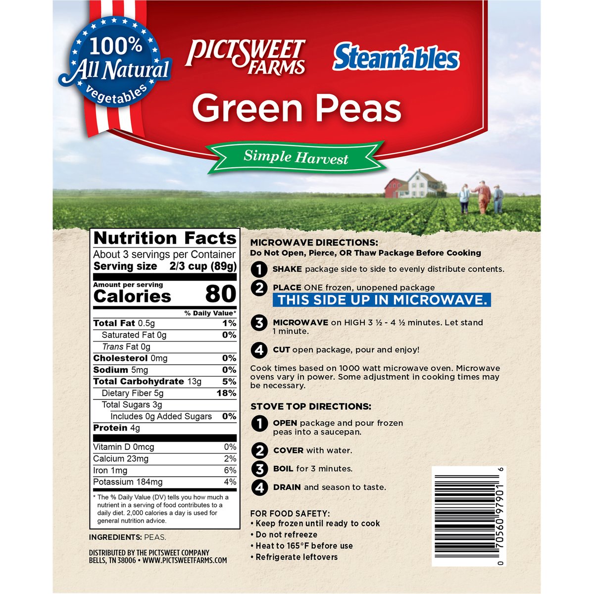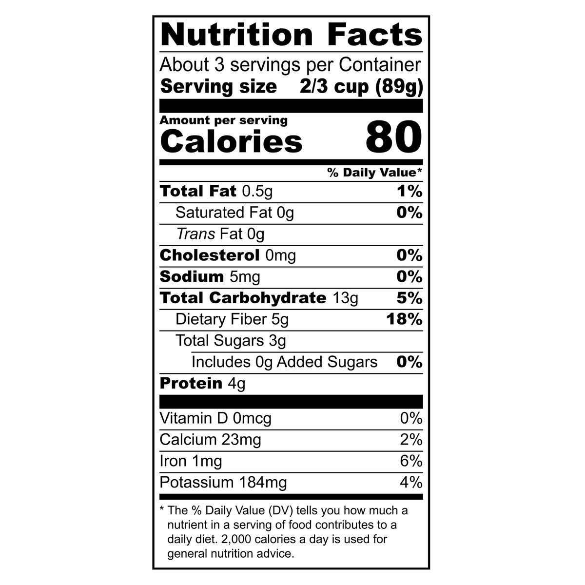 Per 2/3 Cup Serving: 80 calories; 0 g sat fat (0% DV); 5 mg sodium (0% DV); 3 g sugars; 5 g fiber (18% DV). Non GMO. Simple harvest. www.pictsweetfarms.com.