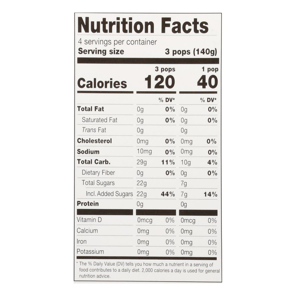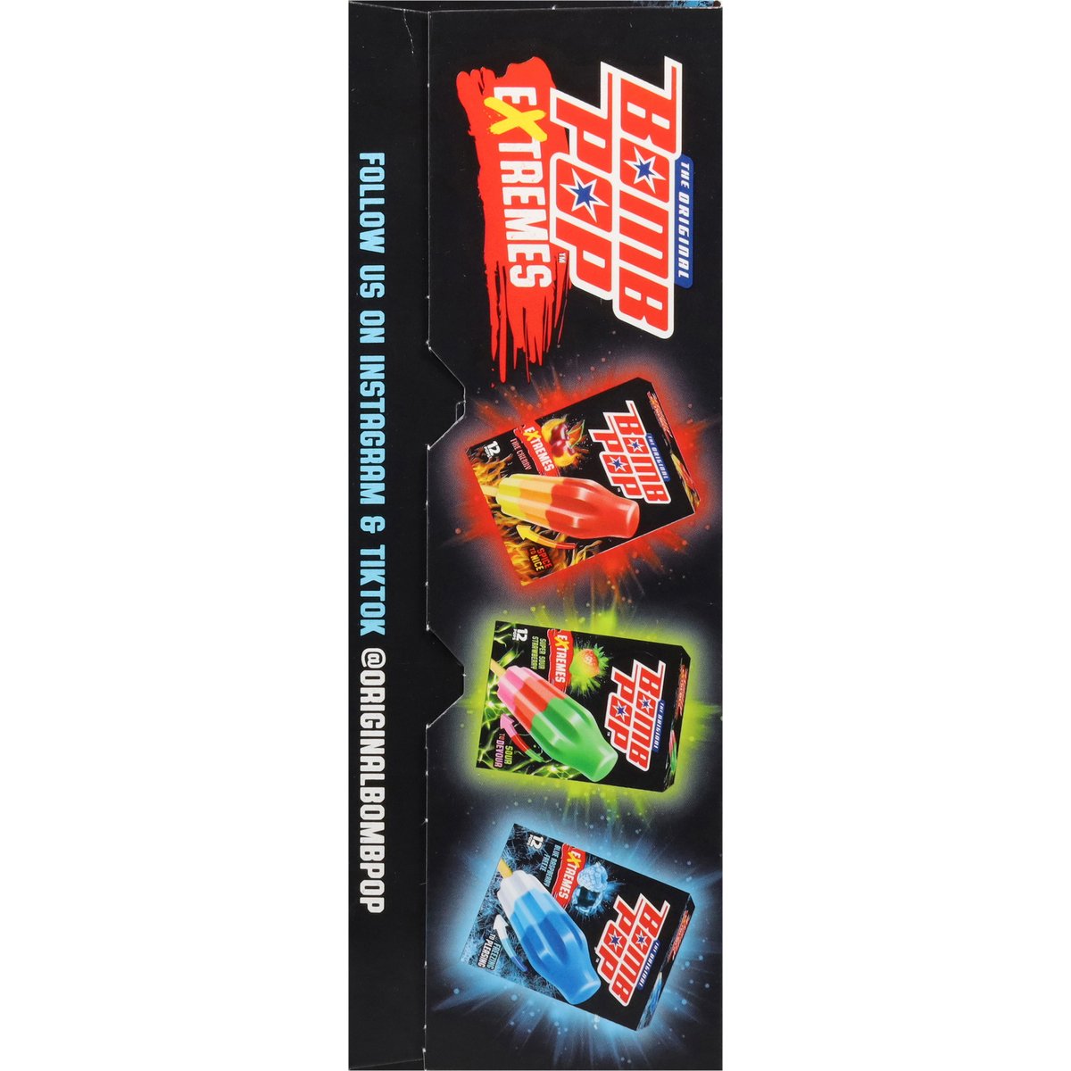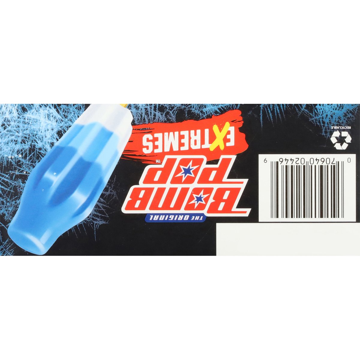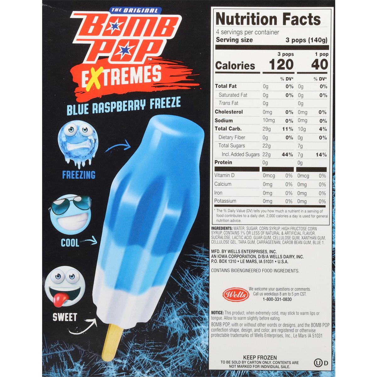 Naturally and artificially flavored frozen confection. Contains bioengineered food ingredients. Freezing to pleasing. Freezing. Cool. Sweet. To be sold by carton only. Contents are not marked for individual sale. Follow us on Instagram & TikTok (at)originalbombpop. We welcome your questions or comments. Call us weekdays 8am to 5pm CST. 1-800-331-0830. Recyclable.