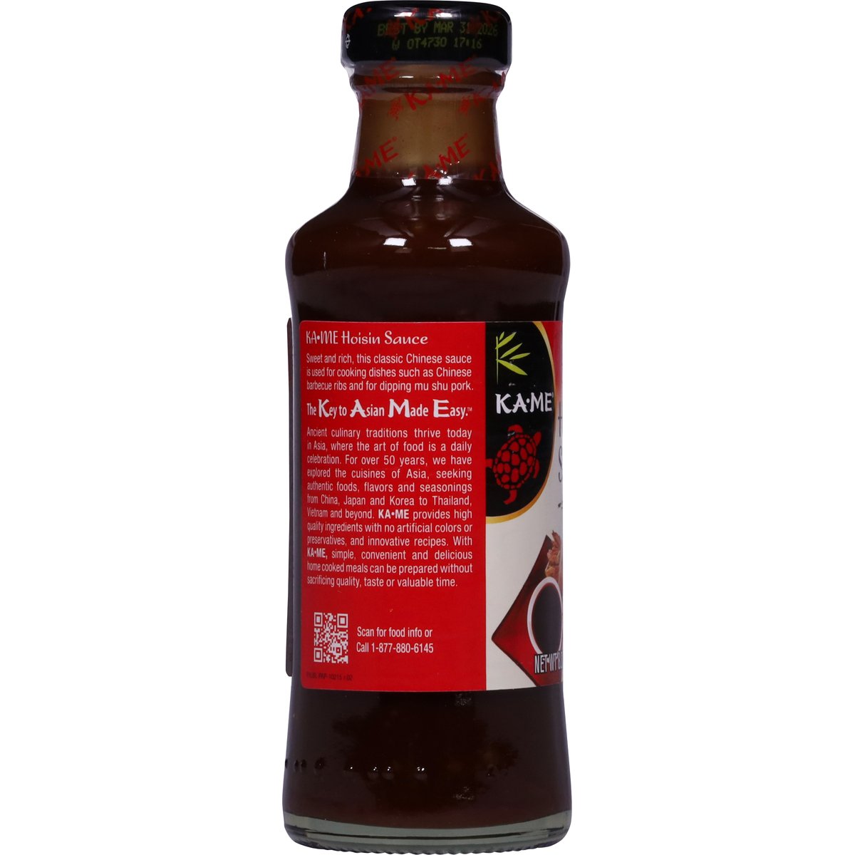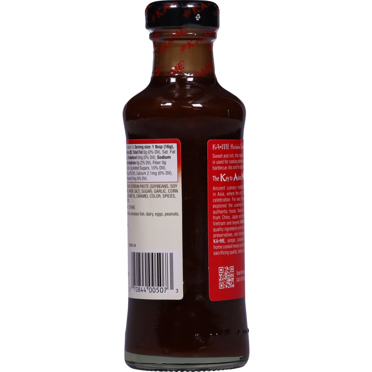 Sweet and rich, this classic Chinese sauce is used for cooking dishes such as Chinese barbecue ribs and for dipping mu shu pork. The key to Asian made easy. Ancient culinary traditions thrive today in Asia, where the art of food is a daily celebration. For over 50 years, we have explored the cuisines of Asia, seeking authentic foods, flavors and seasonings from China, Japan and Korea to Thailand, Vietnam and beyond. KA-ME provides high quality ingredients with no artificial colors or preservatives, and innovative recipes. With KA-ME, simple, convenient and delicious home cooked meals can be prepared without sacrificing quality, taste or valuable time. panosbrands.com. Scan for food info or call 1-877-880-6145. Product of Thailand.