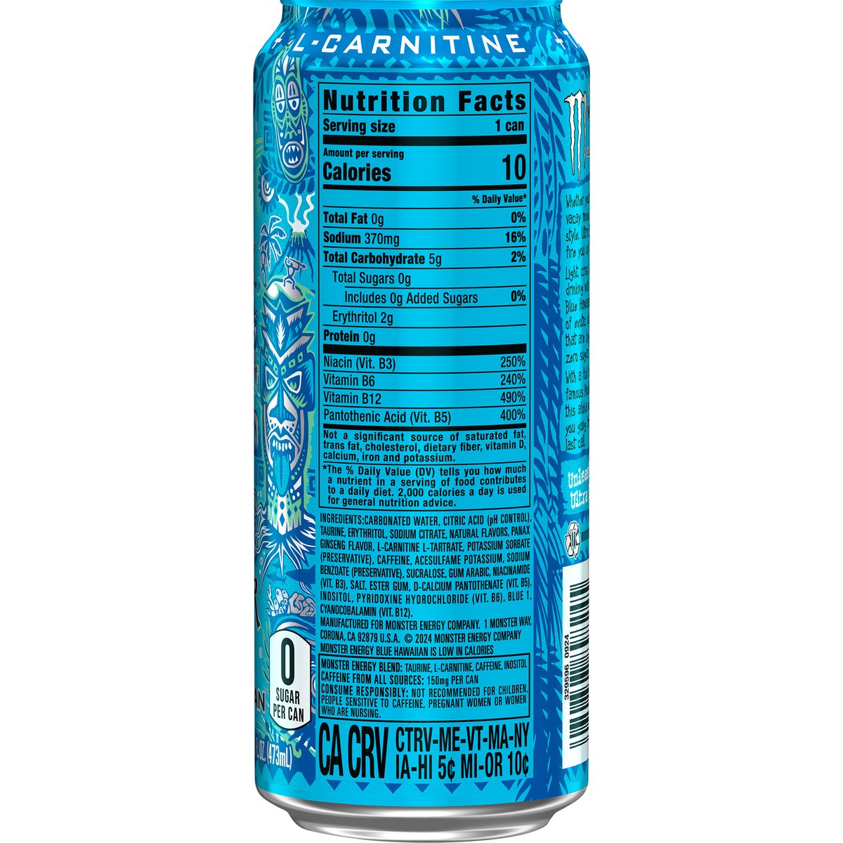 0 sugar per can. Zero sugar. Caffeine from All Sources: 150 mg per can. Monster Energy Blue Hawaiian is low in calories. Taurine + L-carnitin. Whether you're in beast mode, vacay mode, or just chillin' island style, Ultra Blue Hawaiian will fire you up to be your best! Light; crisp, and super easy drinking with a tropical tiki twist: Blue Hawaiian is a killer combo of exotic Polynesian fruit flavors that are big on taste, but with zero sugar. With a full load of our world-famous Monster Energy Blend this aloha energy will keep you goin' and the shakas flown' from dawn patrol to last call. Unleash the ultra beast! monsterenergy.com.