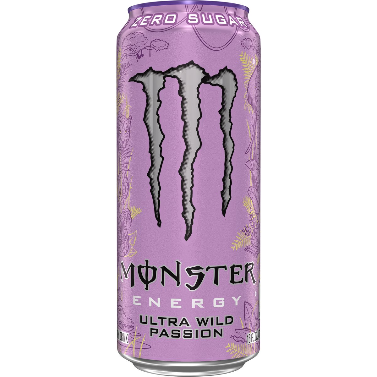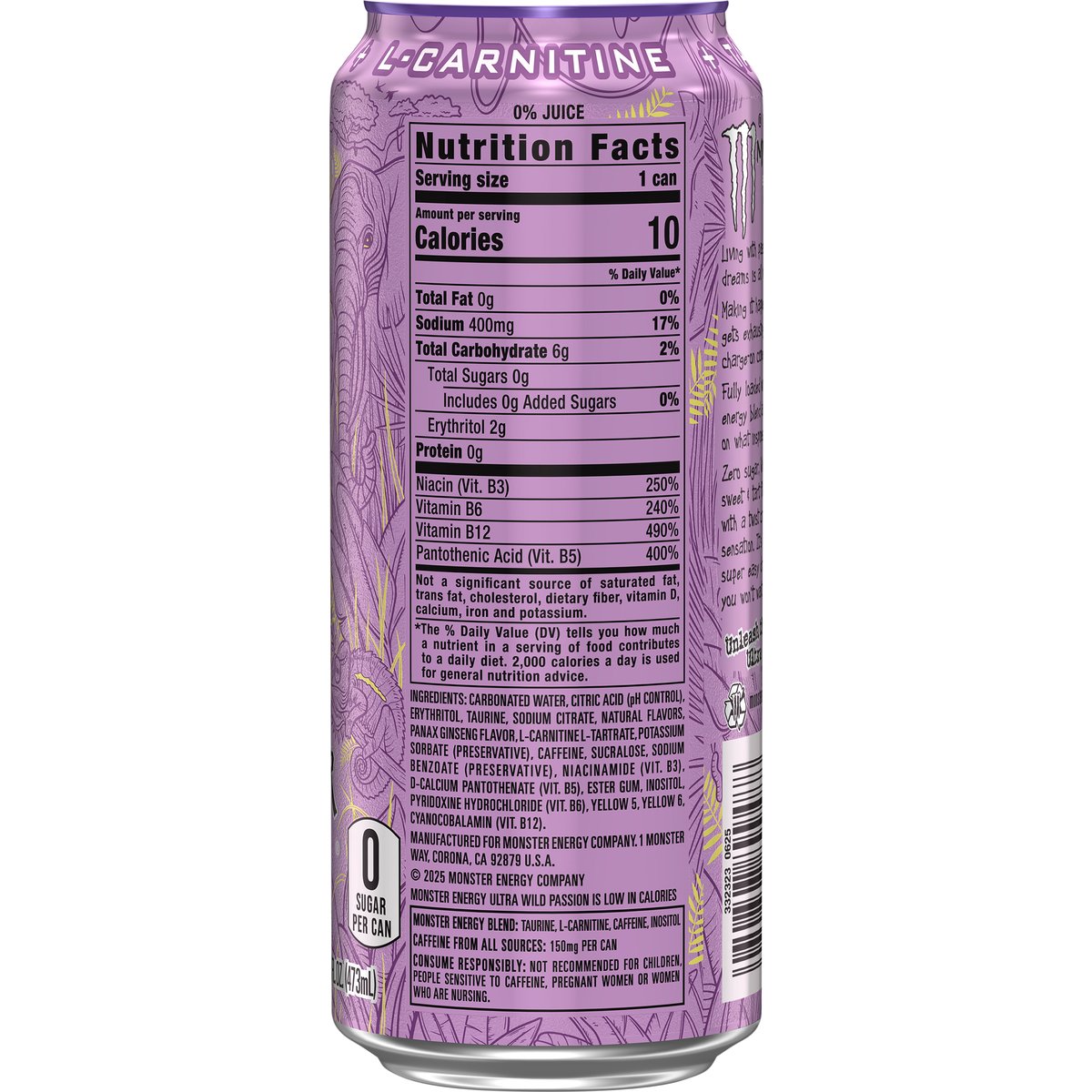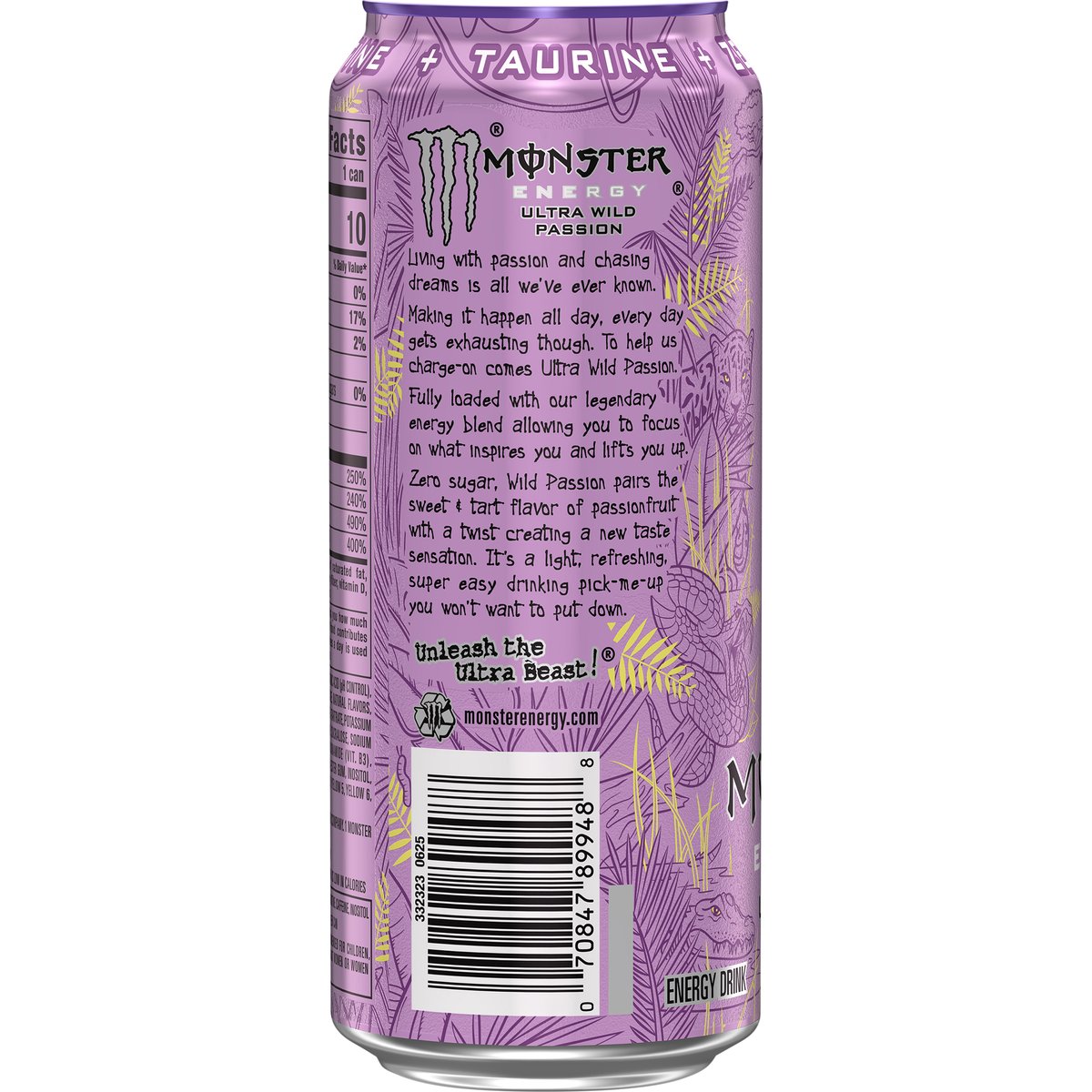 0 g sugar per can. Zero sugar + L-carnitine + taurine. Monster Energy Ultra Wild Passion is low in calories. Living with passion and chasing dreams is all we've ever known. Making it happen all day, every day gets exhausting though. To help us charge-on comes ultra wild passion. Fully loaded with our legendary v tenergy blend allowing you to focus on what inspires you and lifts you up.) zero sugar, wild passion pairs the sweet tart flavor of passionfruit with a twist creating a new taste sensation. It's a light, refreshing, super easy drinking pick-me-up (you won't want to put down. Unleash the ultra beast! monsterenergy.com.