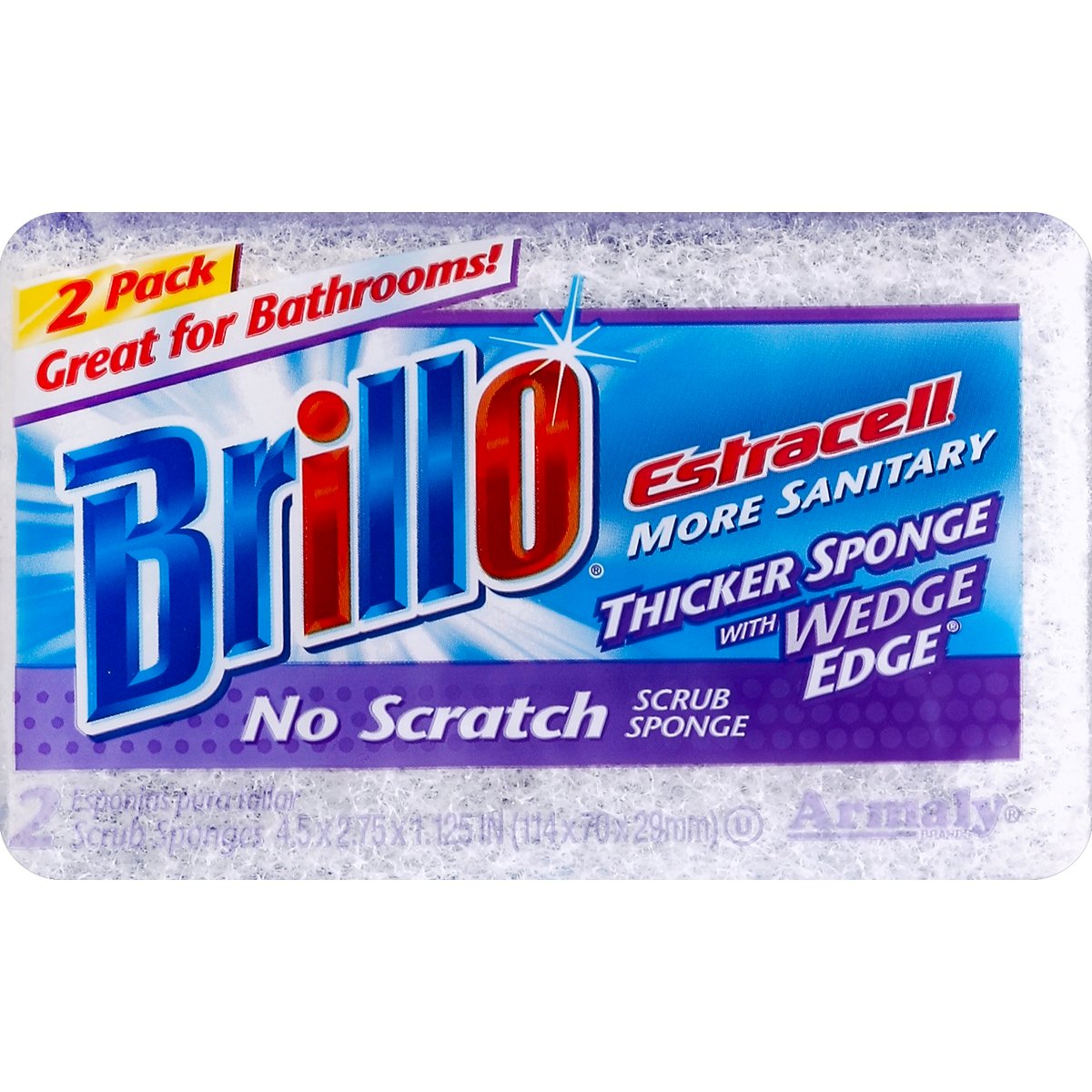 4.5 x 2.75 x 1.125 inches (114 x 70 x 29 mm). 2 pack. Great for bathrooms! Estracell: More sanitary. Thicker sponge with wedge edge. Reaches deeper. Quality tested Good Housekeeping: Since 1909. Limited warranty to consumers. Replacement or refund if defective. No-Scratch scrub material is designed to clean delicate surfaces including porcelain, non-stick cookware, glassware and counter tops. Some plastic and painted surfaces may be damaged by abrasives. Test in an inconspicuous area. Armaly brands - Helping America clean since 1908. Questions? 1-888-4-Armaly www.Brillo.com. Facebook. Twitter. Made in the USA.