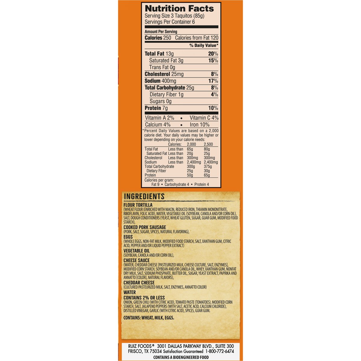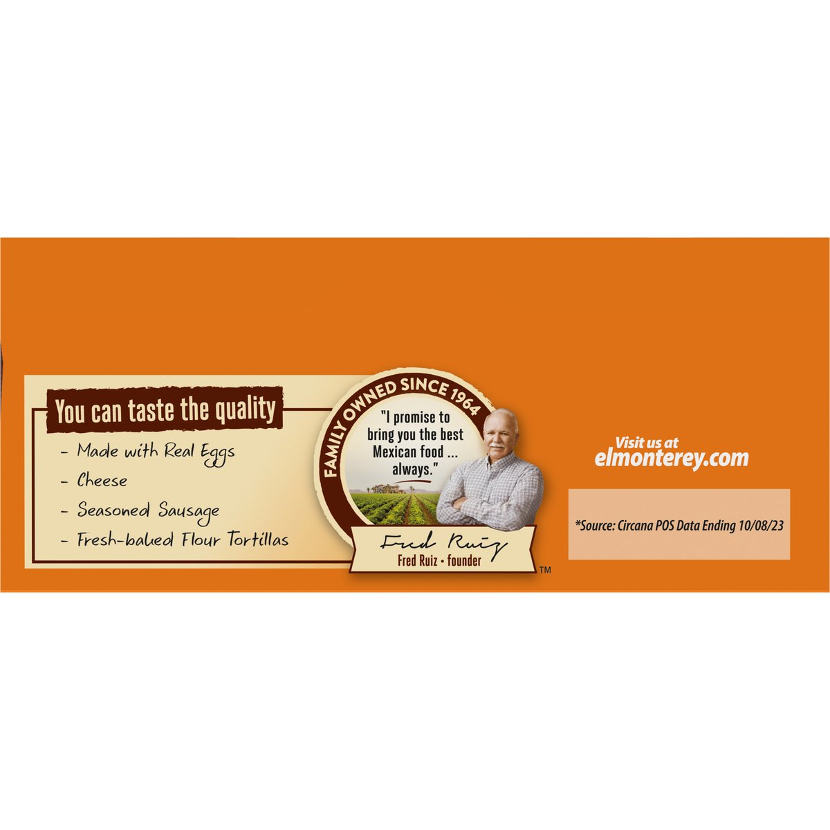 Made with real eggs. 7 g protein per serving. Contains a bioengineered food. Family owned since 1964. Fresh baked tortilla. Cook & serve. You can taste the quality. I promise to bring you the best Mexican food always. Fred Ruiz - founder. Satisfaction guarantee 1-800-772-6474. U.S. inspected and passed by Department of Agriculture. elmonterey.com. Visit us at elmonterey.com. Paperboard packaging recyclable.