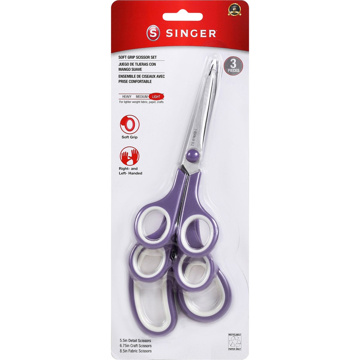 World's No. 1 sewing brand. For lighter weight fabric, paper, crafts. Soft grip. Right- and left- handed. Includes: 5.5 in detail scissors. 6.75 in craft scissors. 8.5 in fabric scissors. Soft grip handles. Right- or left-handed use. Stainless steel blades. Certified Singer Accessory. singer.com. Recyclable paper only. Made in China.