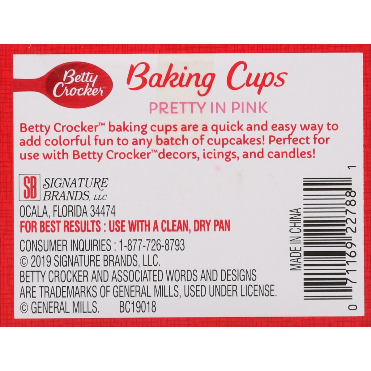 Betty Crocker baking cups are a quick and easy way to add colorful fun to any batch of cupcakes! Perfect for use with Betty Crocker decors, icings, and candles! Consumer Inquiries: 1-877-726-8793. Made in China.