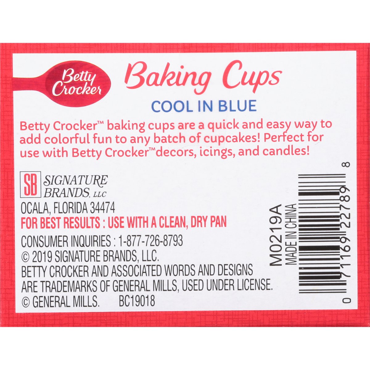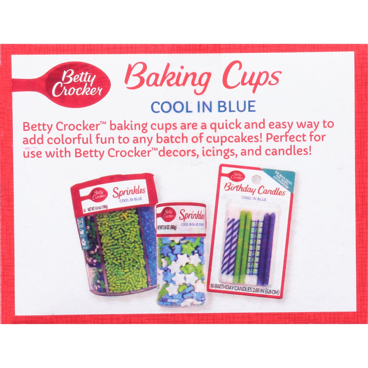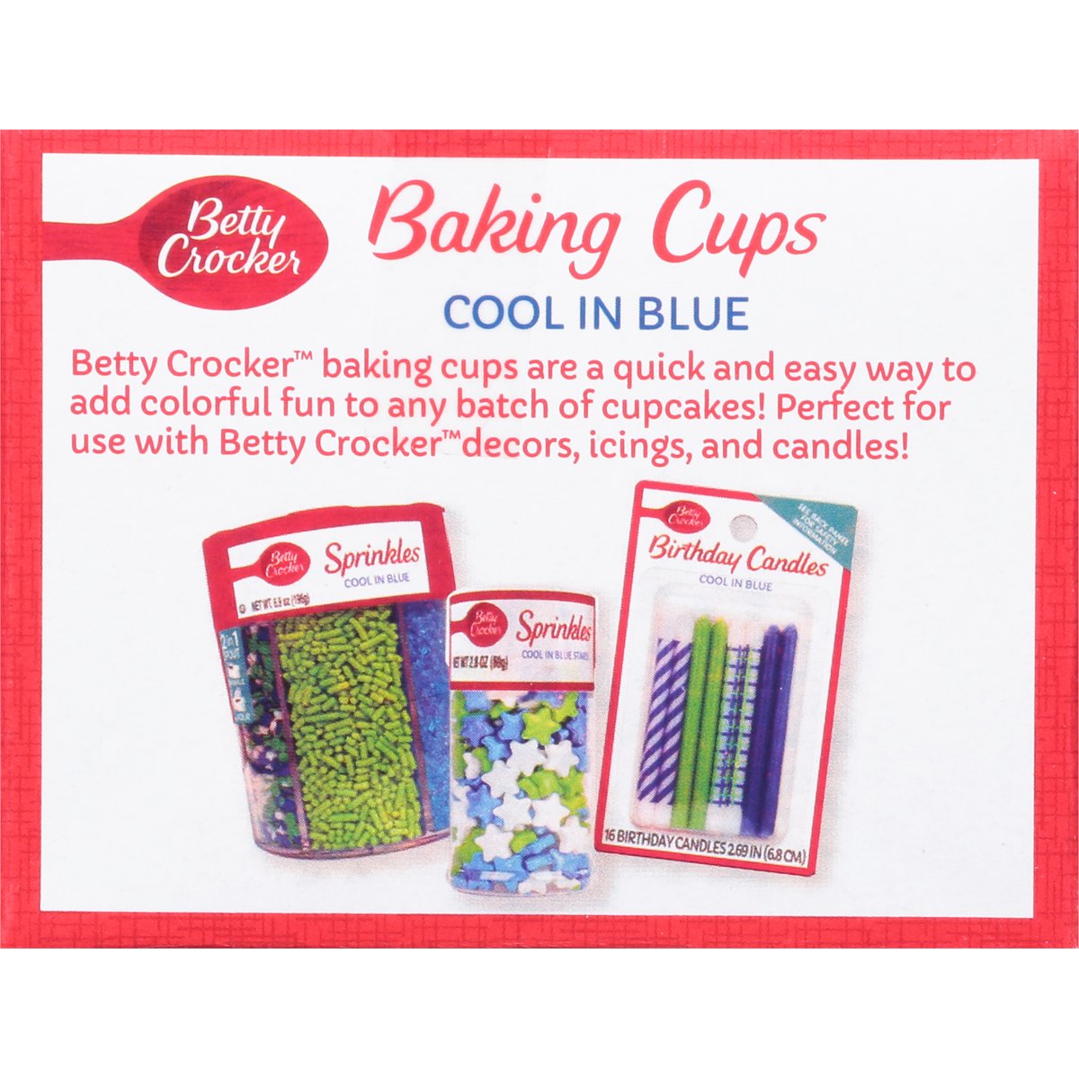 Betty Crocker baking cups are a quick and easy way to add colorful fun to any batch of cupcakes! Perfect for use with Betty Crocker decors, icings, and candles! Consumer Inquiries: 1-877-726-8793. Betty Crocker Sprinkles: Cool in Blue; Cool in Blue Stars, Birthday candles: Cool in Blue. Made in China.