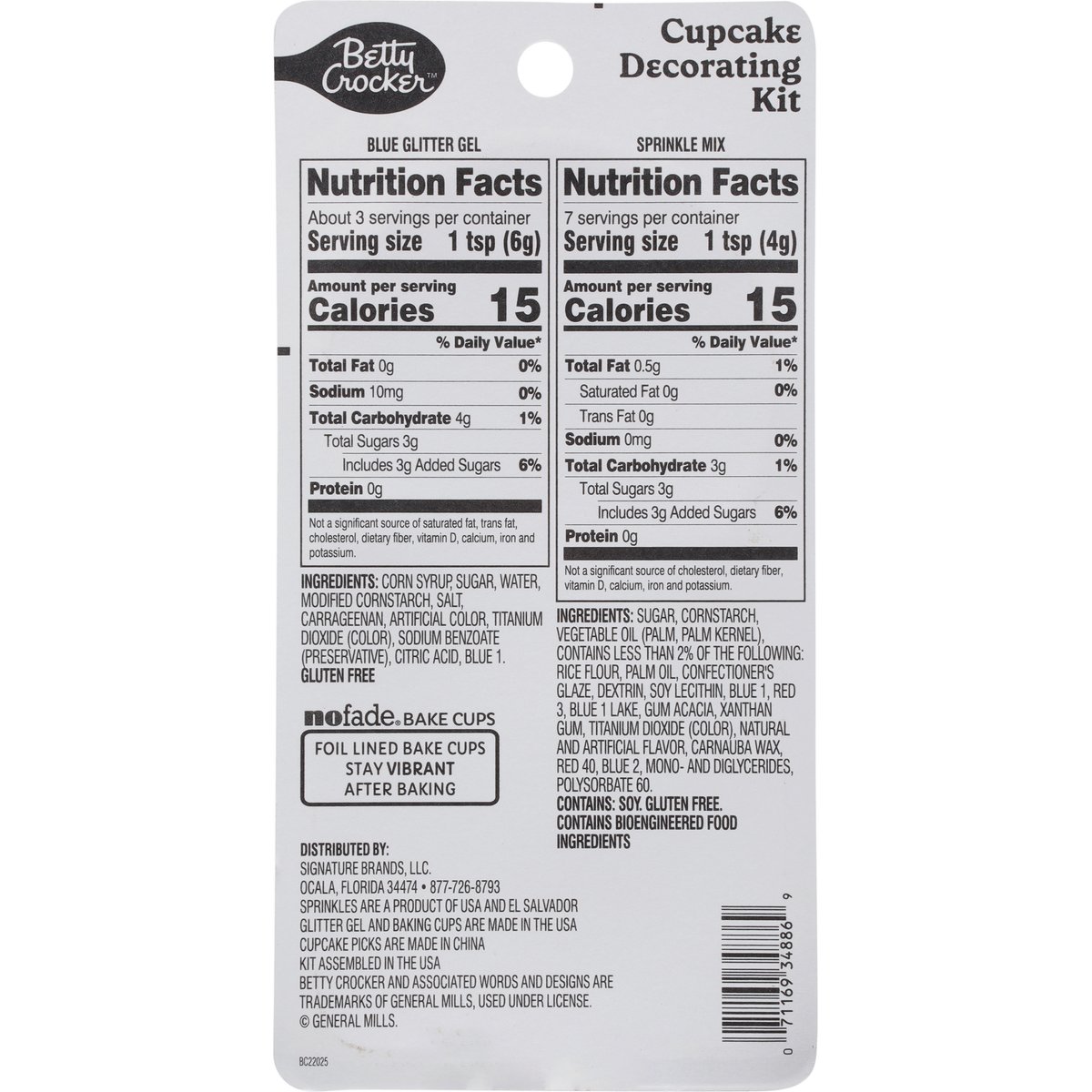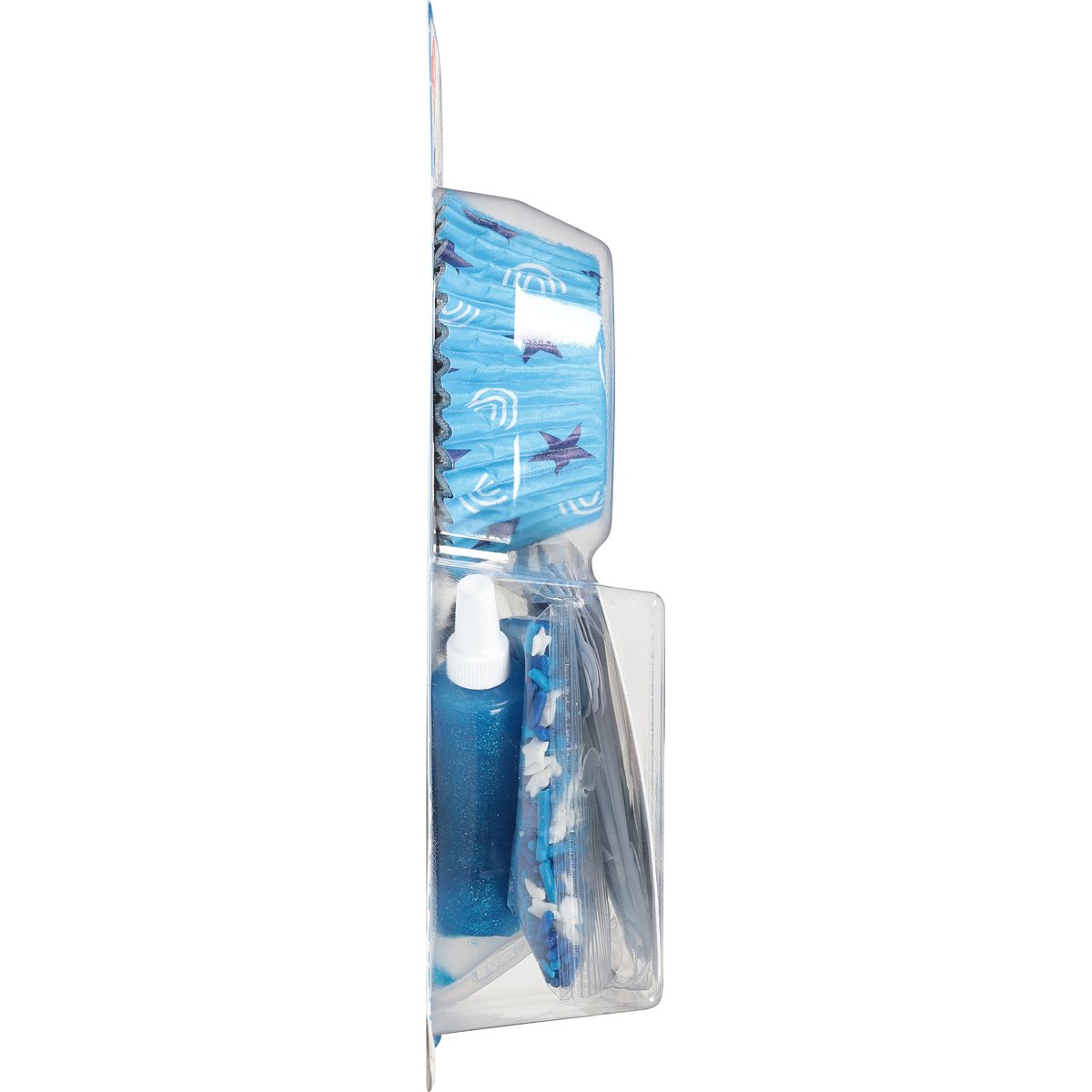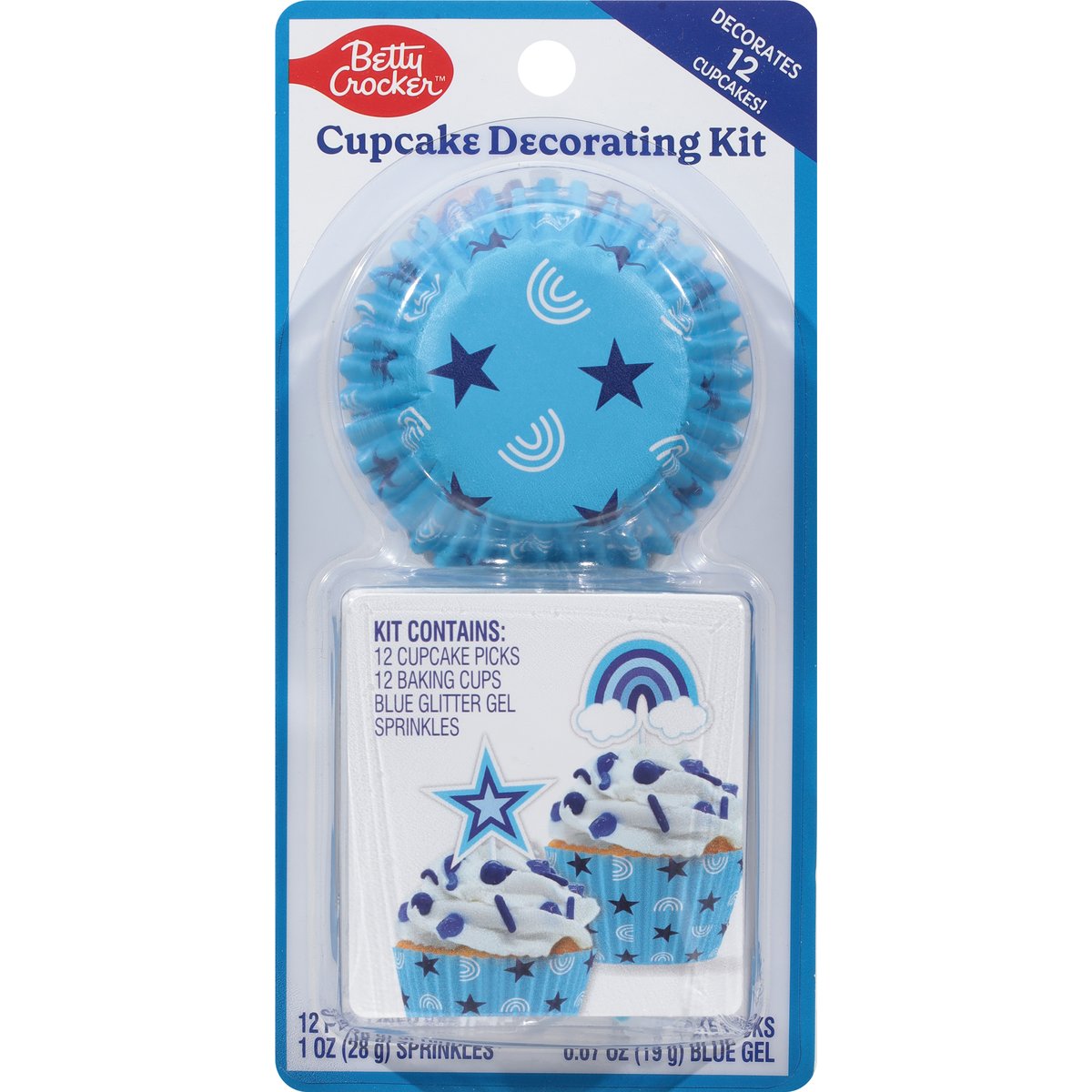 Kit Contains: 12 cupcake picks. 12 baking cups blue glitter gel sprinkles. 12 foil lined baking cups. 1 oz (8 g) sprinkles. 12 cupcake picks. 0.67 oz (19 g) blue gel. Gluten free. Sprinkle Mix: Contains bioengineered food ingredients. Decorates 12 cupcakes! No fade bake cups. Foil lined bake cups stay vibrant after baking. Sprinkles are product of USA and El Salvador. Glitter gel and baking cups are made in the USA. Cupcake picks are made in China. Kit assembled in the USA.