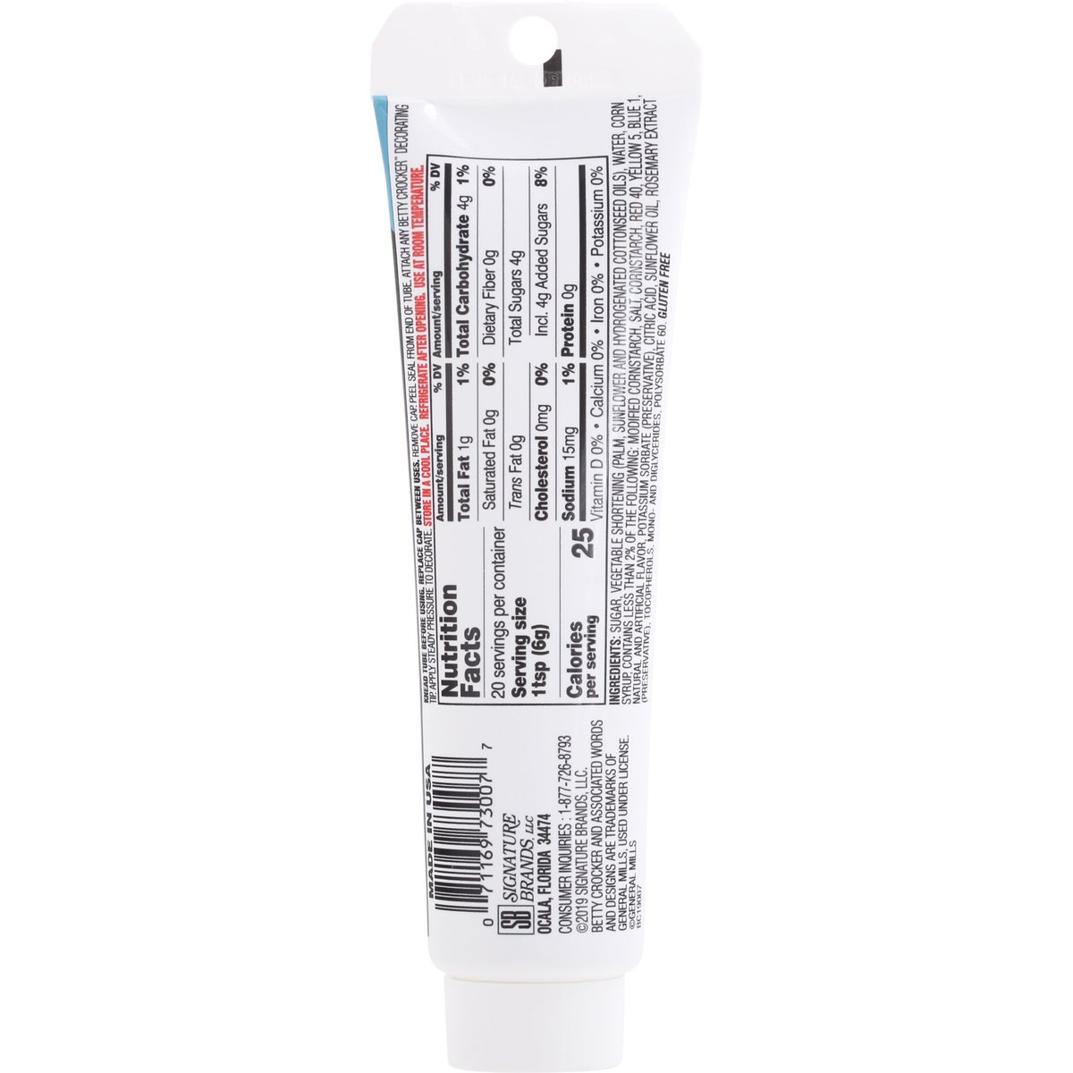 Gluten free. Use with Betty Crocker decorating tips. Tastes delicious! Consumer Inquiries: 1-877-726-8793. Made in USA.