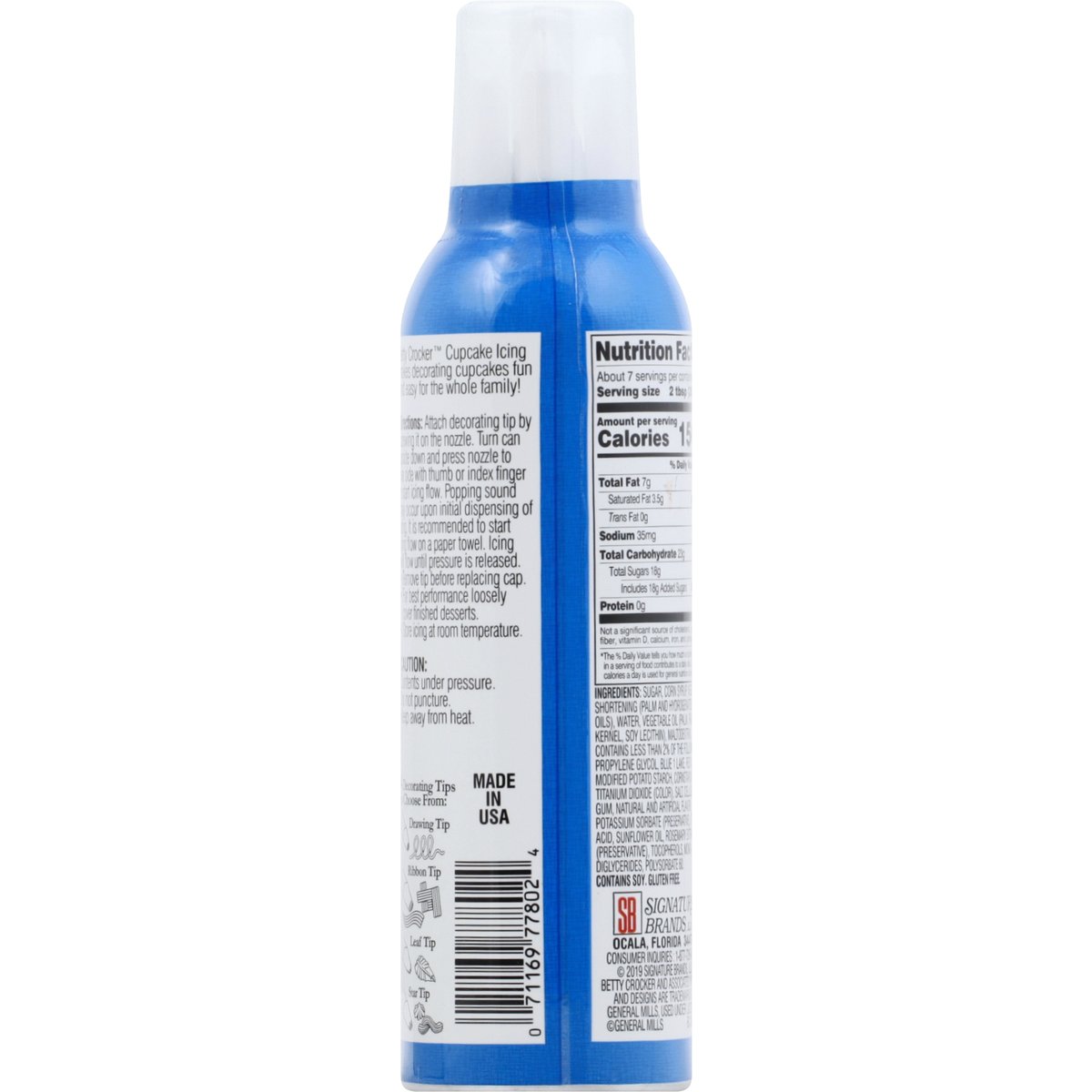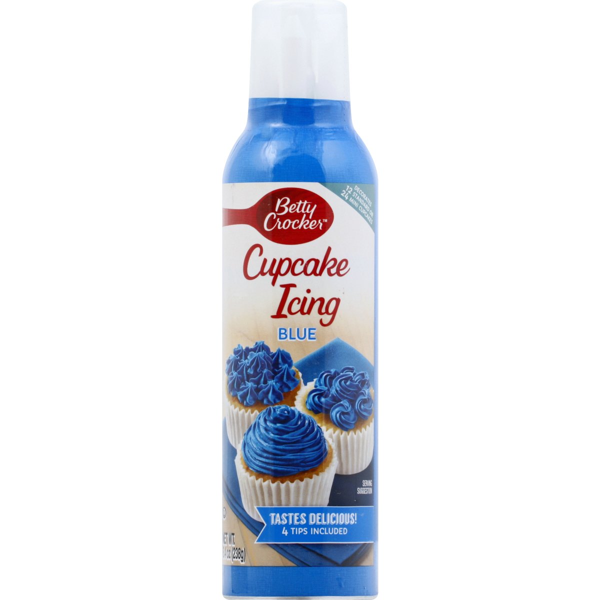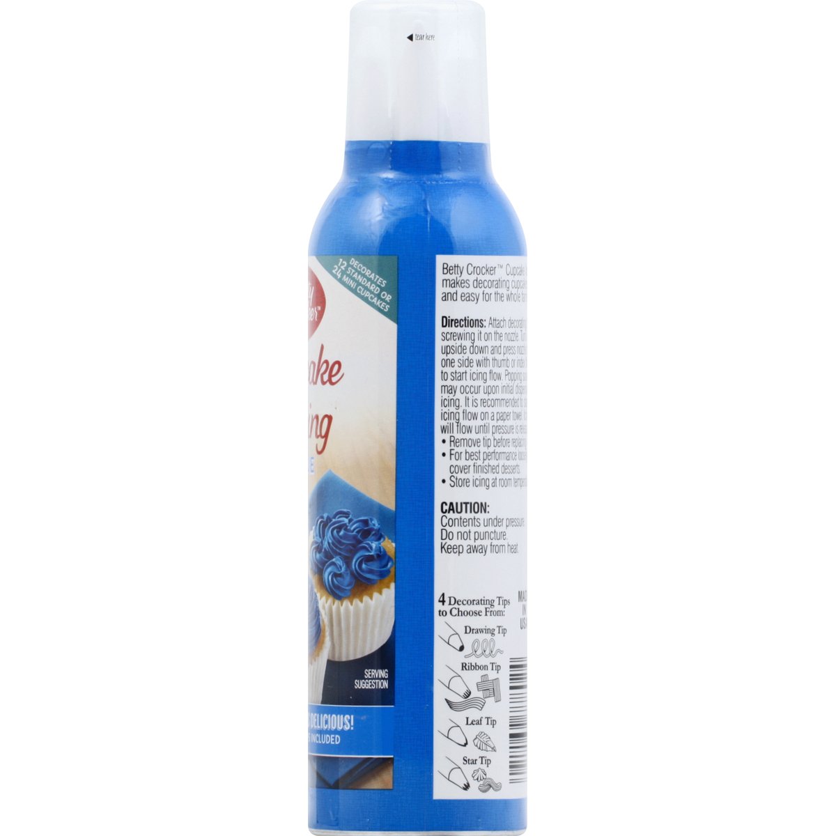 Tastes delicious! 4 Tips included. Decorates 12 standard or 24 mini cupcakes. 4 Decorating tips to choose from: Drawing tip; Ribbon tip; Leaf tip; Star tip. Betty Crocker Cupcake Icing makes decorating cupcakes fun and easy for the whole family! Consumer Inquiries: 1-877-726-8793. Made in USA.