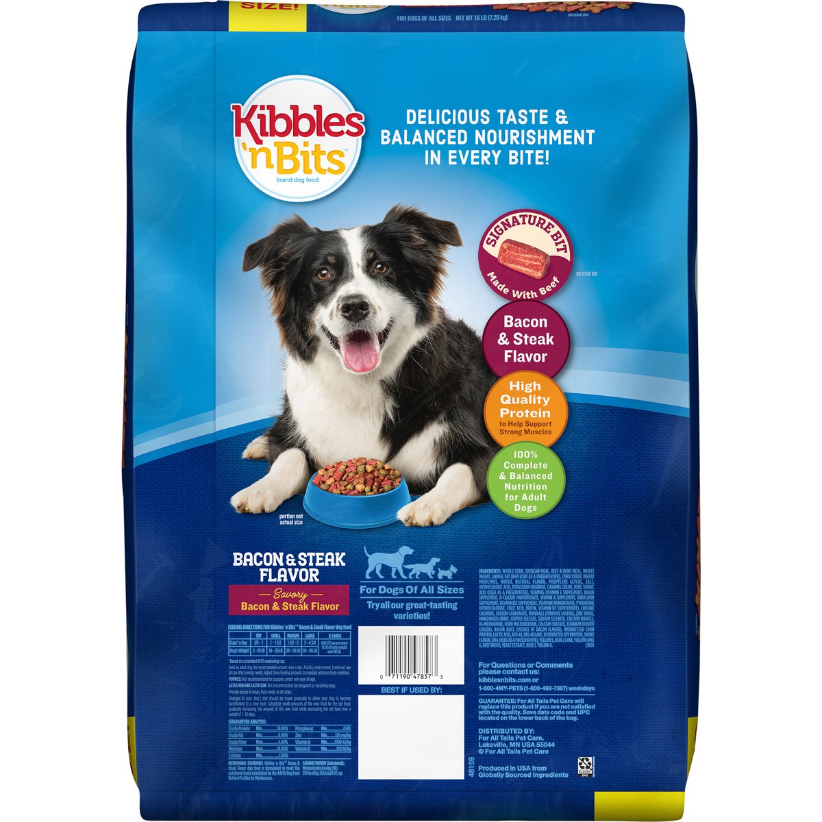 Calorie Content (Calculated): Metabolizable Energy (ME) 3110 kcal/kg; 366 kcal/8 OZ cup. Nutritional Statement: Kibbles 'n Bits Bacon & Steak Flavor dog food is formulated to meet the nutritional levels established by the AAFCO Dog Food Nutrient Profiles for Maintenance. 100% complete and balanced nutrition for adult dogs. Kibbles 'n Bits brand dog food. Signature bit. Delicious taste & balanced nourishment in every bite! High quality protein to help support strong muscles. For dogs of all sizes. Guarantee: For All Tails Pet Care will replace this product if you are not satisfied with the quality. Save date code and UPC located on the lower back of the bag. kibblesnbits.com. how2recycle.info. For Questions or Comments please contact us: kibblesnbits.com or 1-800-4MY-PETS (1-800-469-7387) weekdays. Try all our great-tasting varieties! Produced in USA from globally sourced ingredients.