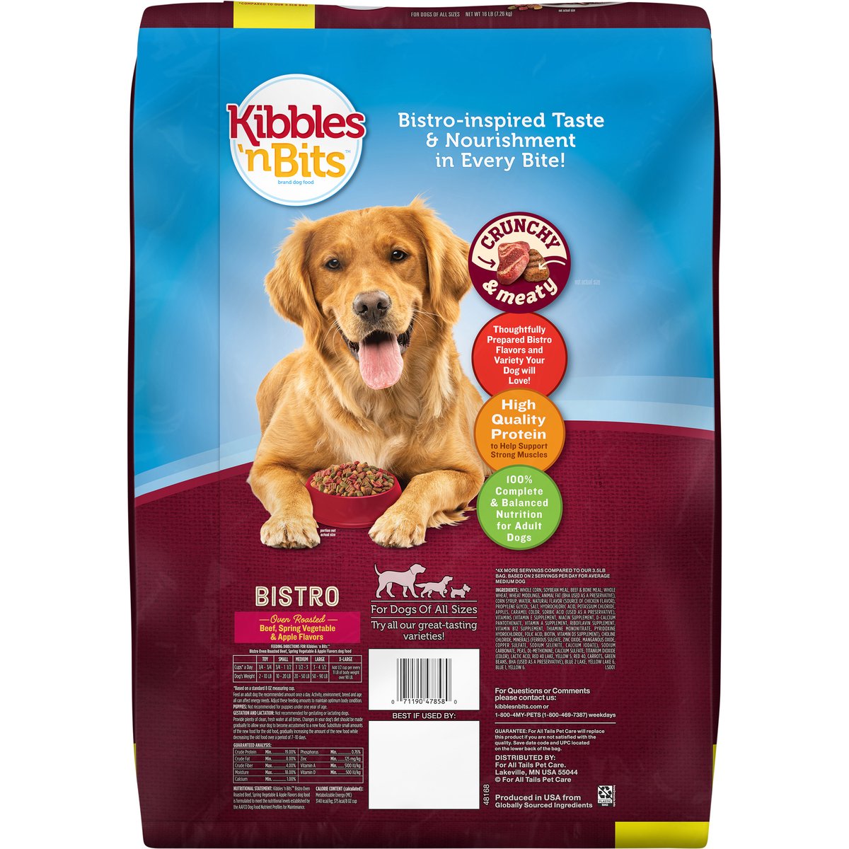 Guaranteed Analysis Calorie Content (calculated): Metabolizable Energy (ME) 3140 kcal/kg; 375 kcal/8 oz cup. Nutritional Statement: Kibbles 'n Bits Bistro Oven Roasted Beef, Spring Vegetable & Apple Flavors dog food is formulated to meet the nutritional levels established by the AAFCO Dog Food Nutrient Profiles for Maintenance. Oven roasted beef, spring vegetable & apple flavors. Crunchy & meaty. 100% complete and balanced nutrition for adult dogs. 4x more servings*. Bistro-inspired taste & nourishment in every bite! Thoughtfully prepared bistro flavors and variety your dog will love! High quality protein to help support strong muscles. 100% complete & balanced nutrition for adult dogs not actual size. * 4x more servings compared to our 3.5lb bag. Based on 2 servings per day for average medium dog. Guarantee: For All Tails Pet Care will replace this product if you are not satisfied with the quality. Save date code and UPC located on the lower back of the bag. kibblesnbits.com. how2recycle.info. For questions or comments please contact us: kibblesnbits.com or 1-800-4MY-PETS (1-800-469-7387) weekdays. For dogs of all sizes. Try all our great-tasting varieties. Produced in USA from globally sourced ingredients.