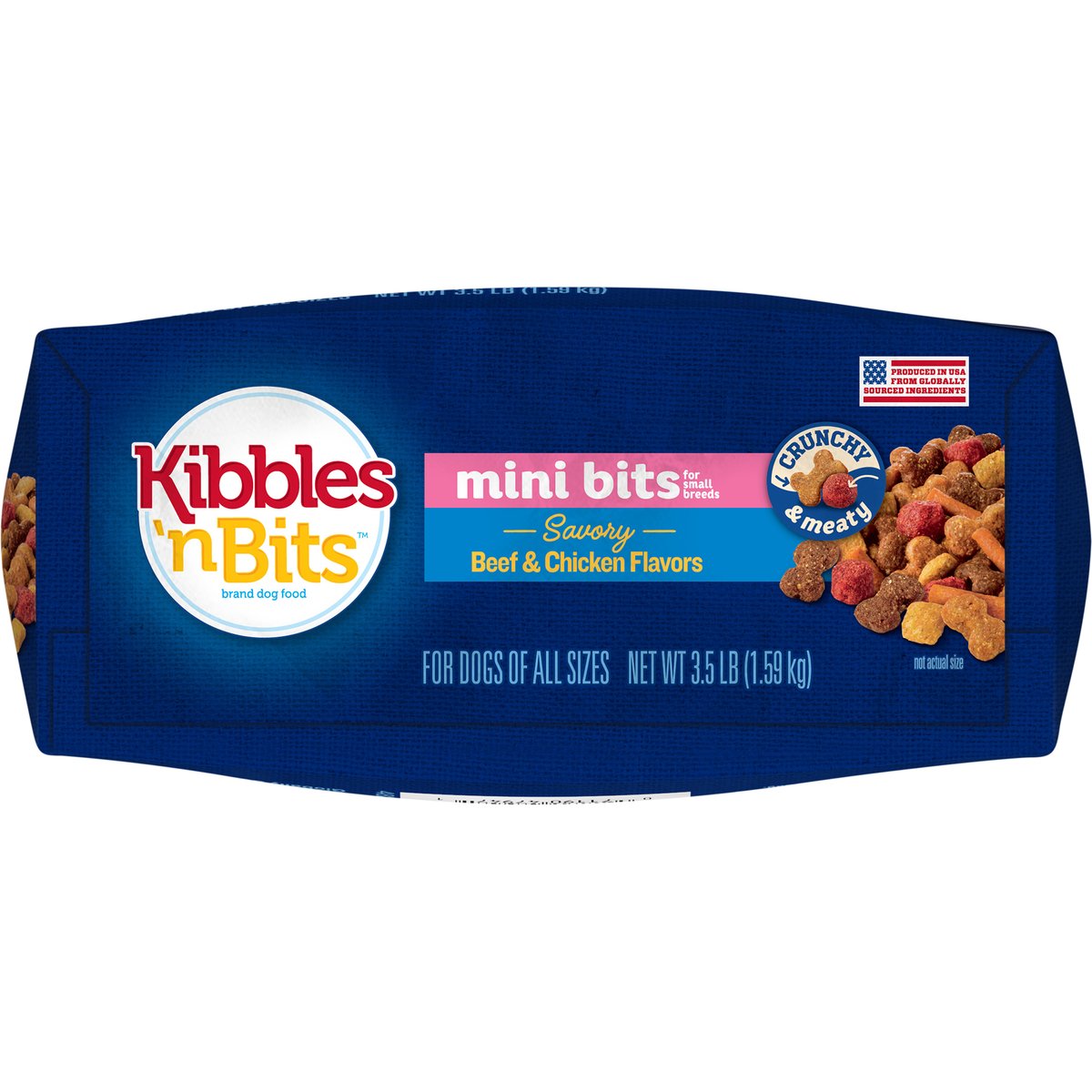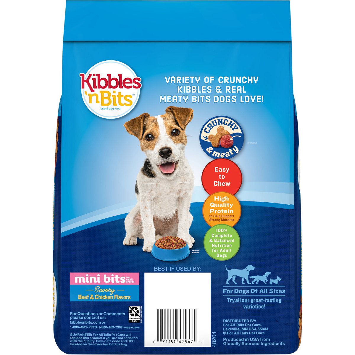 Calorie Content (Calculated): Metabolizable Energy (ME) 3100 kcal/kg; 360 kcal/8 oz cup. Nutritional Statement: Kibbles'n Bits Mini Bits Small Breed Savory Beef & Chicken Flavors dog food is formulated to meet the nutritional levels established by the AAFCO Dog Food Nutrient Profiles for Maintenance. 100% complete and balanced nutrition for adults dogs. Crunchy & meaty. Variety of crunchy Kibbles & real meaty bits dogs love! Easy to chew. High quality protein to help support strong muscles. 100% complete & balanced nutrition for adult dogs. Guarantee: For all tails pet care will replace this product if you are not satisfied with the quality. Save date code and UPC located on the lower back of the bag. kibblesnbits.com. how2recycle.info. For questions or comments please contact us: kibblesnbits.com or 1-800-5My-Pets (1-800-469-7387) weekdays. For dogs of all sizes. Try all our great-tasting varieties! Produced in USA from globally sourced ingredients.