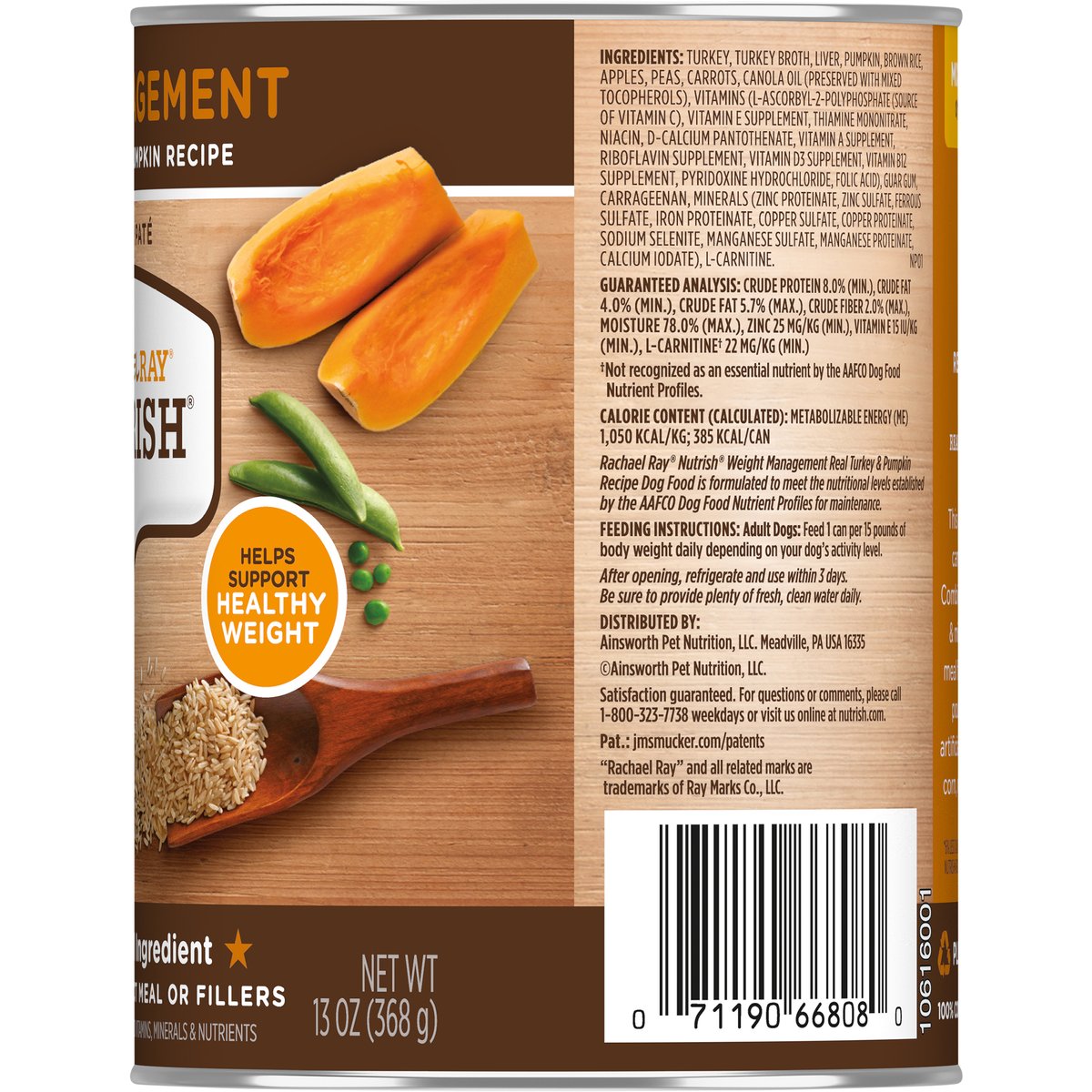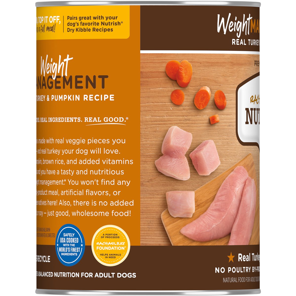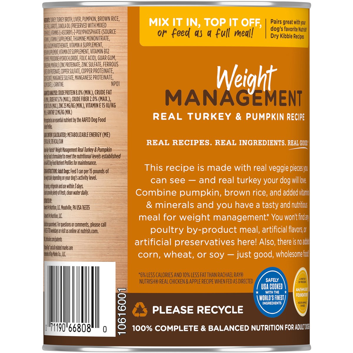 Natural food for adult dogs with added vitamins, minerals & nutrients. Helps support healthy weight. No poultry by-product meal or fillers. Real recipes. Real ingredients. Real good. This recipe is made with real veggie pieces you can see - and real turkey your dog will love. Combine pumpkin, brown rice, and added vitamins & minerals and you have a tasty and nutritious meal that helps support weight management (10% less calories than Racheal Ray Nutrish Real Chicken & Apple Recipe when fed as directed). You won't find any poultry by-product meal, artificial flavors, or artificial preservatives here! Also, there is no added corn, wheat, or soy - just good, wholesome food. 100% Complete & balanced nutrition for adult dogs. Satisfaction Guaranteed. For questions or comments, please call 1-800-323-7738 weekdays or visit us online at nutrish.com. nutrish.com. A portion of proceeds Rachael Ray Foundation helps animals in need. Please recycle. Safely USA cooked with the world's finest ingredients.