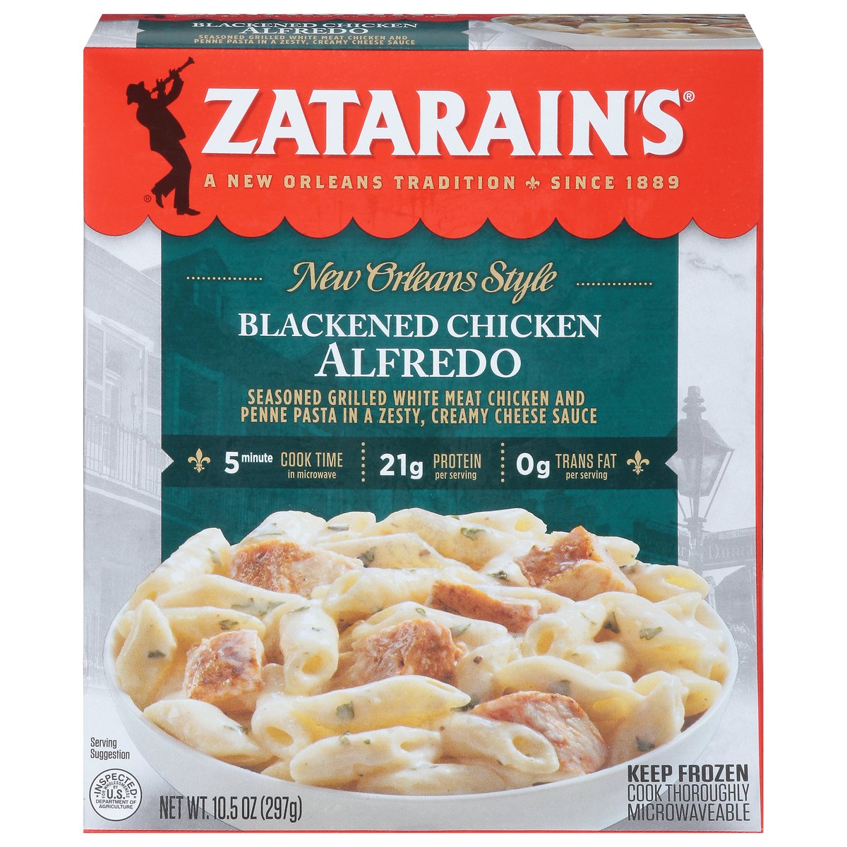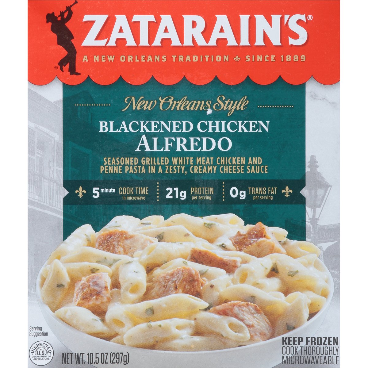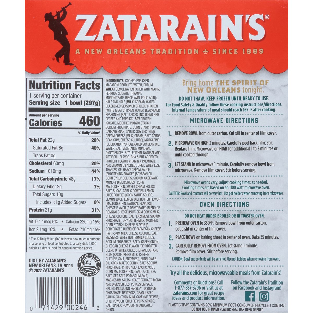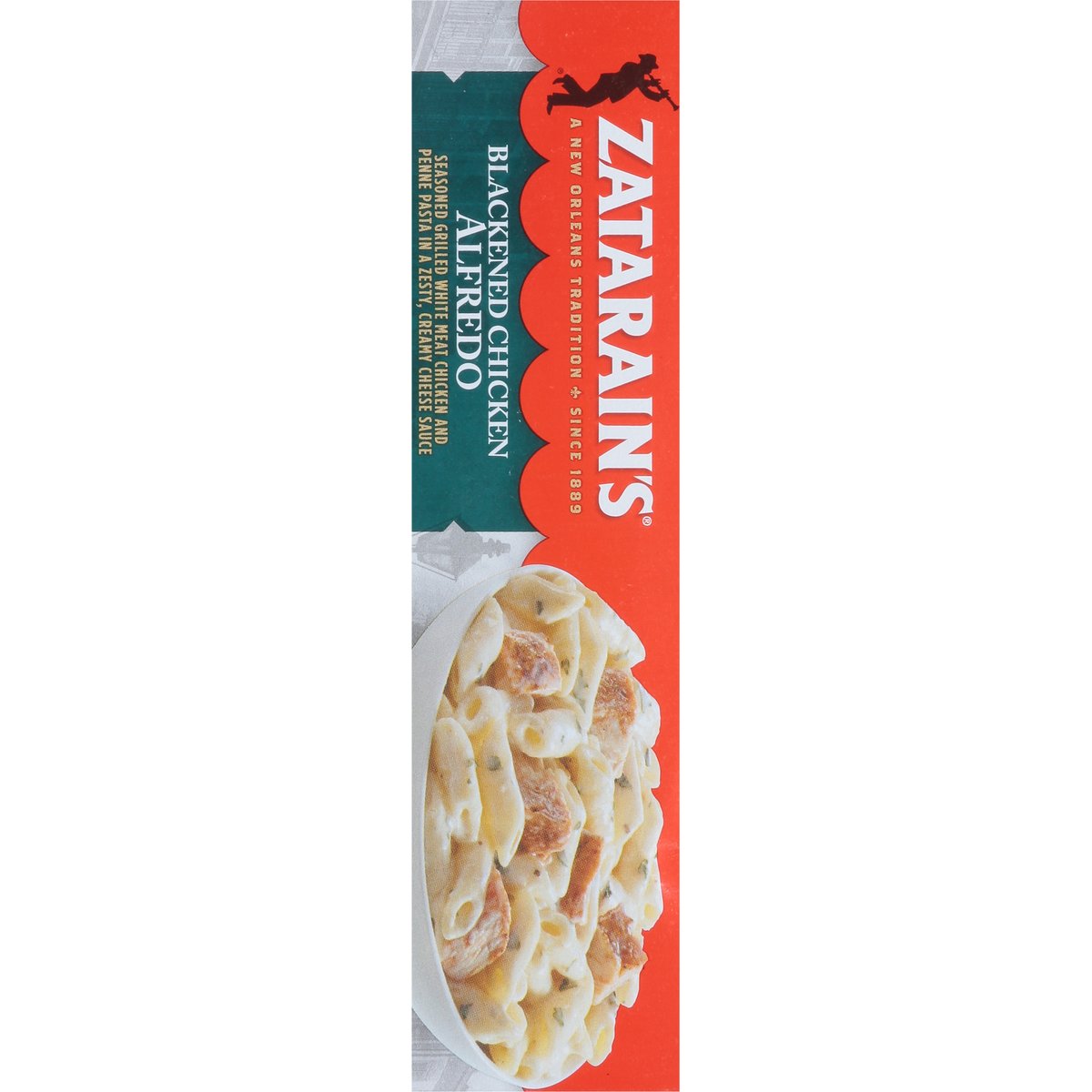 Seasoned grilled white meat chicken and penne pasta in a zesty, creamy cheese sauce. 21 g protein per serving; 0 g trans fat per serving. Derived from Bioengineering. A New Orleans tradition. Since 1889. 5 minute cook time in microwave. Microwaveable. Bring home the spirit of New Orleans tonight. Inspected for wholesomeness by U.S. Department of Agriculture. zatarains.com. Follow the Zatarain's Tradition on Facebook and Instagram! Facebook. Instagram. Comments or Questions? Call 1-877-837-3796 or visit us at zatarains.com for great recipe ideas and product information. Try all the delicious, microwaveable meals from Zatarain's. Plastic tray contains 20% minimum post consumer recycled content.
