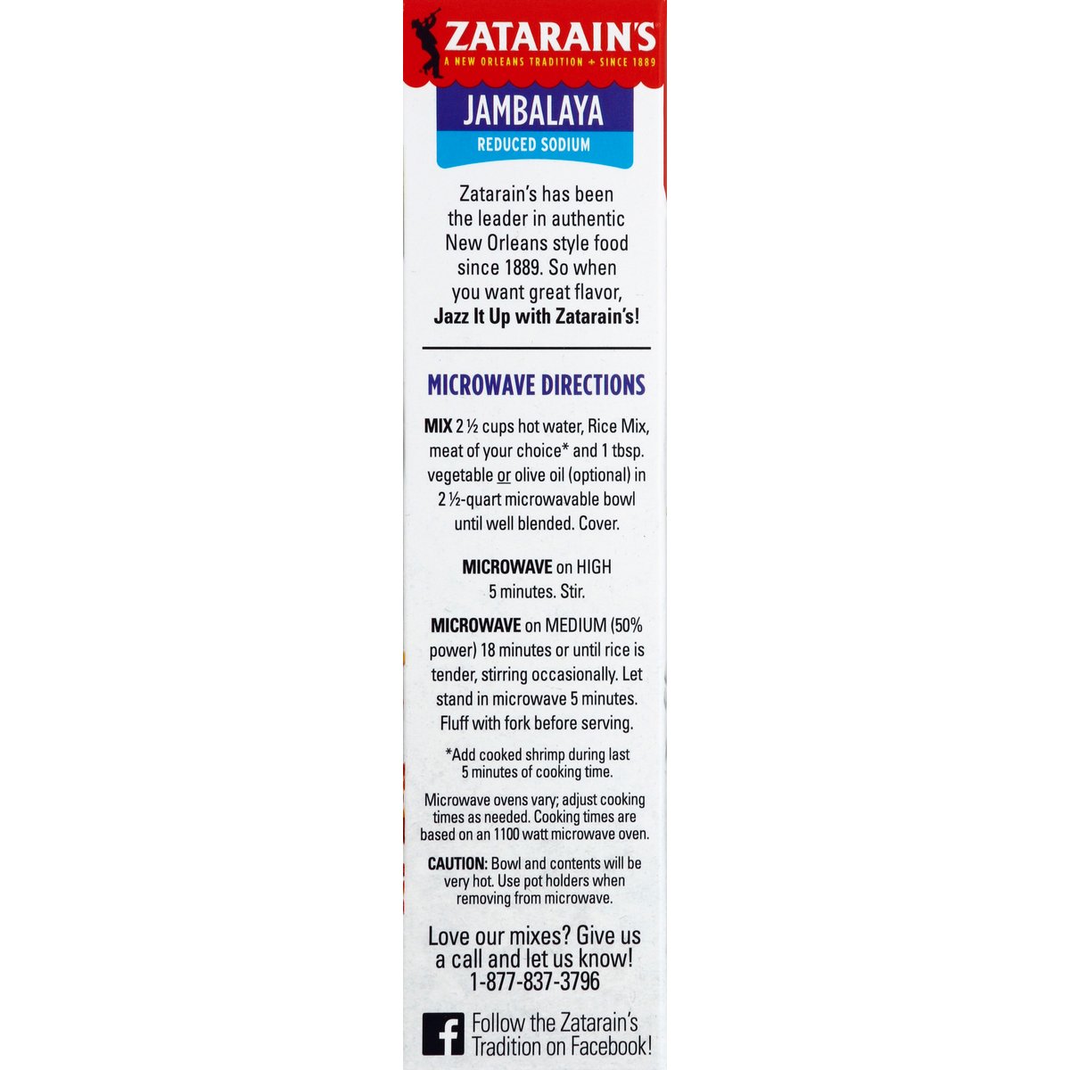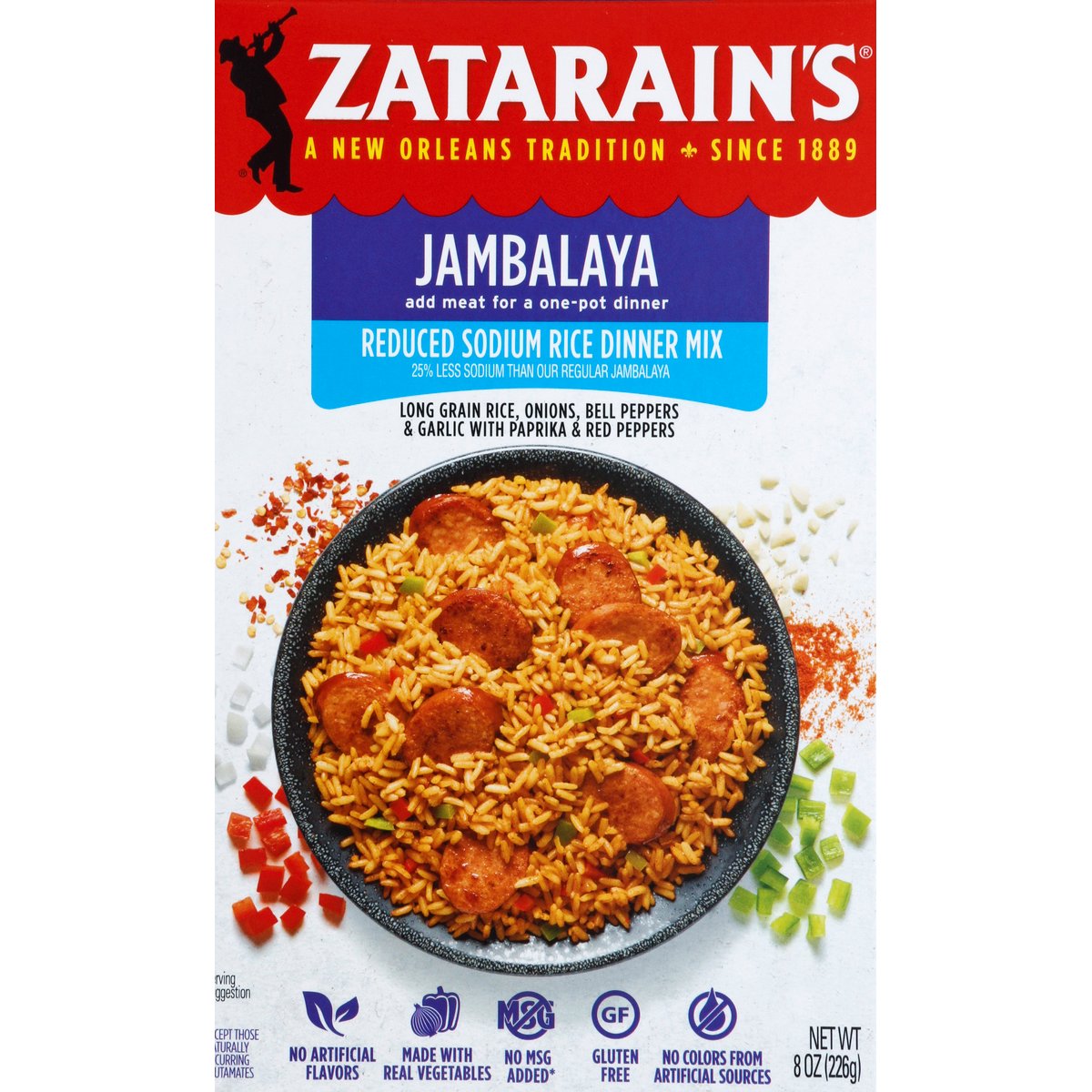 Add meat for a one-pot dinner. A New Orleans tradition since 1889. 25% less sodium than our regular jambalaya. Long grain rice, onions, bell peppers & garlic with paprika & red peppers. No artificial flavors. Made with real vegetables. No MSG added (except those naturally occurring glutamates). Gluten free. No colors from artificial sources. Creole Jambalaya was born in New Orleans in the 18th century when Spanish settlers tried to recreate their beloved paella using Louisiana ingredients. Today it's a local staple, common from music festivals to Mardi Gras parties to quiet weeknight meals. Zatarain's Kitchen Tips & Tricks: Veggify: Add 1 medium tomato, chopped or 1 can (14.5 oz) diced tomatoes, undrained, 1 cup cooked corn or 1 cup broccoli florets. Quick and Easy: Try using rotisserie chicken. Homemade: Try browning the sausage first. Visit zatarains.com for more fresh, bold recipe ideas. Zatarain's has been the leader in authentic New Orleans style food since 1889. So when you want great flavor, jazz it up with Zatarain's! Love our mixes? Give us a call and let us know! 1-877-837-3796. Facebook. Follow the Zatarain's tradition on Facebook! This product contains 300 mg of sodium; our regular Jambalaya rice mix contains 440 mg sodium per serving.