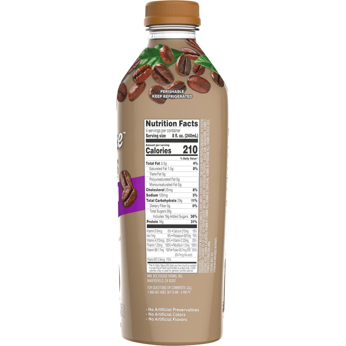 No artificial flavors. Protein Plus (Per 8 fl. oz. Serving Comparison: This product - 16 g protein/our perfectly Protein beverages - 7 g protein). 5 B vitamins (From milk and added ingredients). 120% more protein than our perfectly protein beverages (Per 8 fl. oz. Serving Comparison: This product - 16 g protein/our perfectly Protein beverages - 7 g protein). No artificial preservatives. No artificial colors. 100 years of farming have made us big believers in cultivating more so we fill every bottle with loads of thoughtful ingredients carefully crafted into delicious blends that taste as good as they feel. Fresh arabica coffee plus B Vitamins for energy meet our special blend of extra-creamy protein for a supremely delish way to fuel your day. Full of swoon-worthy indulgence that fuels you. Flash pasteurized and cold-filled for quality. Find use on social (at)bolthousefarms. For questions or comments call 1-800-467-4683, M-F 8 AM - 4 PM PT.