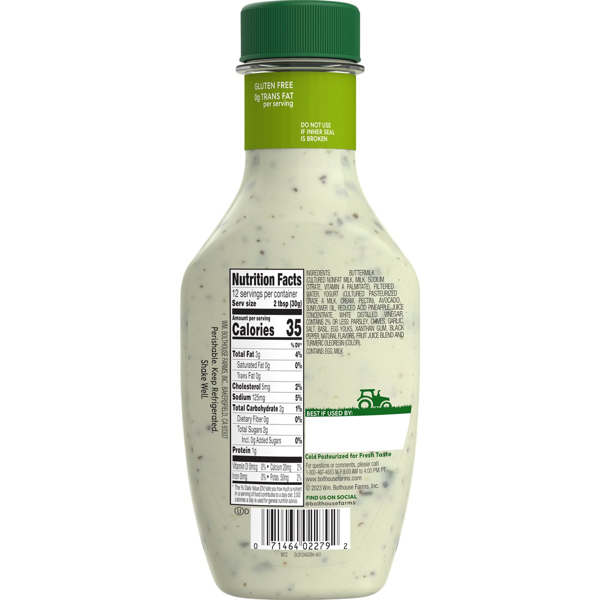 No artificial flavors. 35 calories per serving. 0 g trans fat per serving. Gluten free. No artificial preservatives. Cold pasteurized for fresh taste. www.bolthousefarms.com. Find us on social (at)bolthousefarms. For questions or comments, please call 1-800-467-4683. M-F 8:00 AM - 4:00 PM PT.