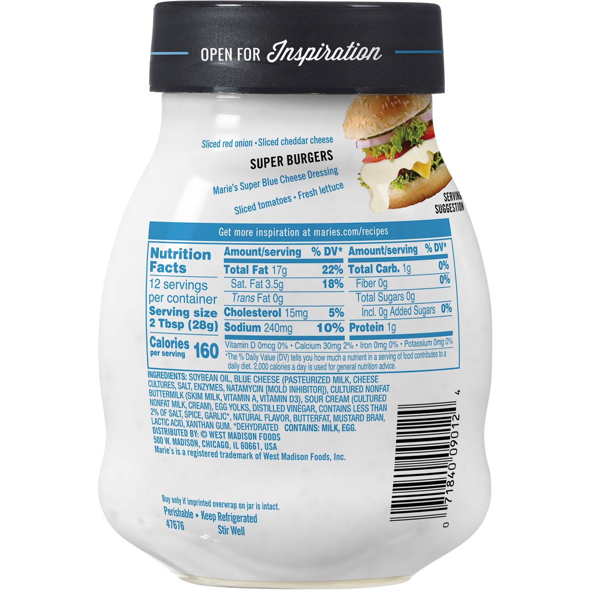 Gluten-free. Open for inspiration. Sliced red onion. Sliced cheddar cheese. Super burgers. Marie's super blue cheese dressing. Sliced tomatoes. Fresh lettuce. how2recyle.info. Get more inspiration at Facebook.com/MariesDressing. Questions or comments, call 1-800-339-1051.