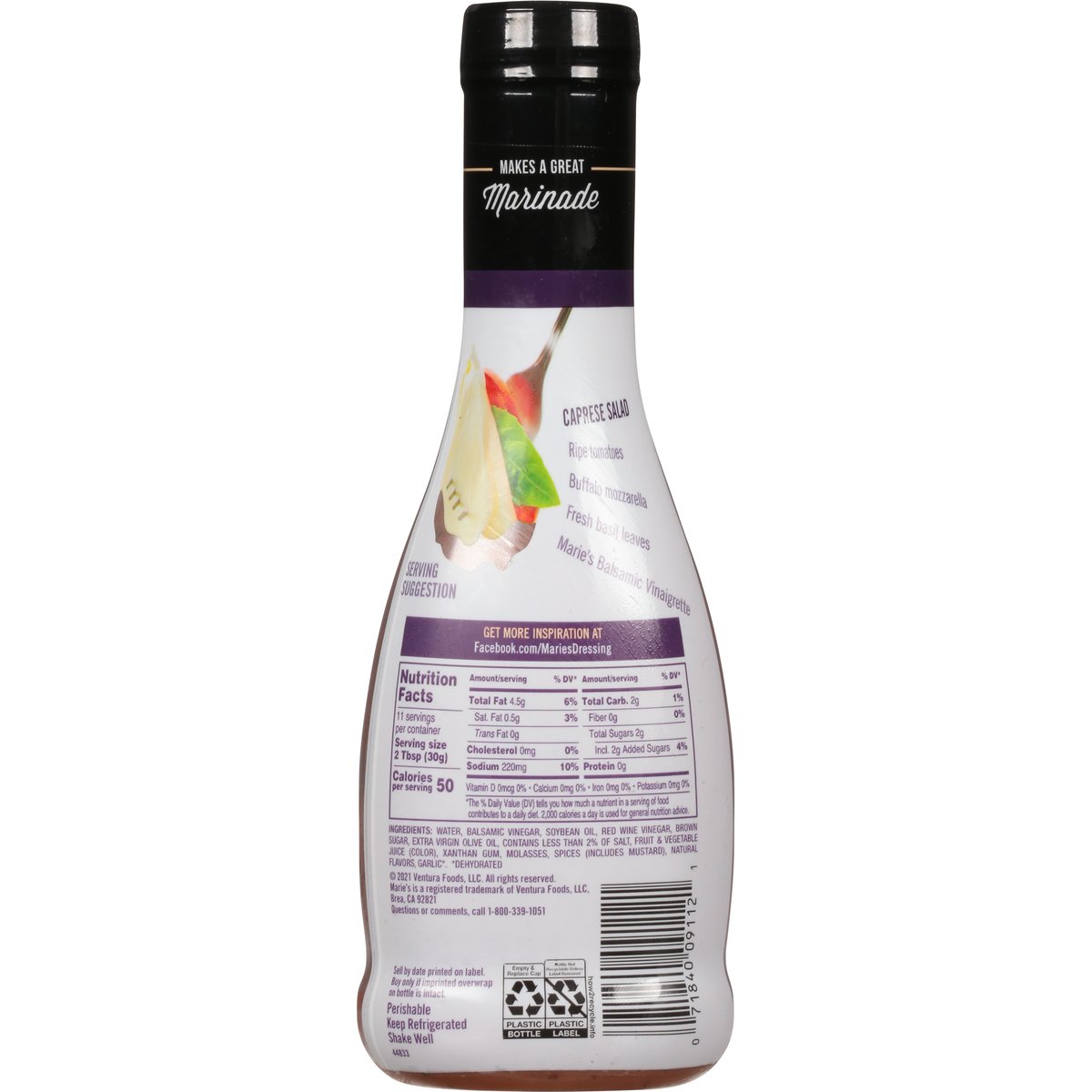 Gluten-free. Makes a great marinade. Caprese Salad: Ripe tomatoes, buffalo mozzarella, fresh basil leaves, Marie's balsamic vinaigrette. how2recycle.info. Get more inspiration at facebook.com/mariesdressing. Questions or comments, call 1-800-339-1051