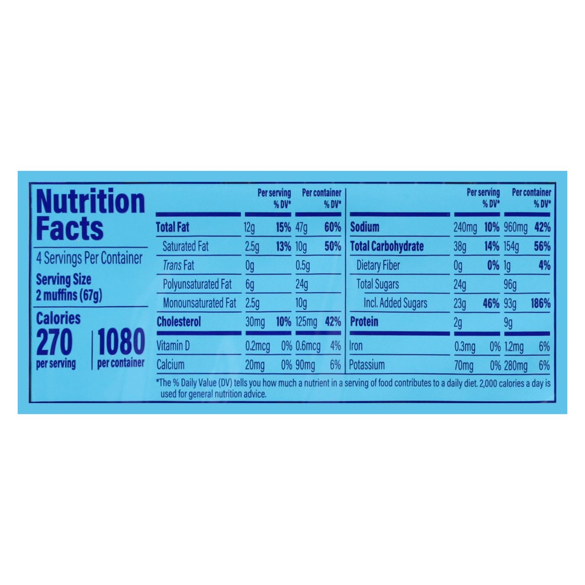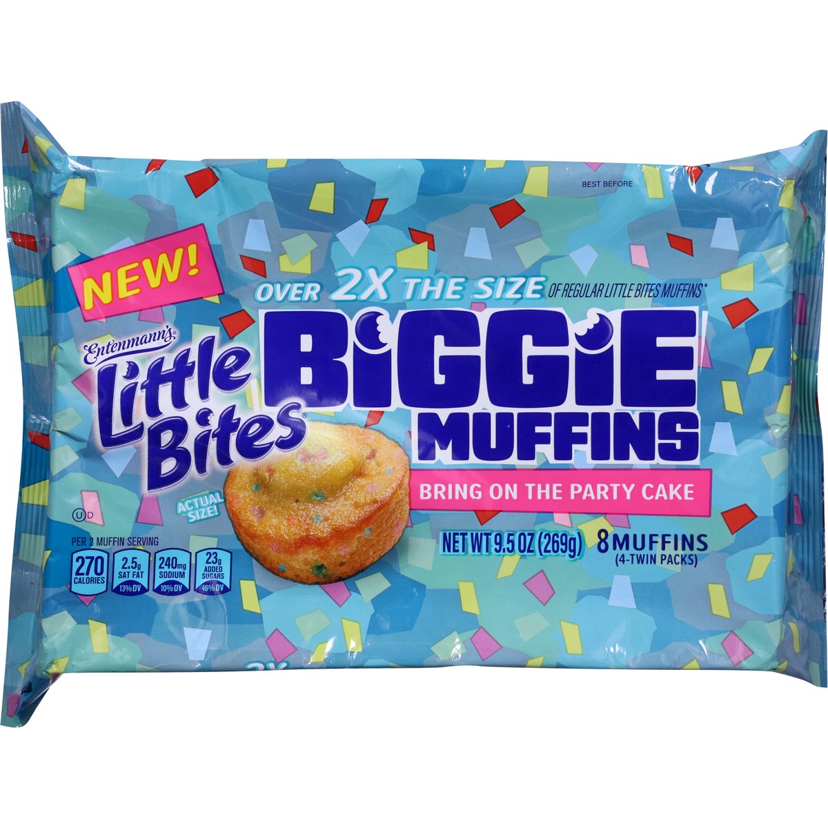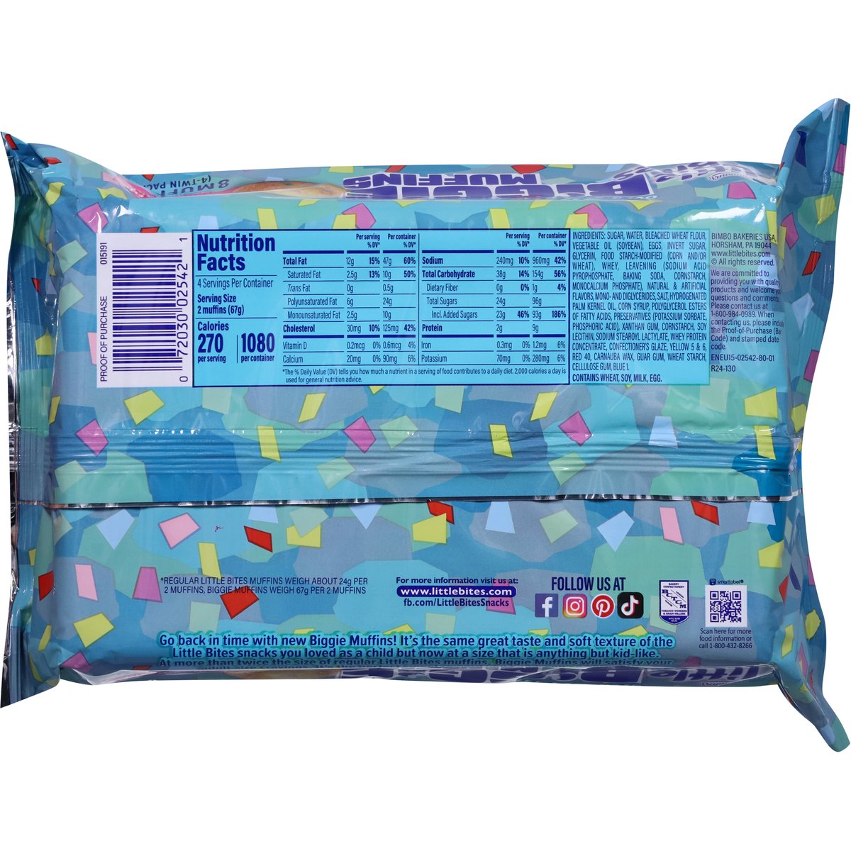 Per 2 Muffin Serving: 270 calories; 2.5 g sat fat (13% DV); 240 mg sodium (10% DV); 23 g added sugars (46% DV). New! Over 2x the size of regular Little Bites Muffins*. Bring on the party cake. Go back in time with new Biggie Muffins! It's the same great taste and soft texture of the Little Bites snacks you loved as a child but now at a size that is anything but kid-like. At more than twice the size of regular Little Bites muffins, Biggie Muffins will satisfy your adult-size cravings. It's the perfect sweet reward you know you've earned! * Regular Little Bites Muffins weigh about 24 g per 2 muffins, Biggie Muffins weigh 67g per 2 muffins. www.littlebites.com. fb.com/LittleBitesSnacks. Follow us at Facebook. Instagram. Pinterest. TikTok. SmartLabel: Scan for more food information or call 1-800-432-8266. We are committed to providing you with quality products and welcome your questions and comments. Please contact us at 1-800-984-0989. When contacting us, please include the Proof-of-Purchase (Bar Code) and stamped date code. For more information visit us at: www.littlebites.com BCTGM: Bakery Confectionery Tobacco Workers & Grain Millers union made. AFL CIO CLC.